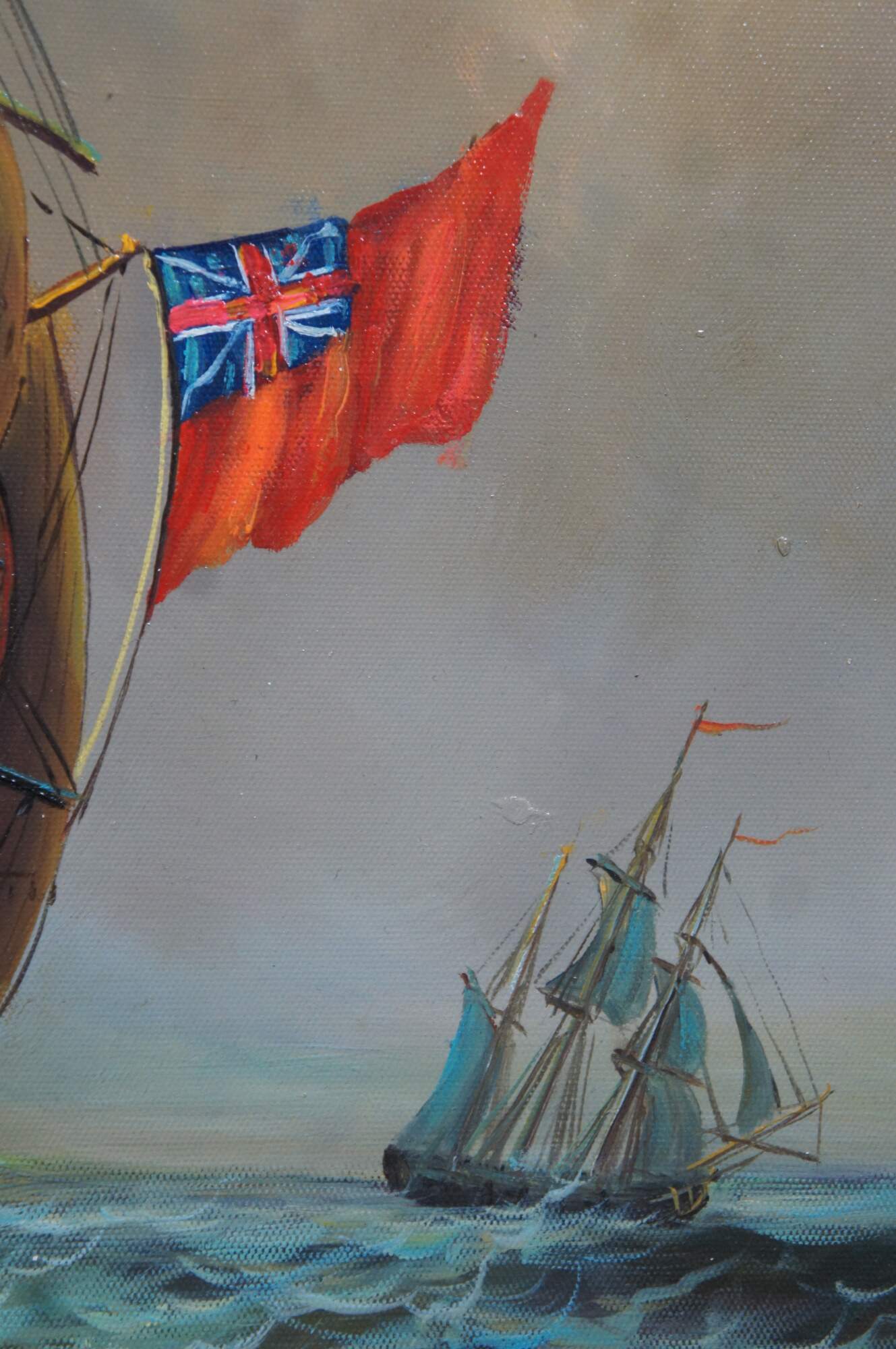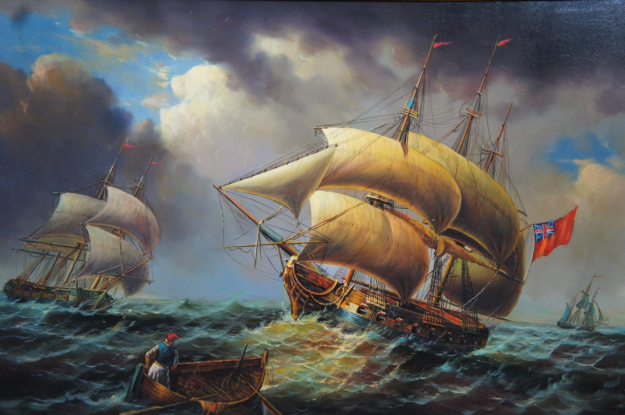 A large and impressive nautical maritime seascape oil painting on canvas depicting The Action of 21 April 1806, After Pierre-Julien Gilbert. The painting showcases a choppy ocean battle scene with a British & French Galleon. Features an ornate baroque gold high relief frame with Neoclassical designs of scrolled acanthus, fleur de lis and shell and cartouche.