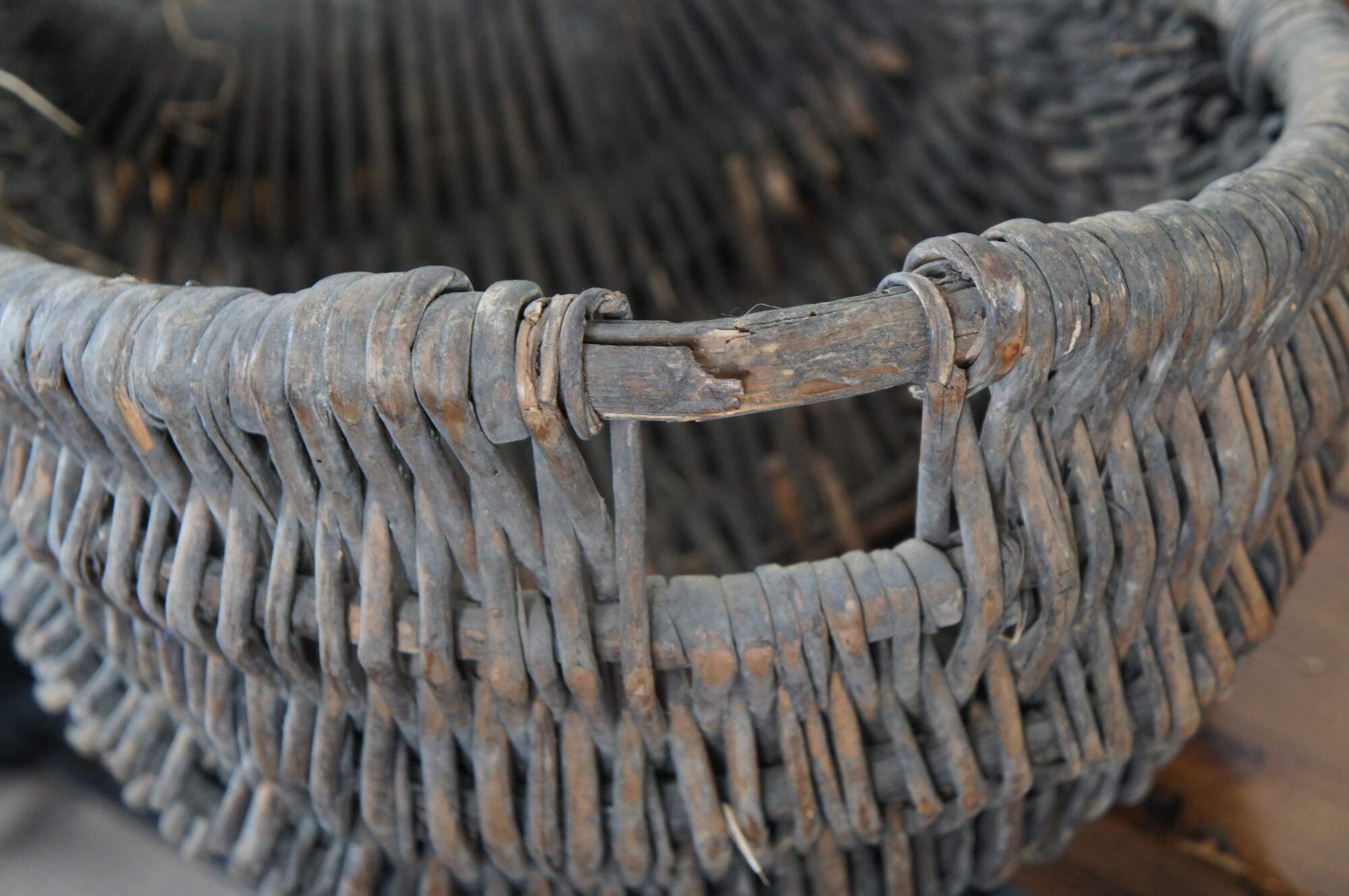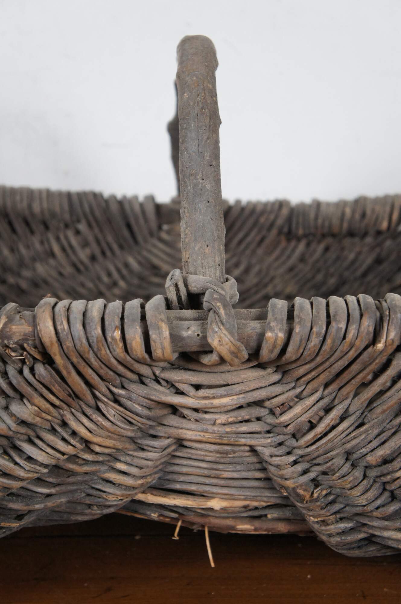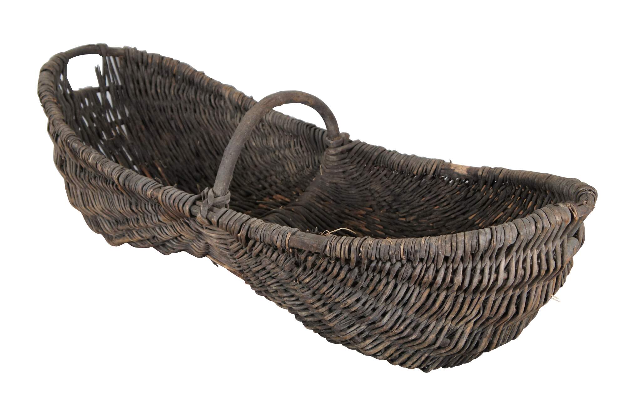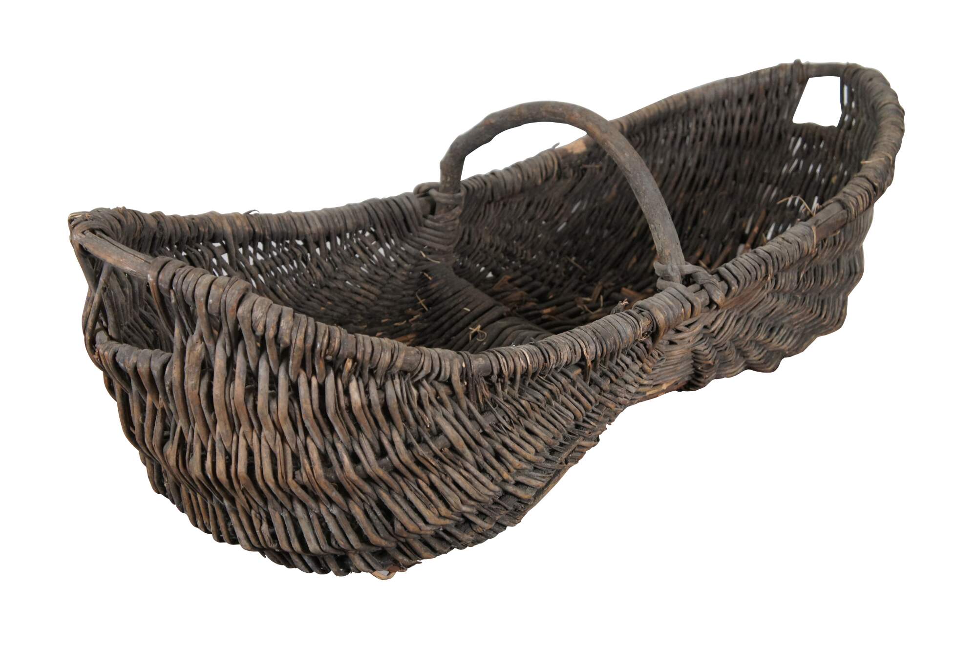 Large and impressive antique grape / wine harvest buttocks basket. Created in the Burgundy region of France circa 19th century, the unique basket made of handwoven wicker is oval in form and features a wooden frame with handle across the top.
