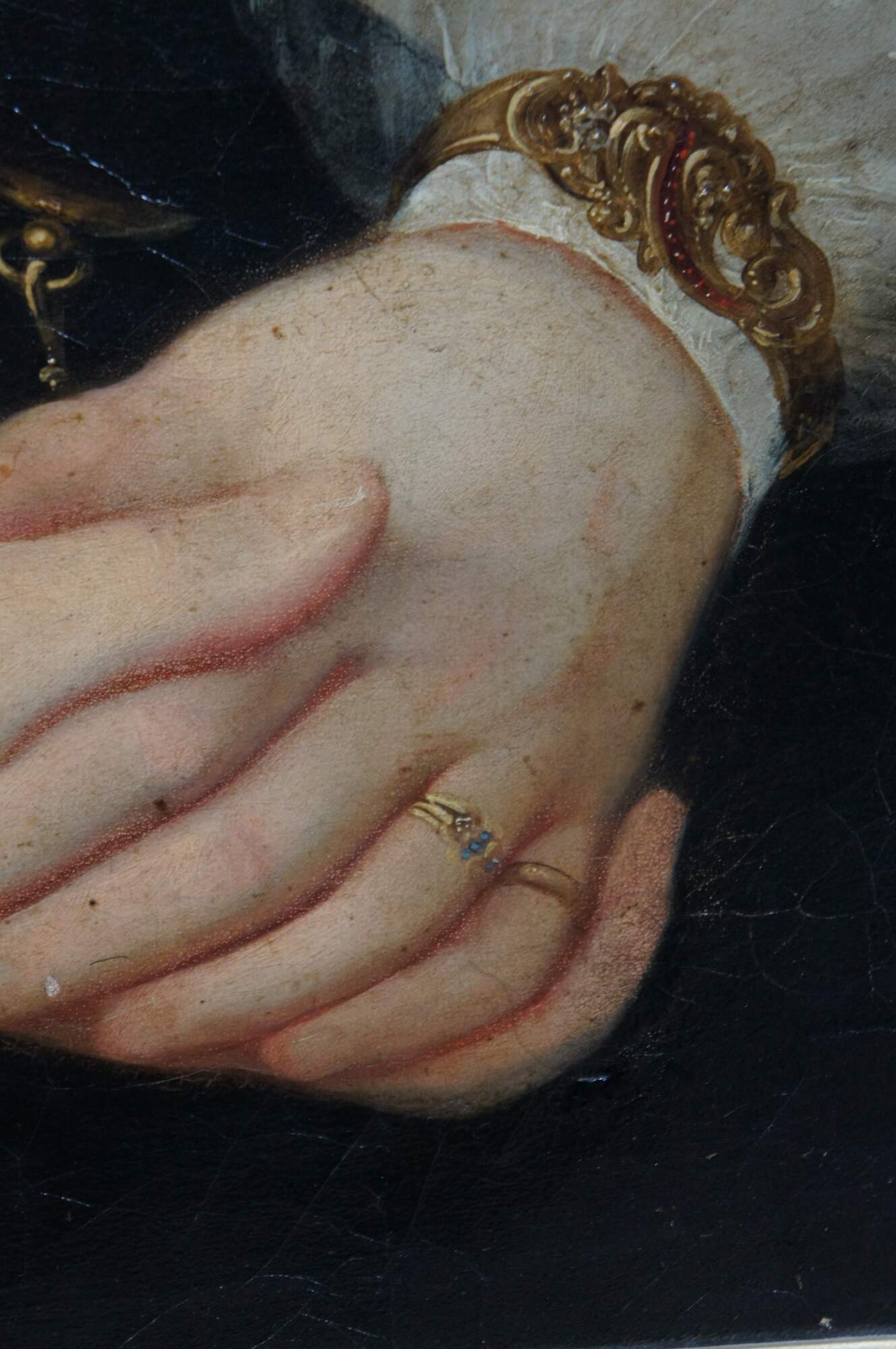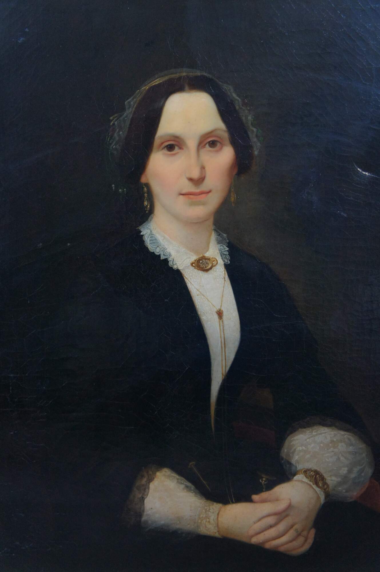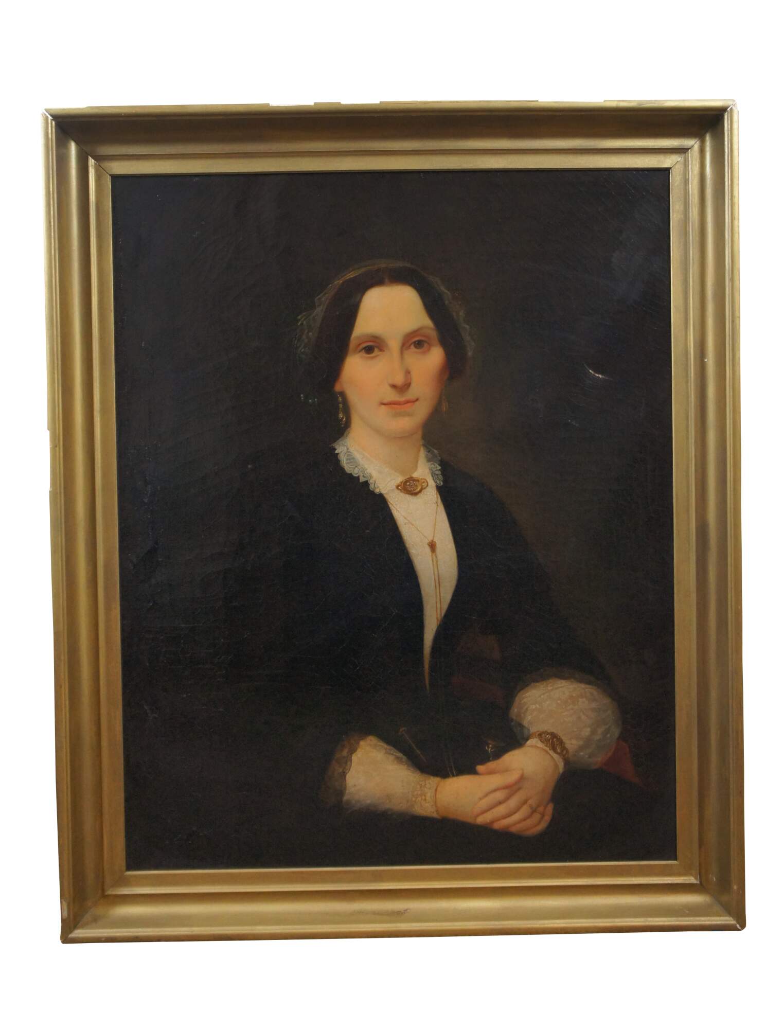 Antique pair of 19th century American School Folk Art oil painting. Features a man and woman (husband and wife) in formal Victorian attire. The man holds a document, while the woman sits delicately with her hands cupped, displaying her Art Nouveau jewelry, encrusted with turquois, rubies and diamonds. Framed in gold.