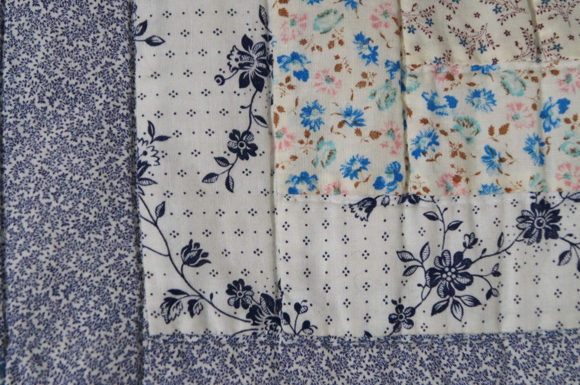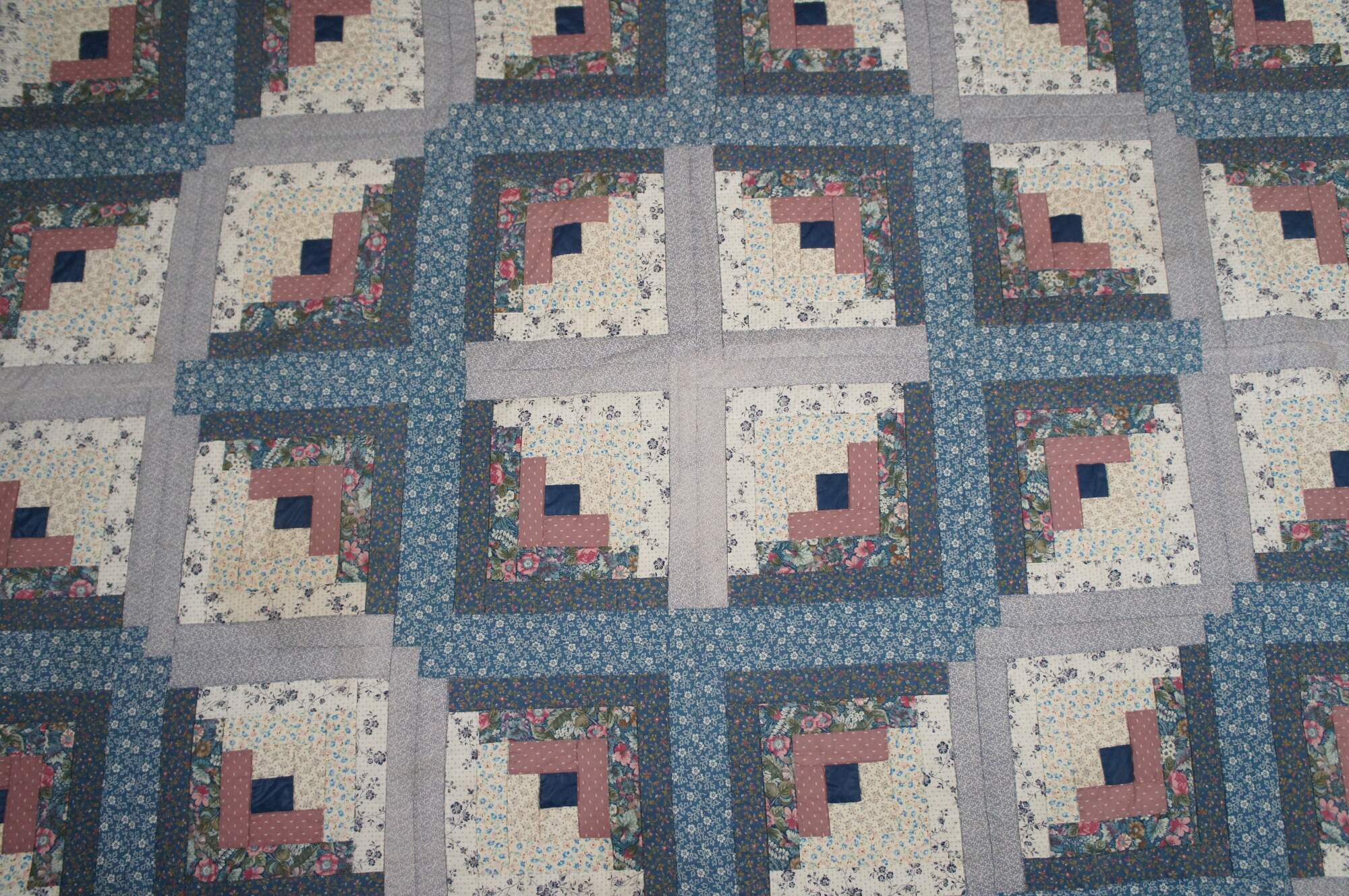 Vintage hand stitched quilt, blanket or bedspread featuring the traditional Log Cabin geometric design with squares, crosses and floral motifs. Full to queen size.