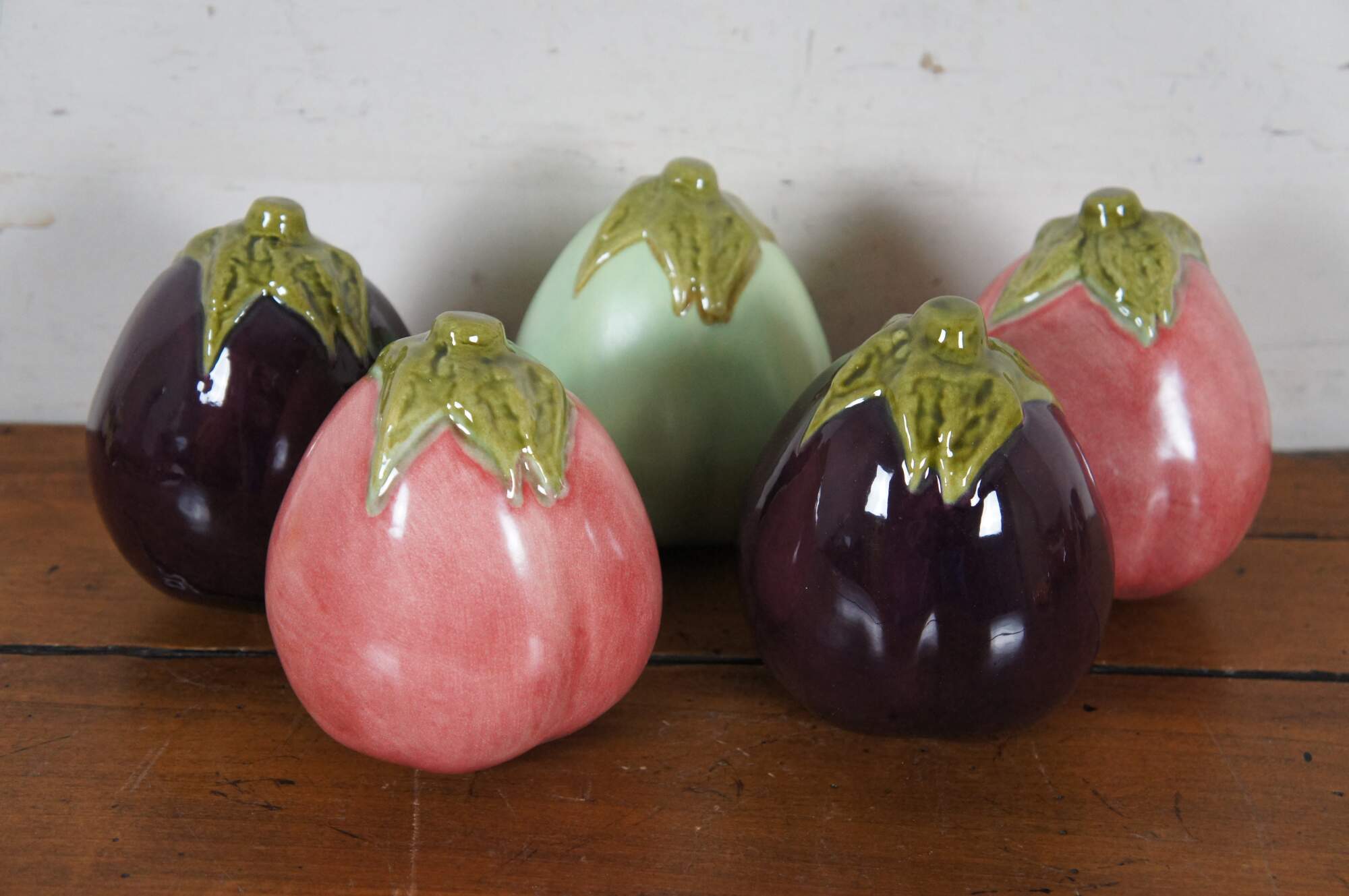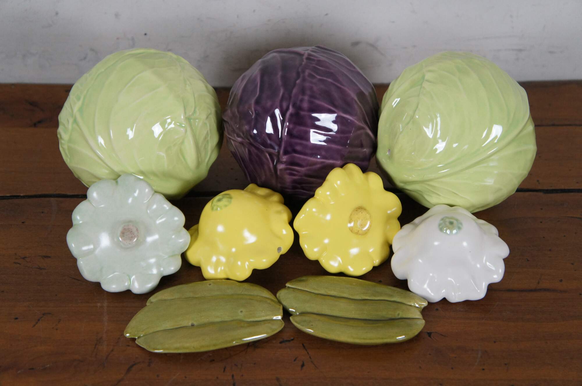 Large vintage sixty four piece porcelain Majolica vegetable / fruit Cornucopia / Thanksgiving centerpiece display lot. Features onions, cucumbers, avocados, potatoes, zucchinis, plums, lettuce, cabbage, pumpkins, green beans, corn, tomatoes, cauliflower, squash, green peppers, asparagus, carrots, snap peas, artichokes and more.