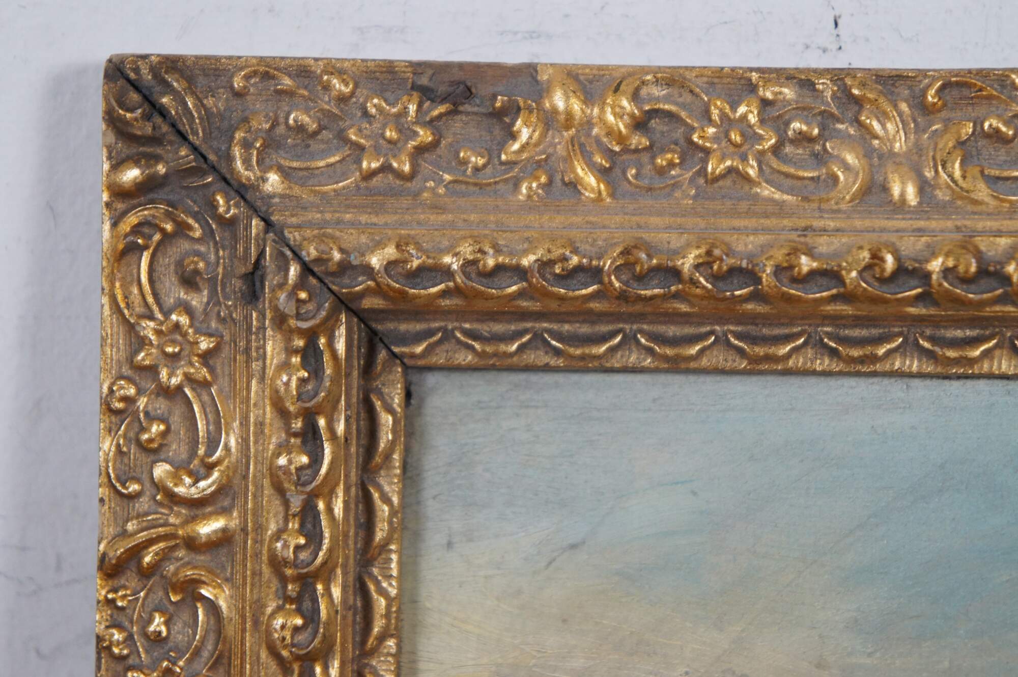 Antique coastal landscape / seascape oil painting on board featuring a group of birds flying over calm water with mountains lining the horizon. Framed in ornate baroque gold with floral motif. Signed lower left.