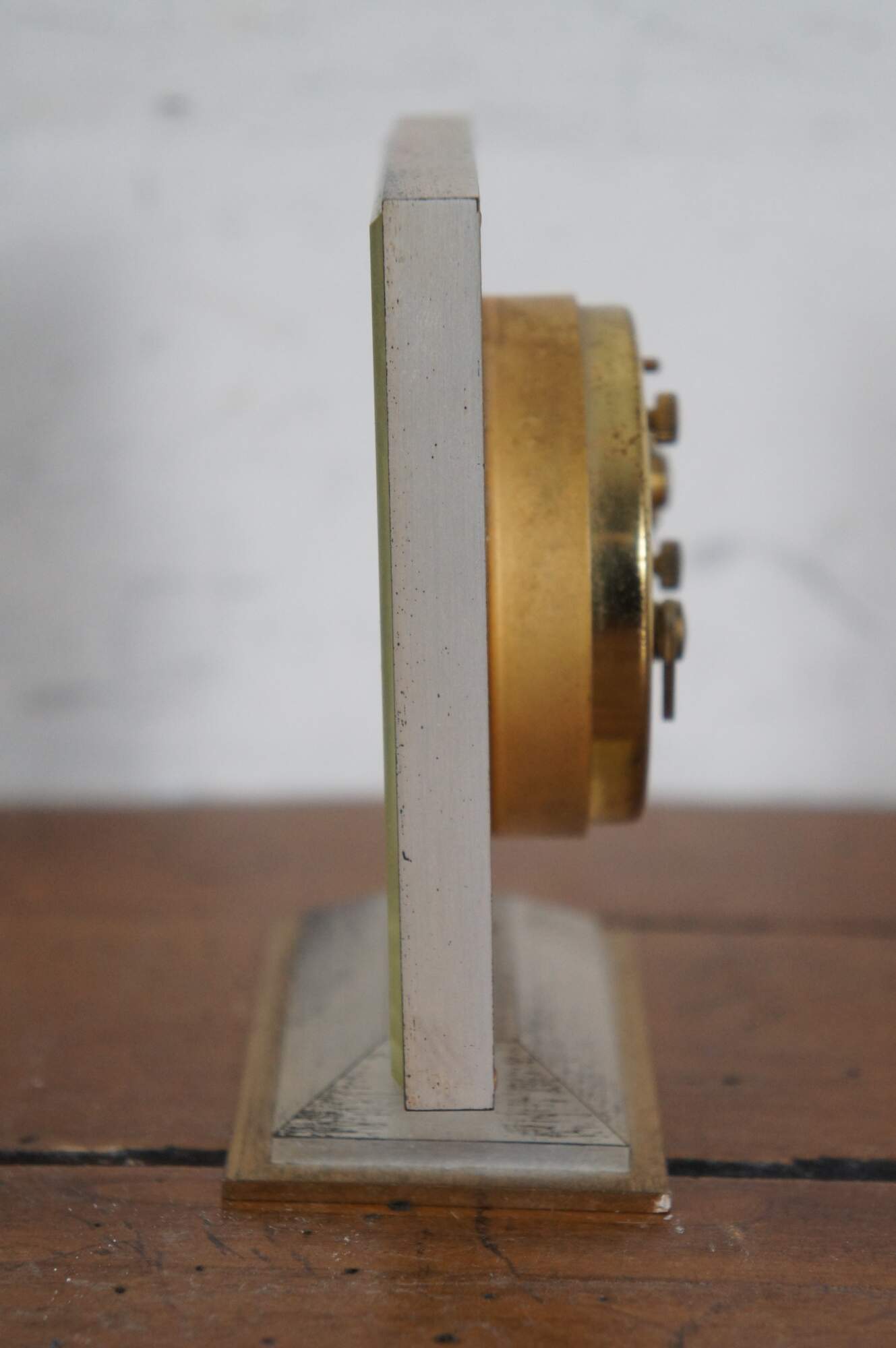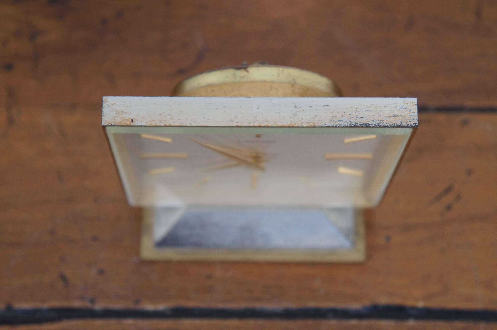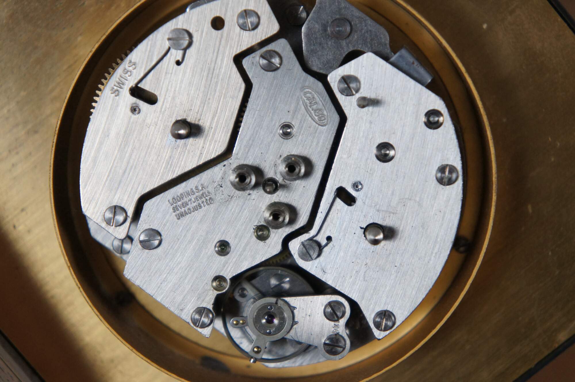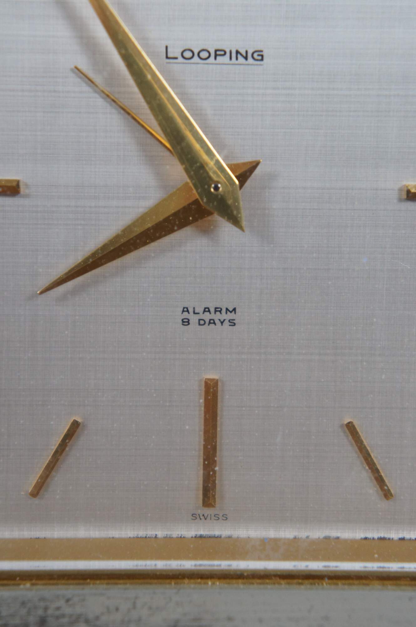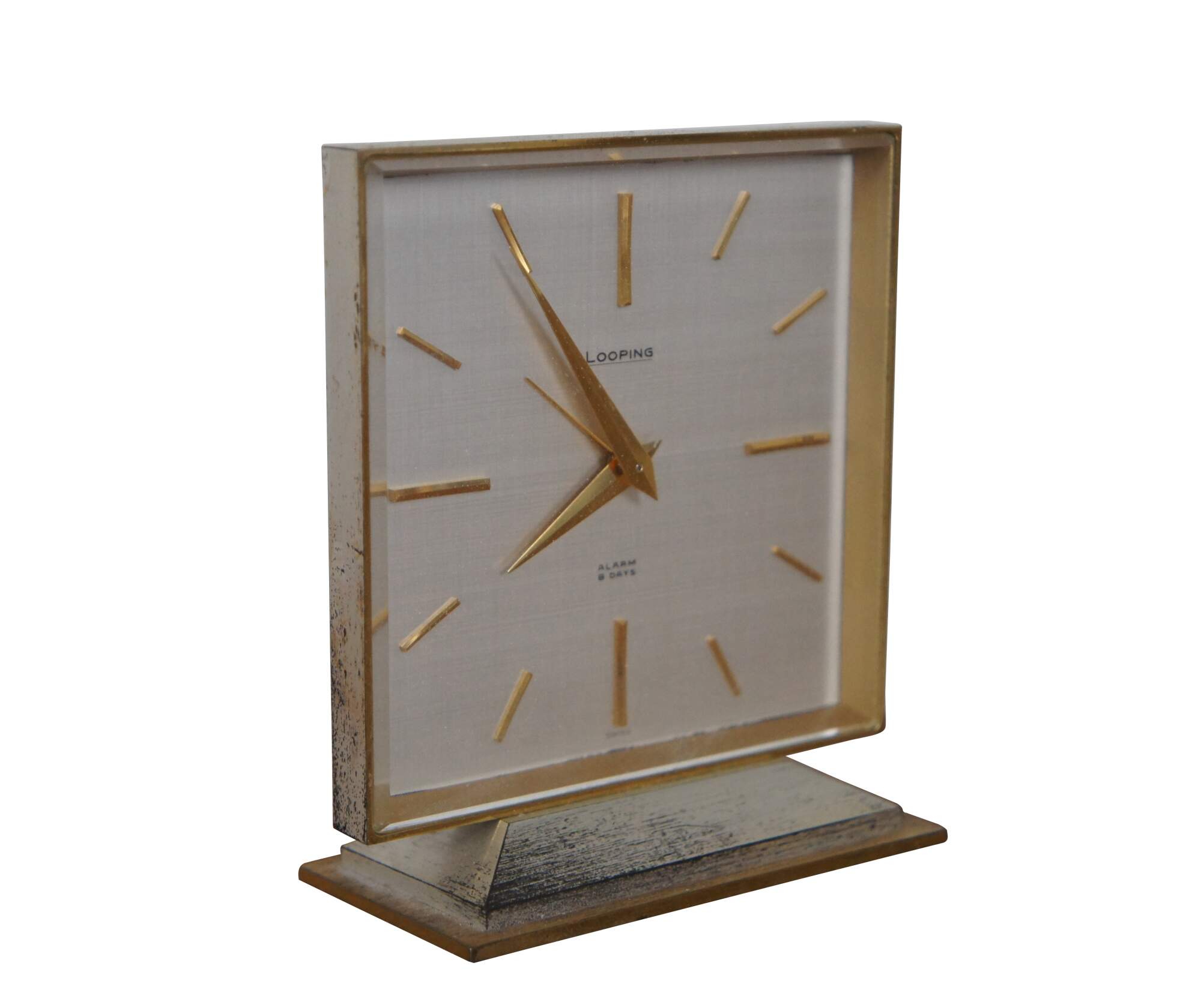Mid century Looping Swiss 8 day alarm clock featuring 7 jewel movement and gilded brass case with glass. Circa 1950s.