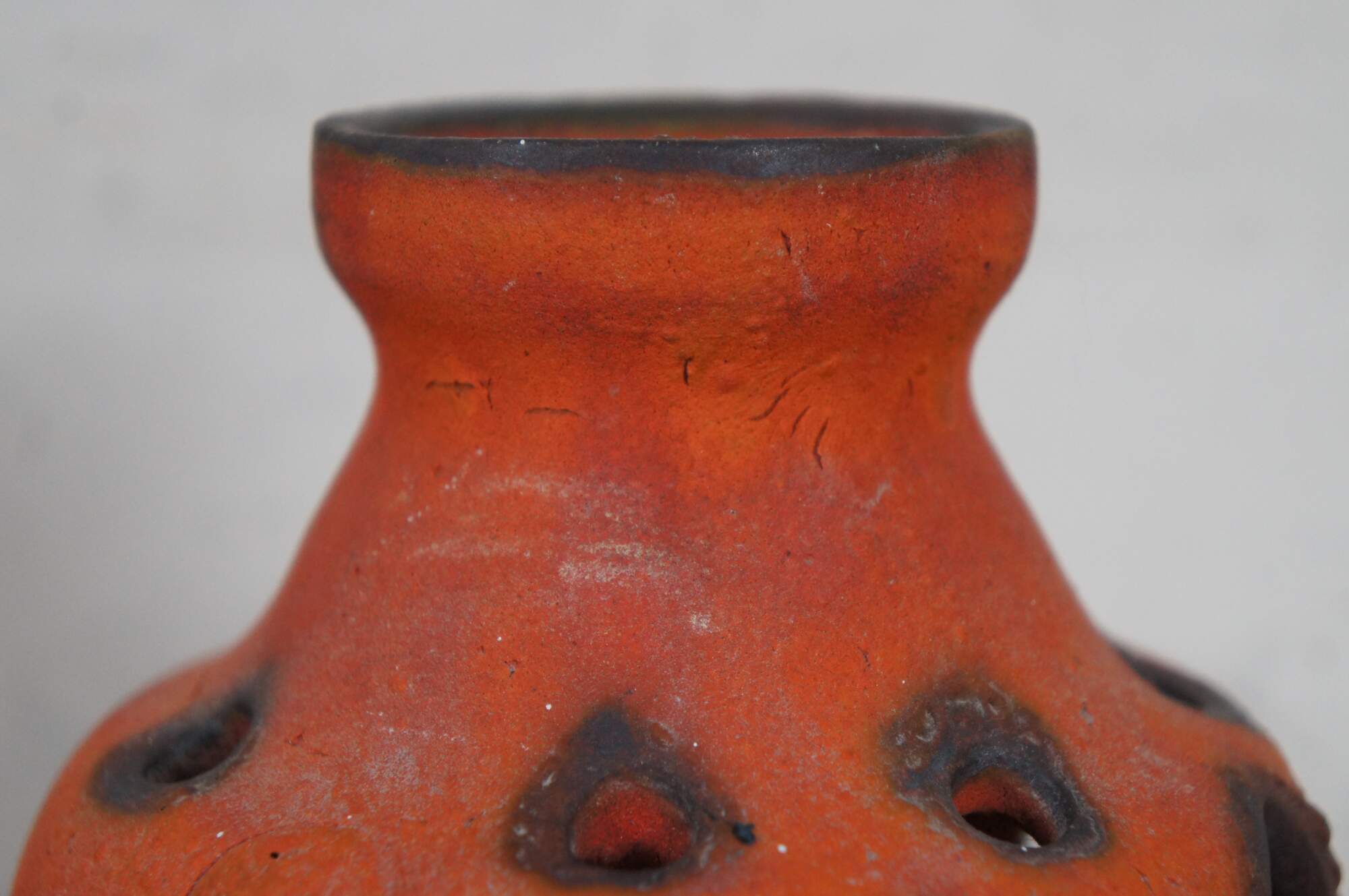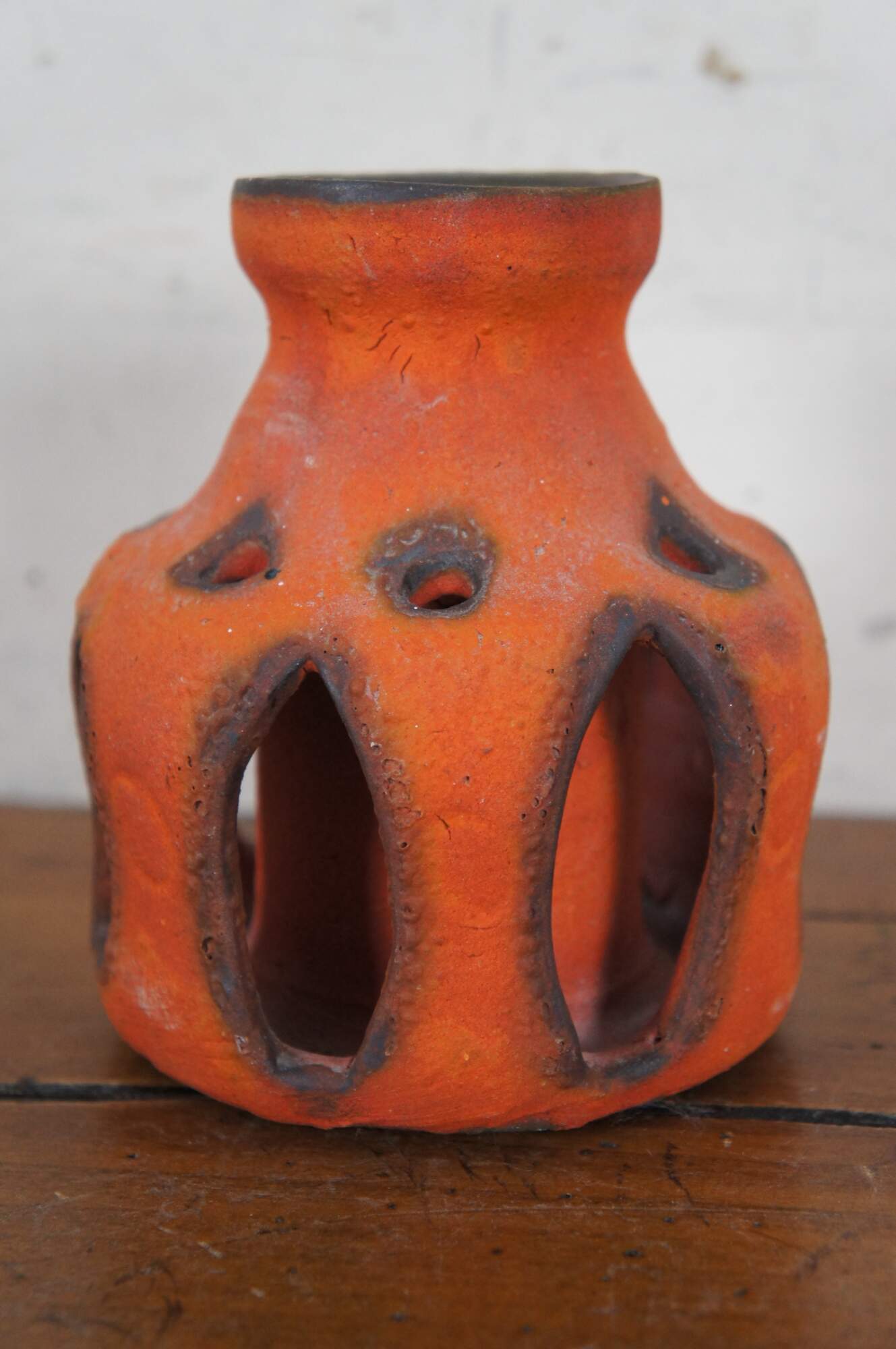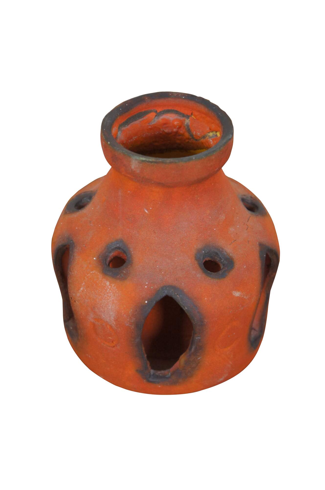 Vintage Israeli earthenware art pottery vessel or bud vase featuring reticulated / pierced / open design in the form of a votive. Purchased on Ben Yehuda Street 17. Weta.