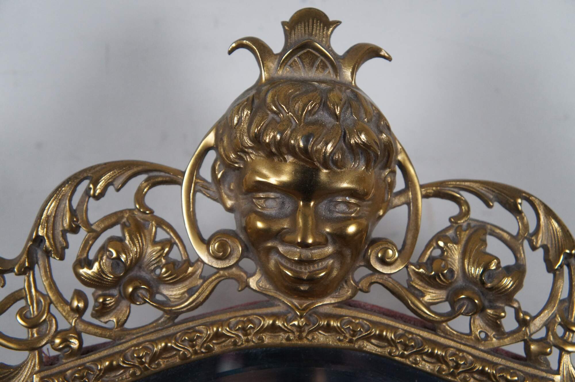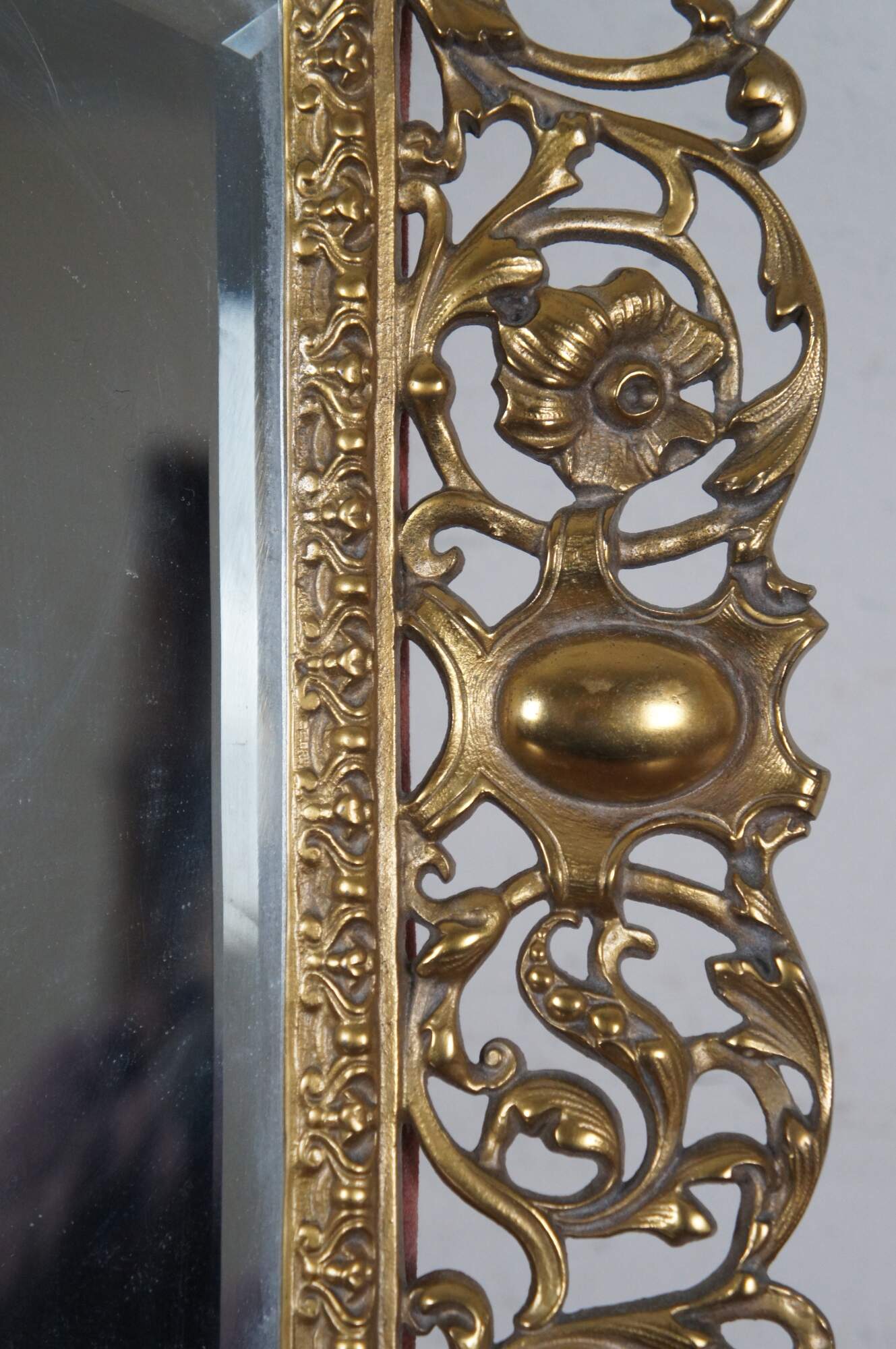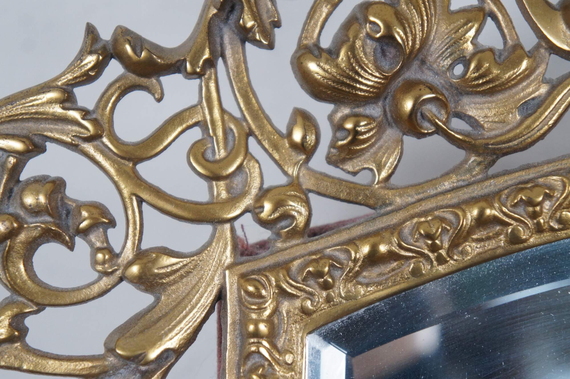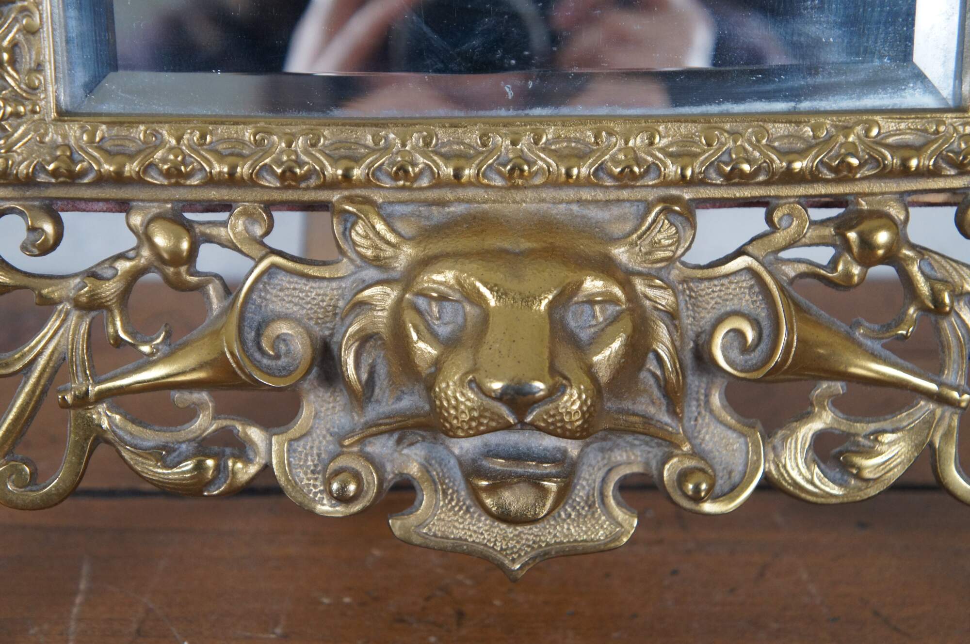 A large and heavy antique Victorian tabletop or wall hanging beveled vanity mirror. Made of gilded cast iron featuring reticulated or pierced baroque / rococo style with floral acanthus swags, trumpets, and Lion and Cherub heads.