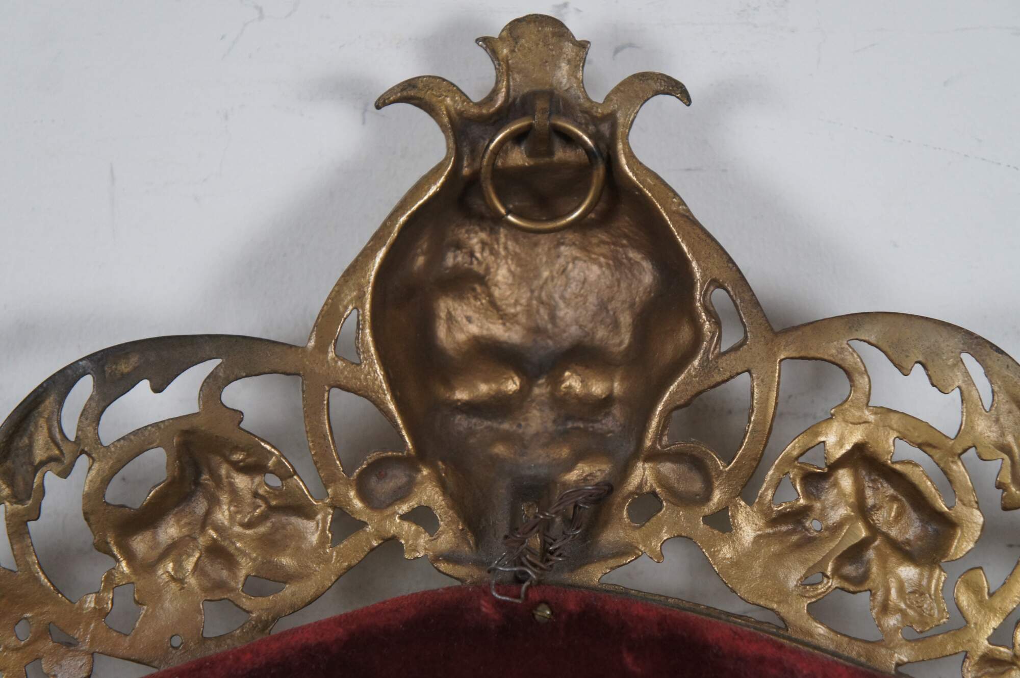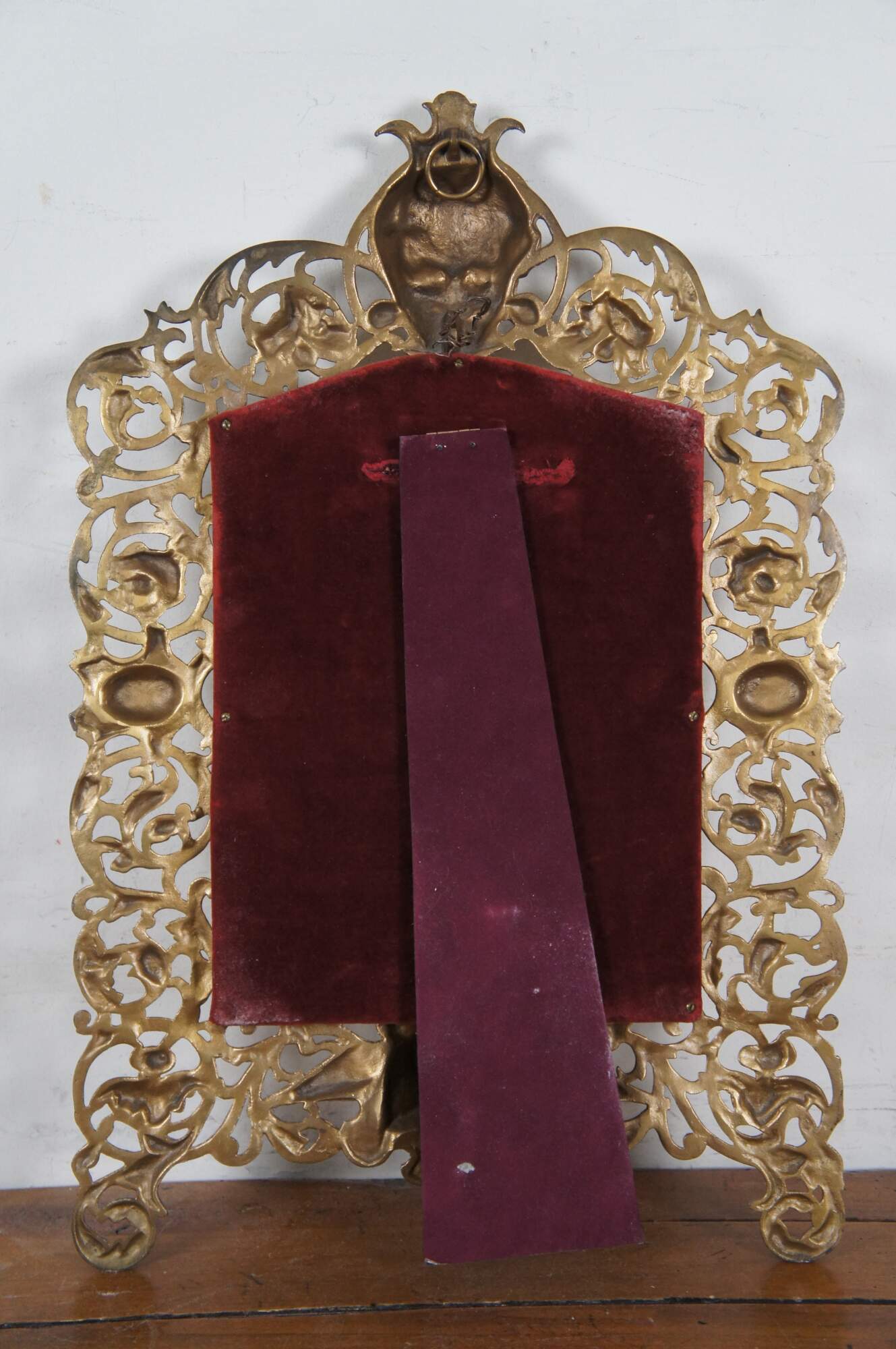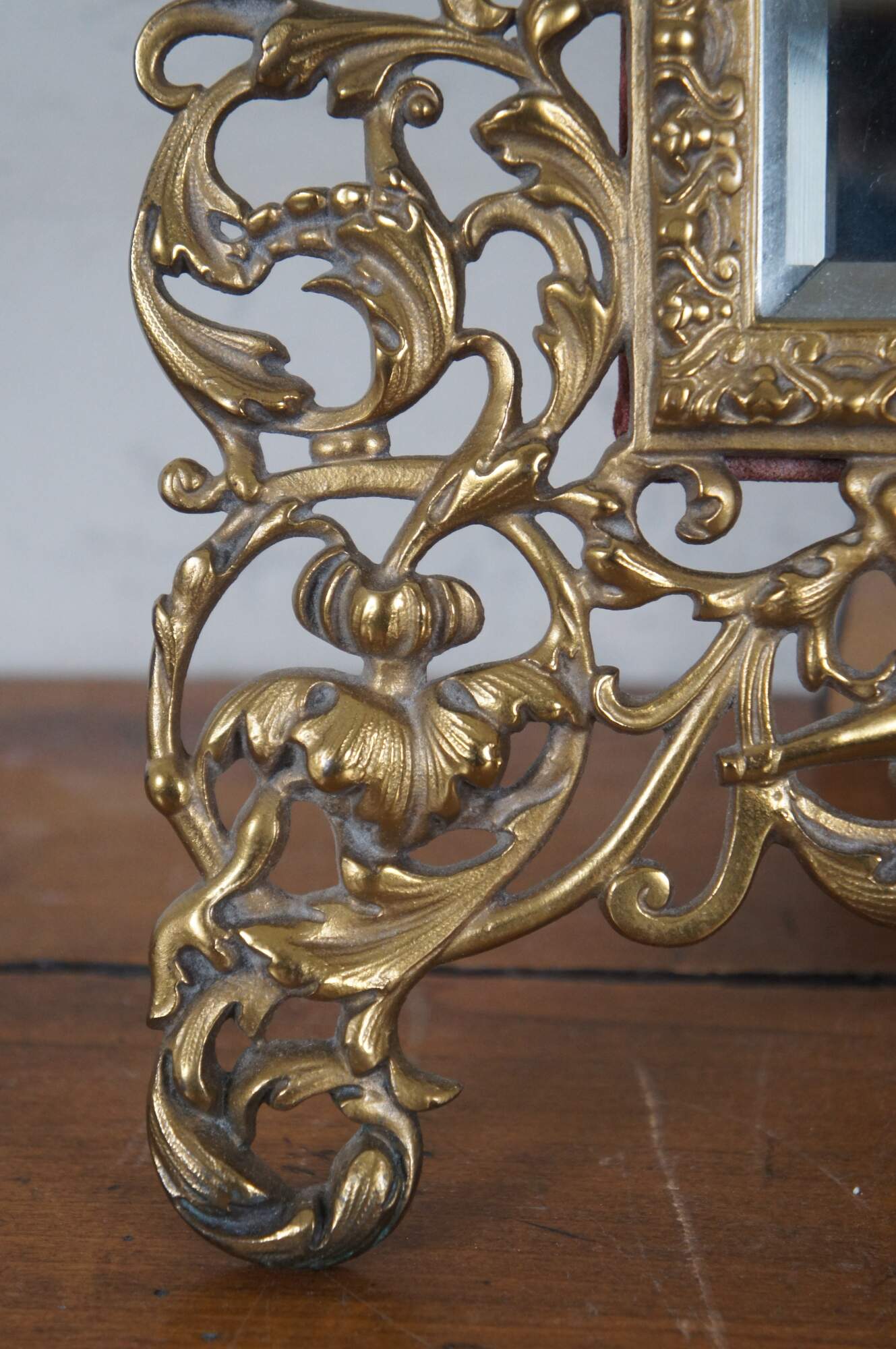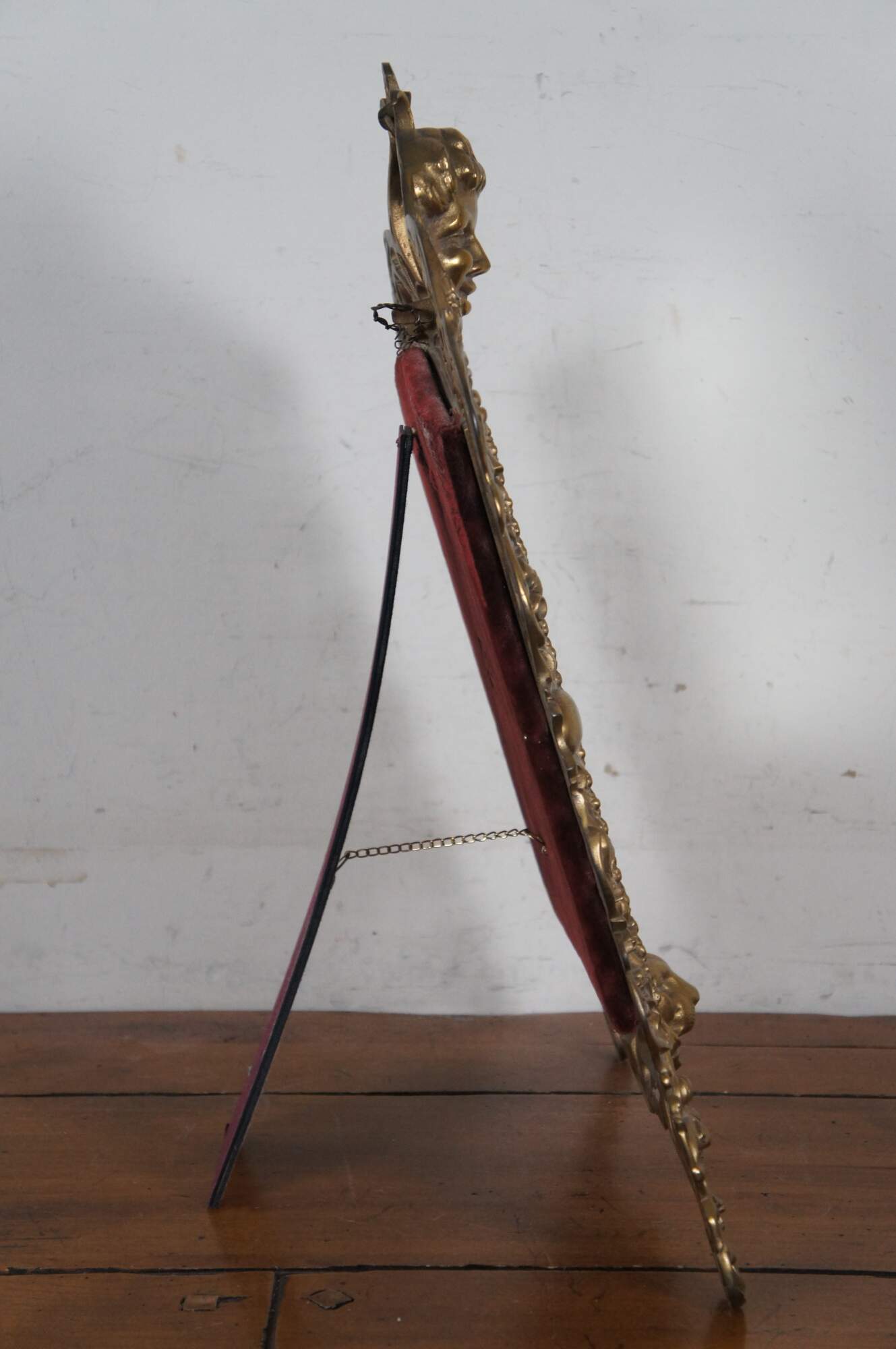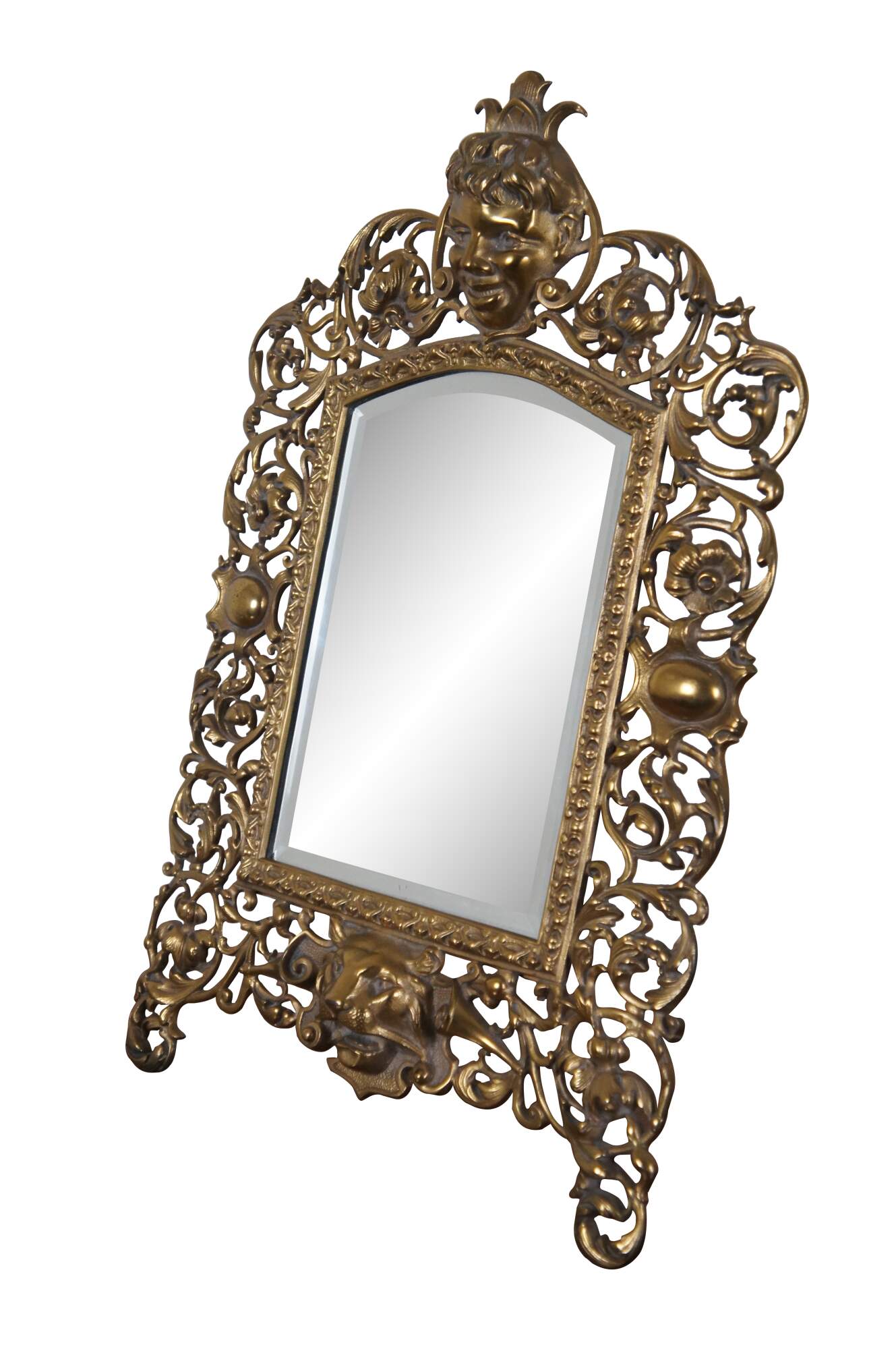 A large and heavy antique Victorian tabletop or wall hanging beveled vanity mirror. Made of gilded cast iron featuring reticulated or pierced baroque / rococo style with floral acanthus swags, trumpets, and Lion and Cherub heads.