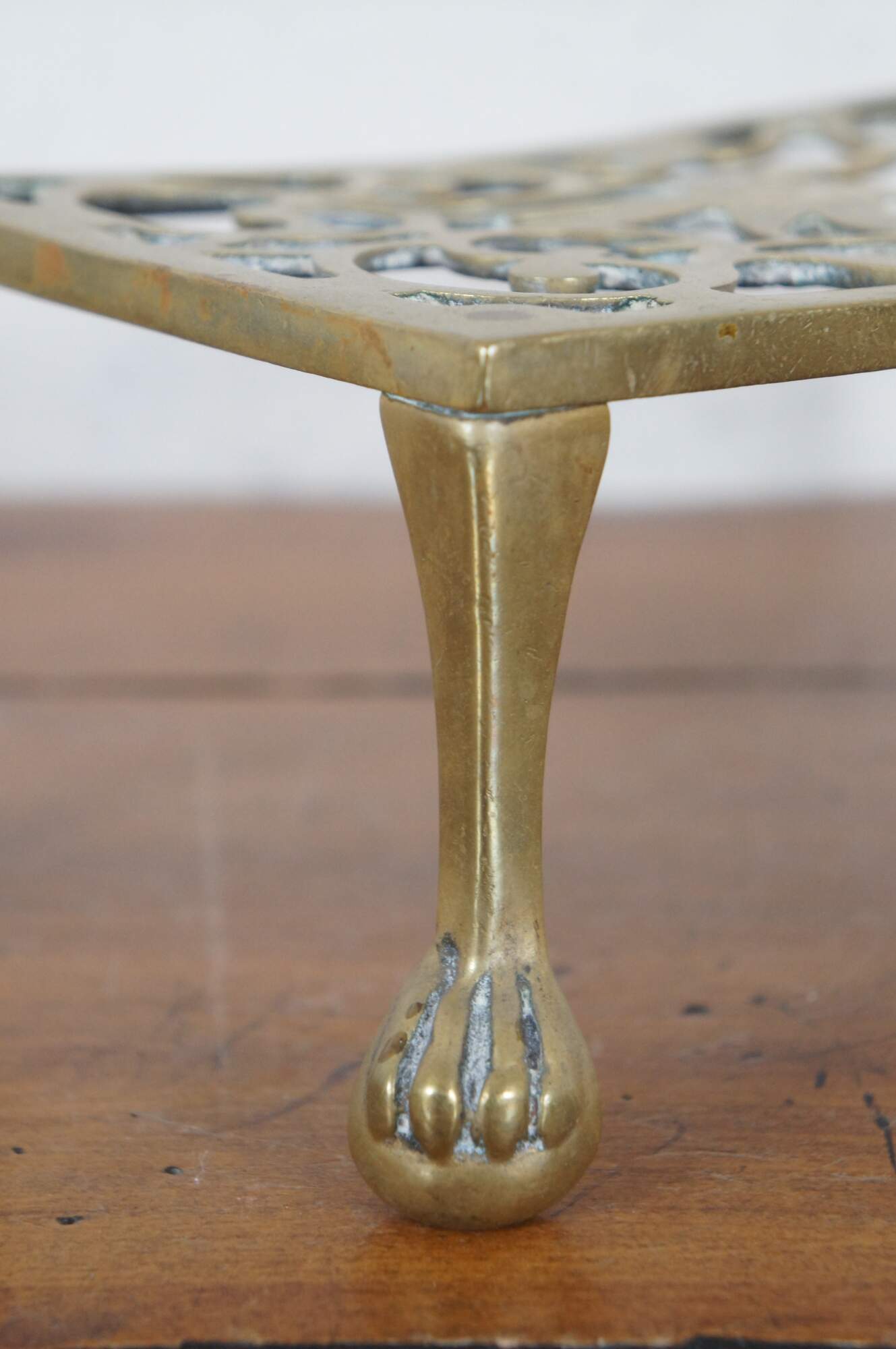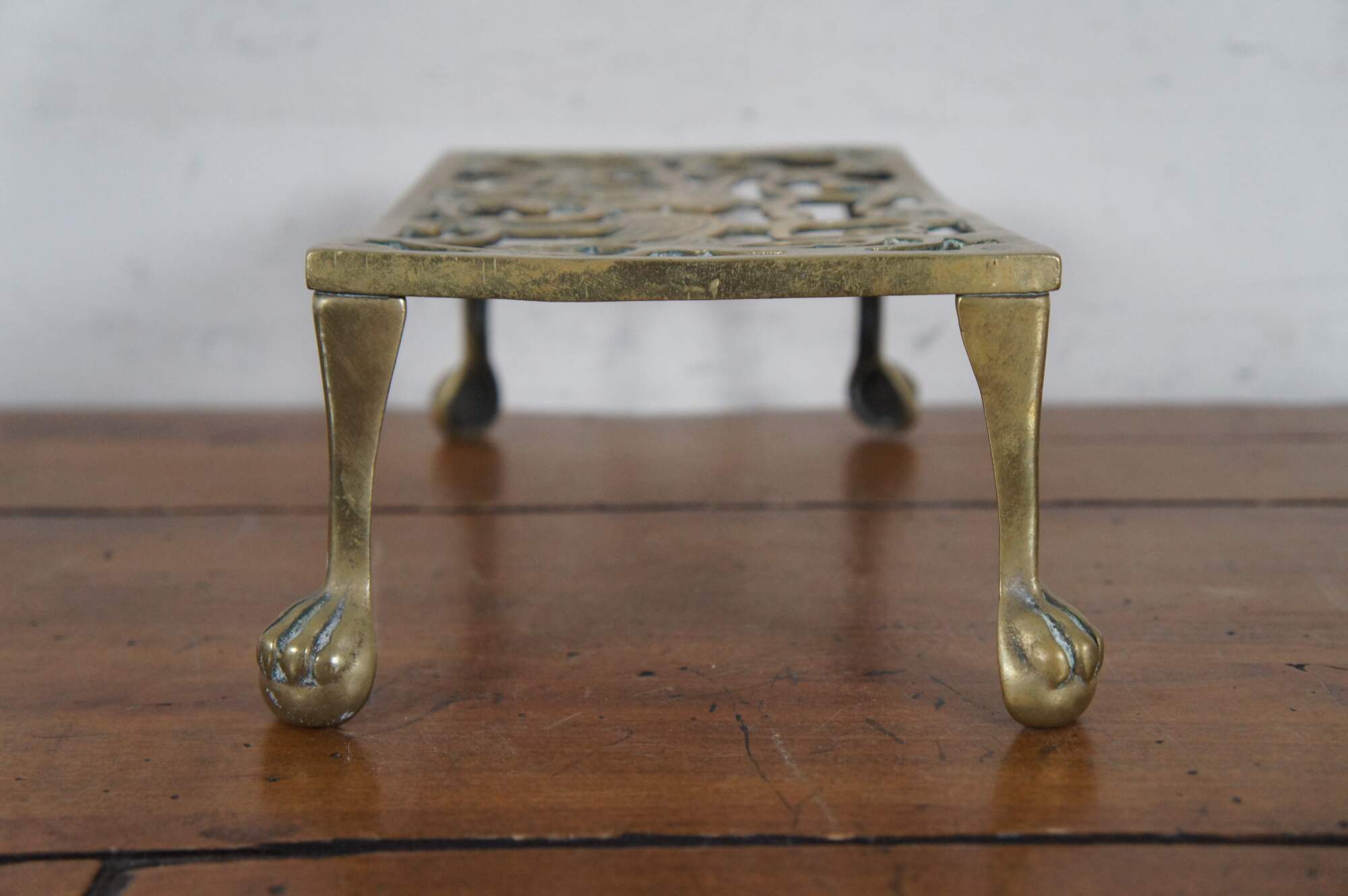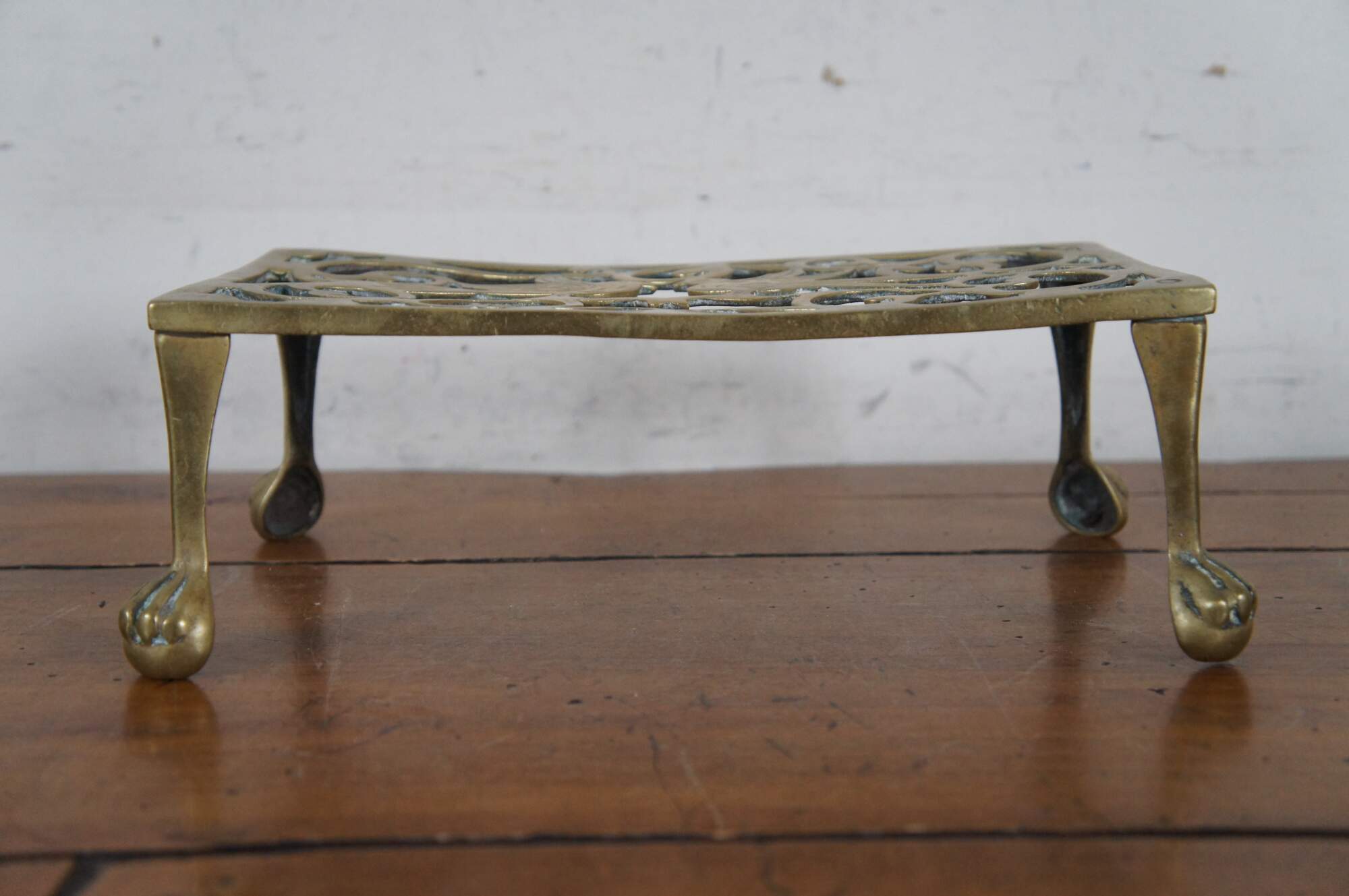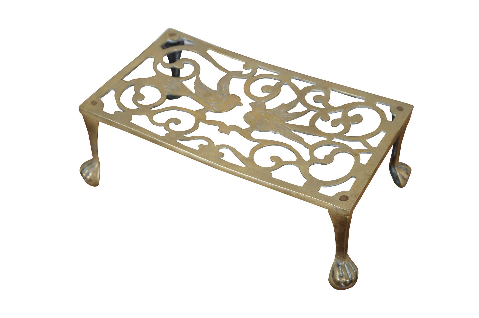 Antique brass farmhouse fireplace footman / warmer / trivet / stool / plant stand / kettle rest featuring pierced reticulated design of birds with ball and claw feet.