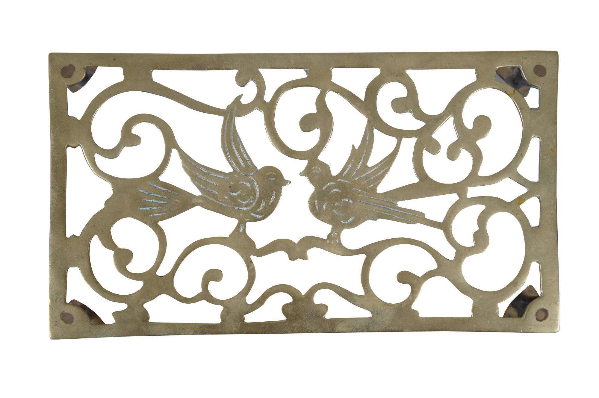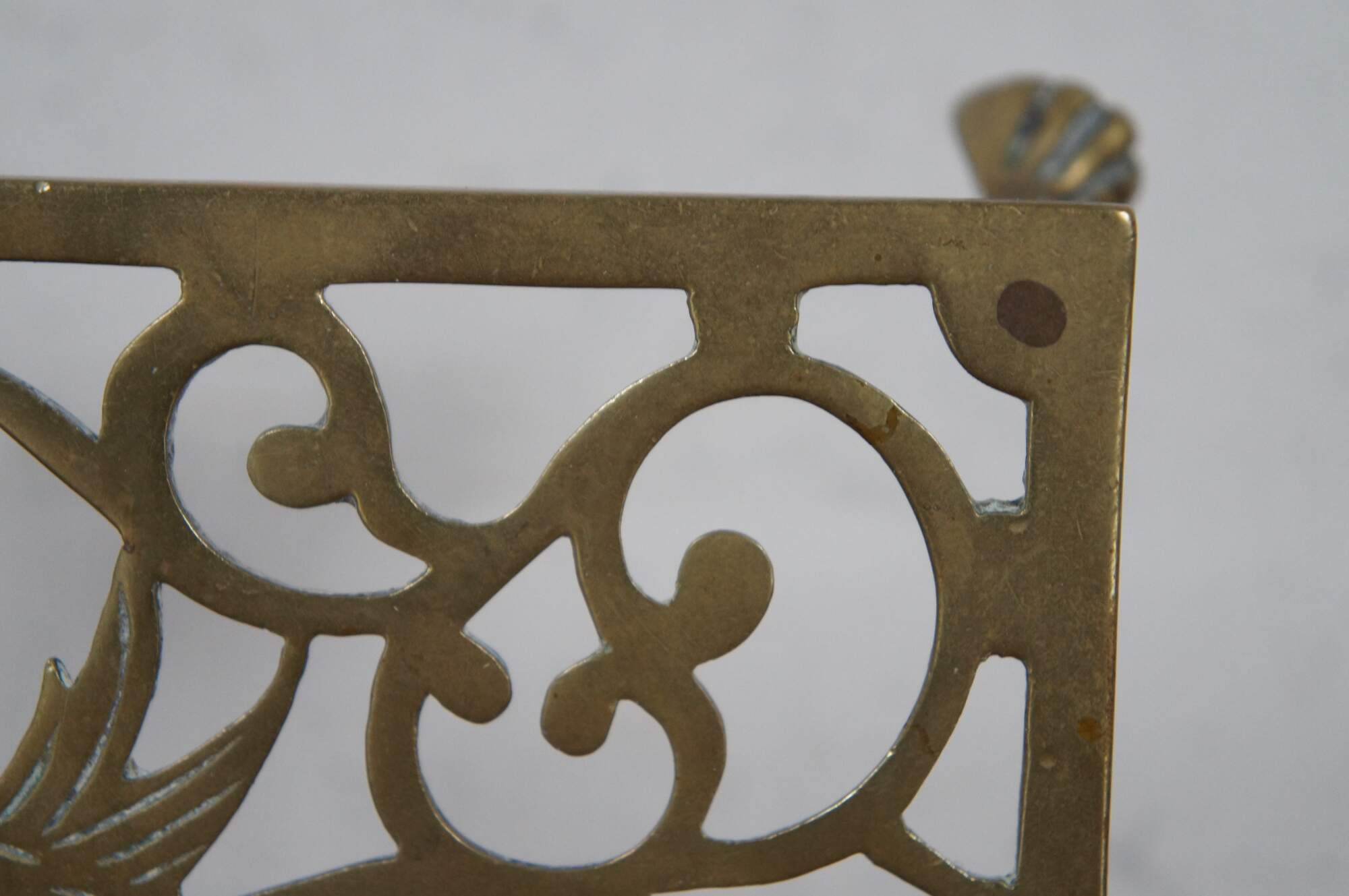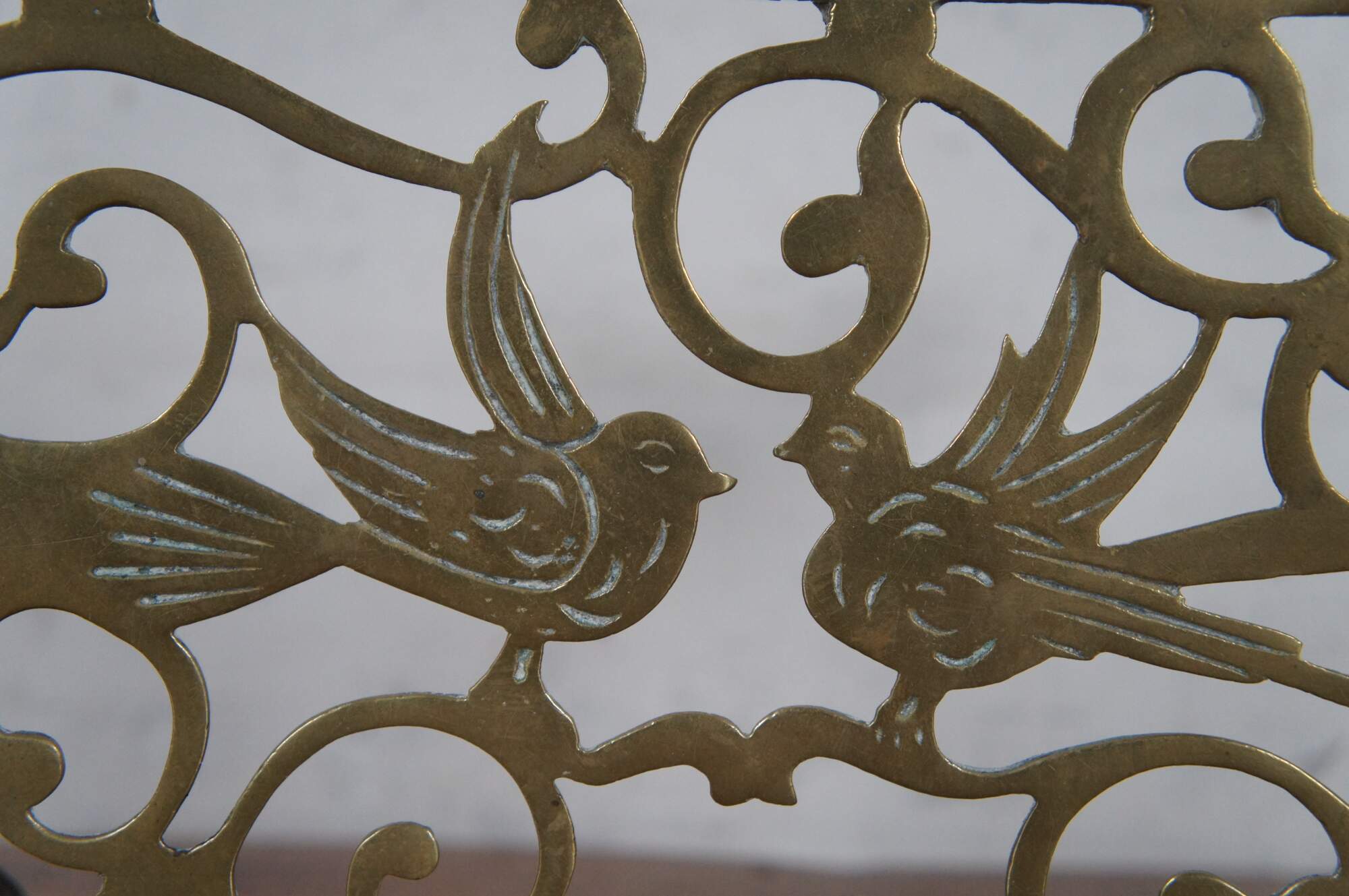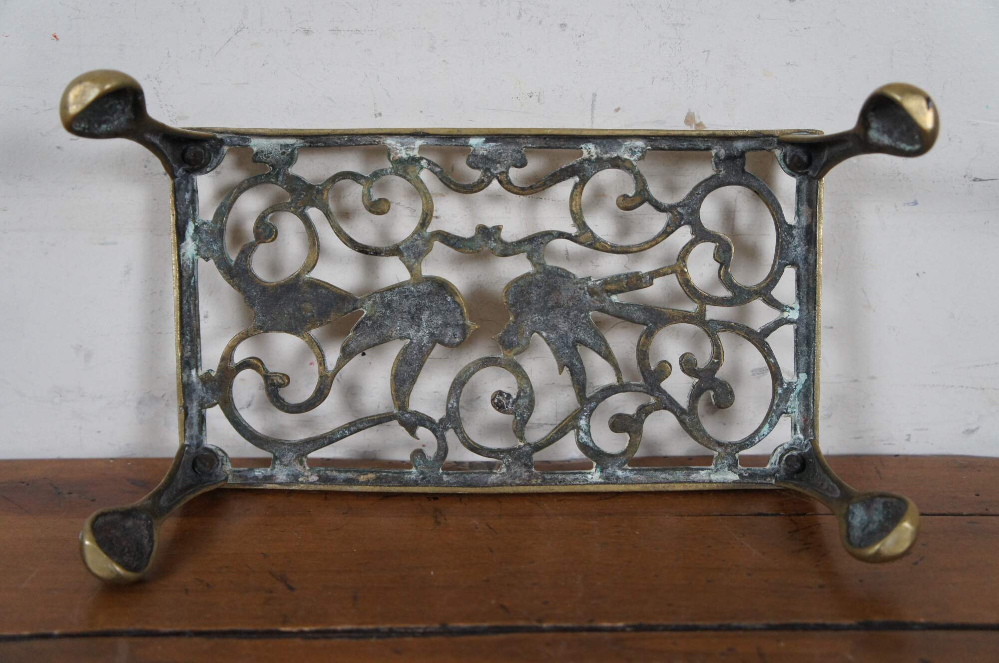 Antique brass farmhouse fireplace footman / warmer / trivet / stool / plant stand / kettle rest featuring pierced reticulated design of birds with ball and claw feet.