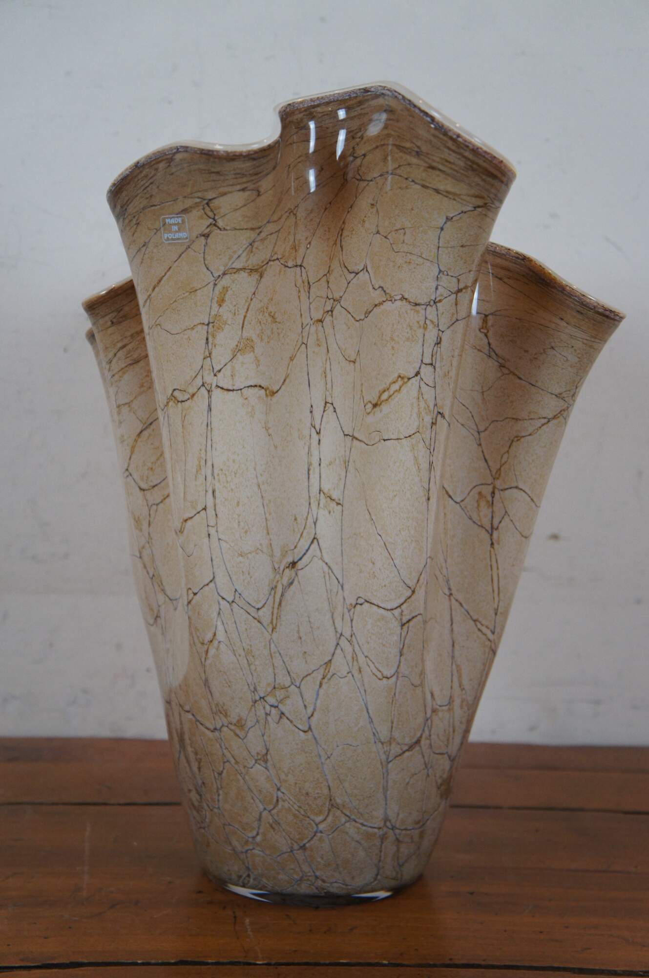 Large vintage Polish hand blown art glass centerpiece flower vase featuring a brown marble ruffled handkerchief design. Made in Poland by Zorza.