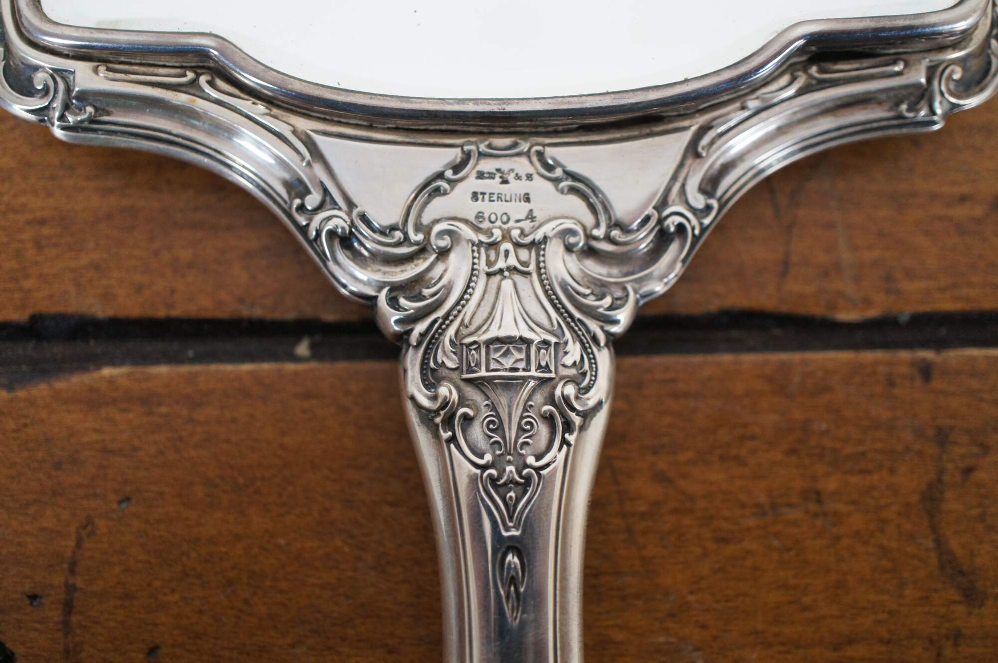 Impressive antique eight piece vanity grooming set by Robert Wallace & Sons featuring Art Deco styling with floral motif. Includes mirror, brush, comb, scissors, file, button hook loop, buffing pad, shoe horn and purple velvet lined box case.