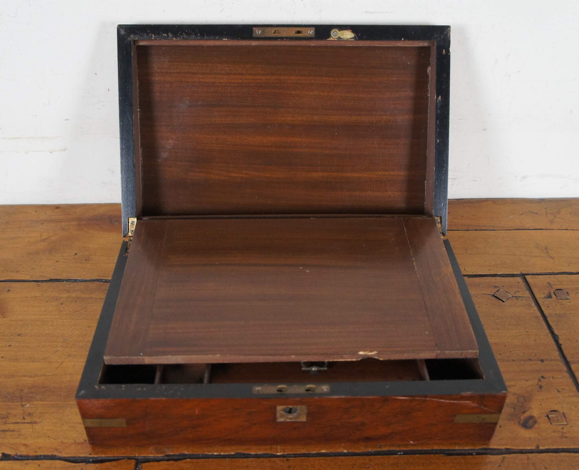 Antique 19th Century English Georgian campaign writing slope, box or travel desk. Made from rosewood featuring rectangular form with brass banding. Opens to purple velvet interior with multiple storage compartments and writing surfaces.