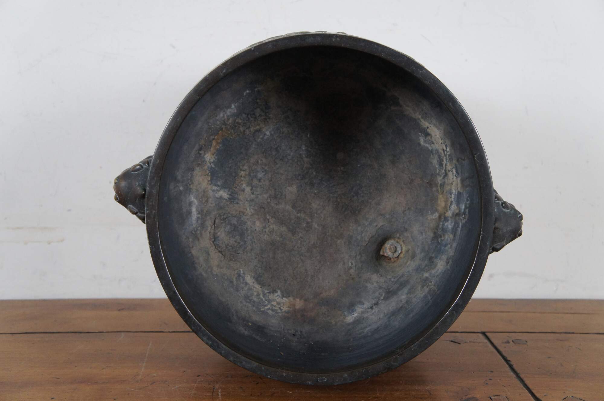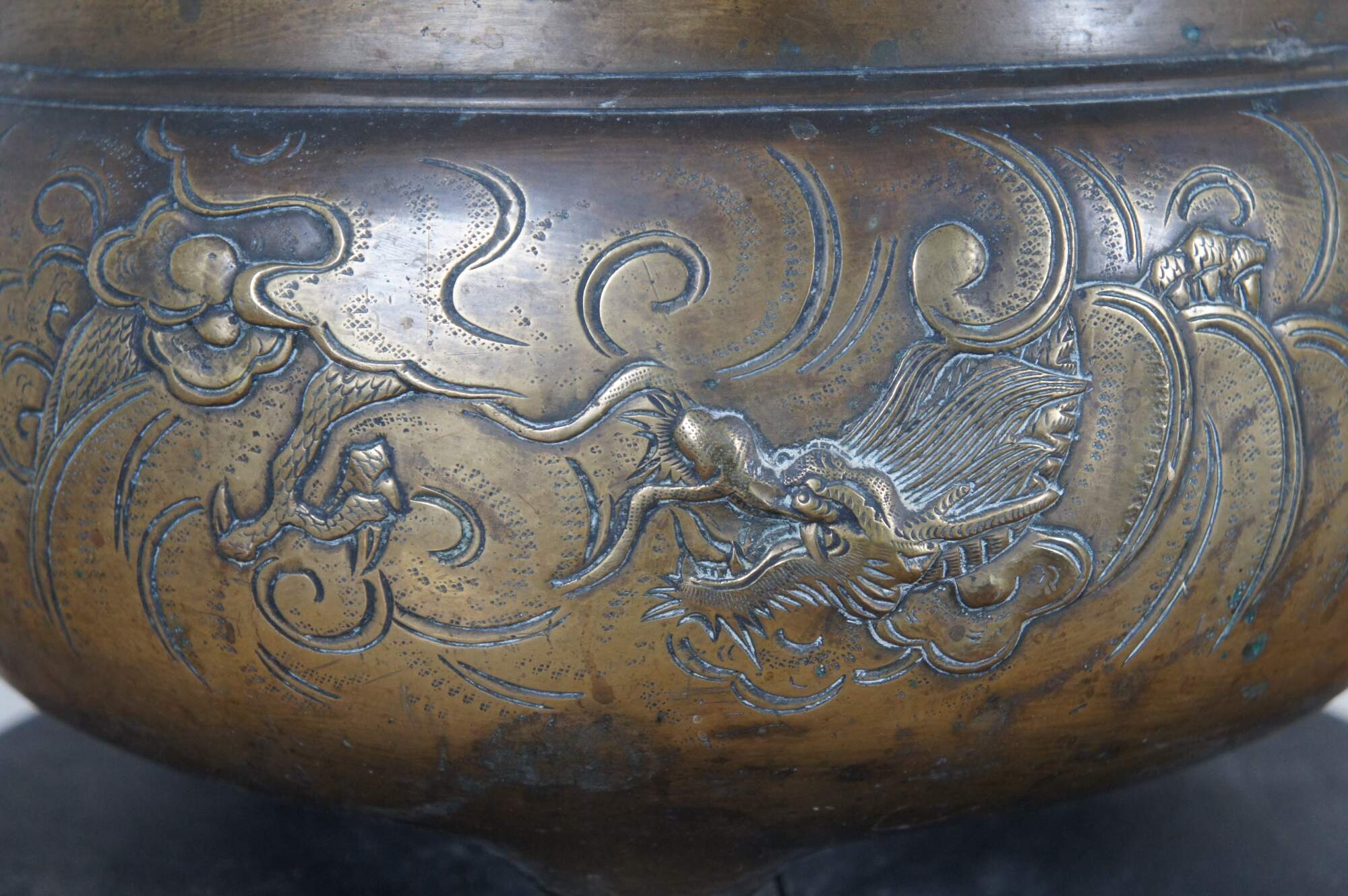 A large and impressive antique Chinese bronze Temple censer bowl on stand featuring a Phoenix on one side and Dragon on the other, with Feng Shui beast head handles and wood stand.