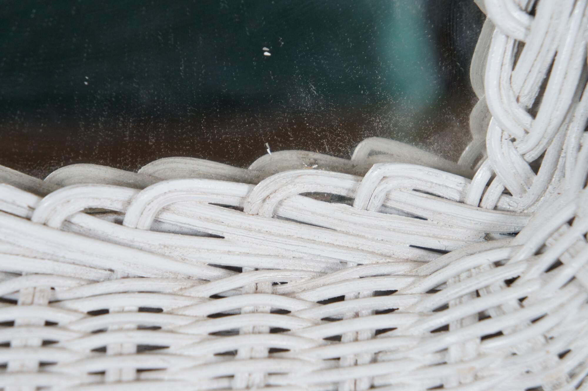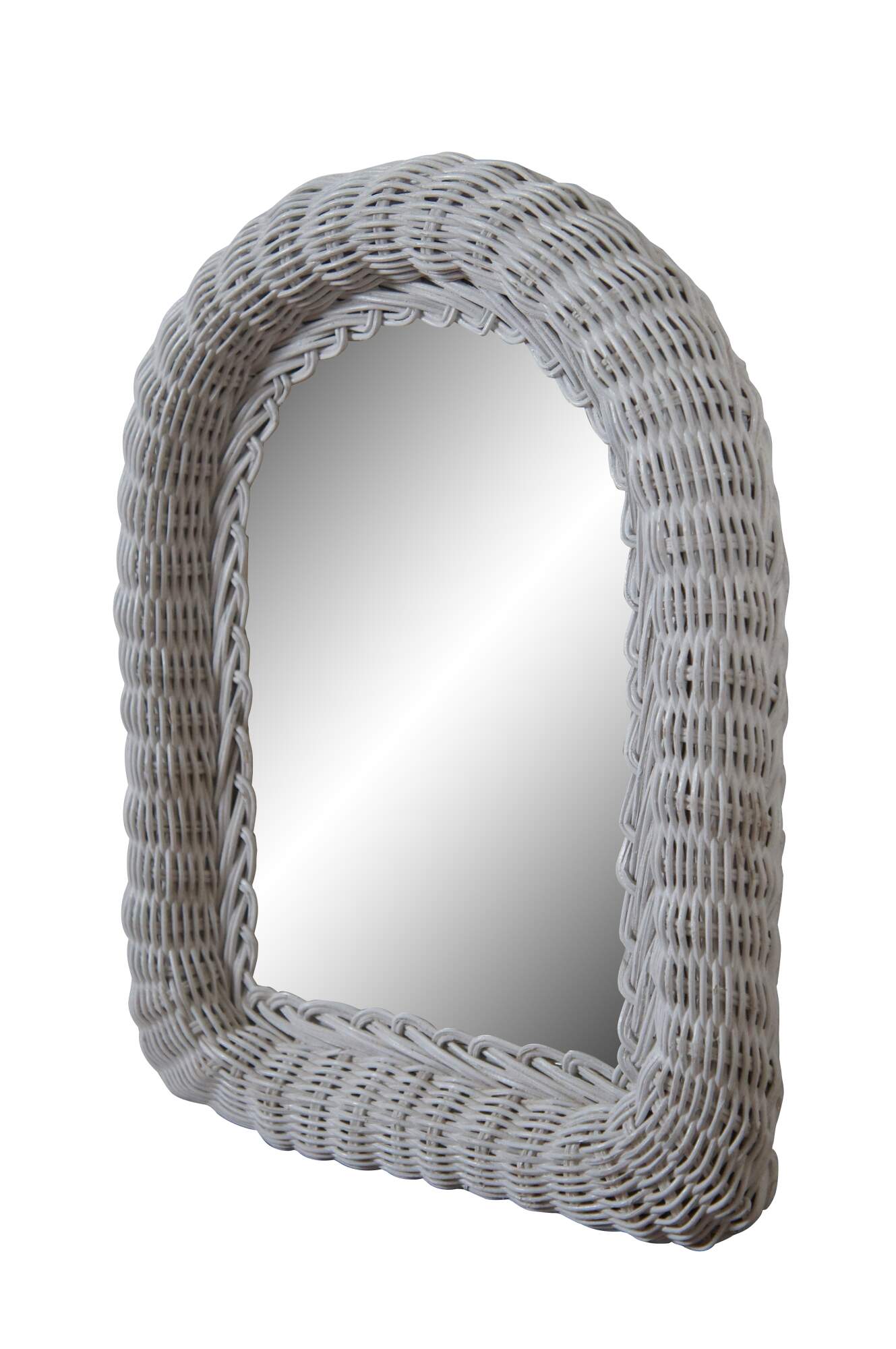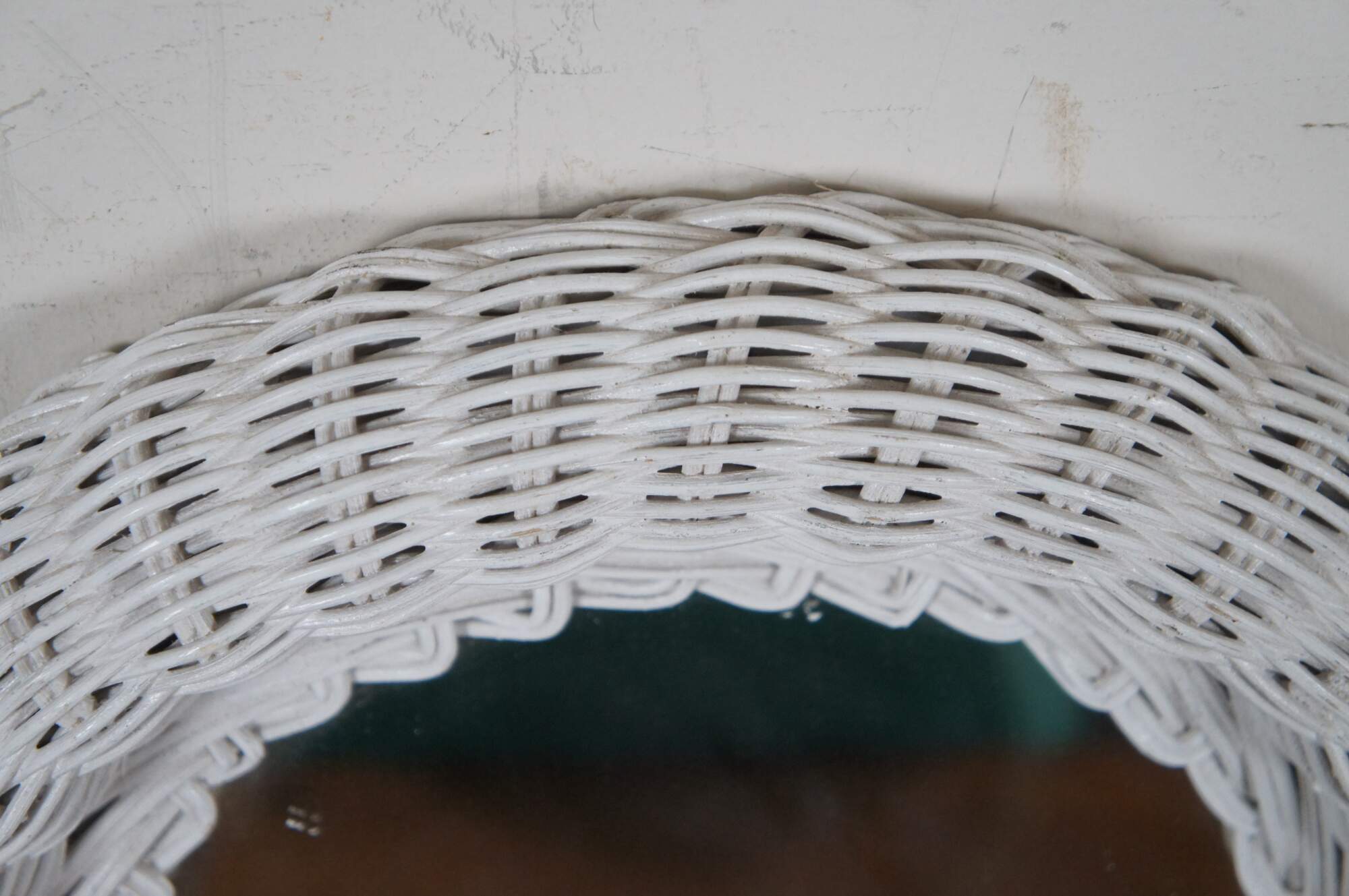 Vintage arched white wicker vanity mirror.