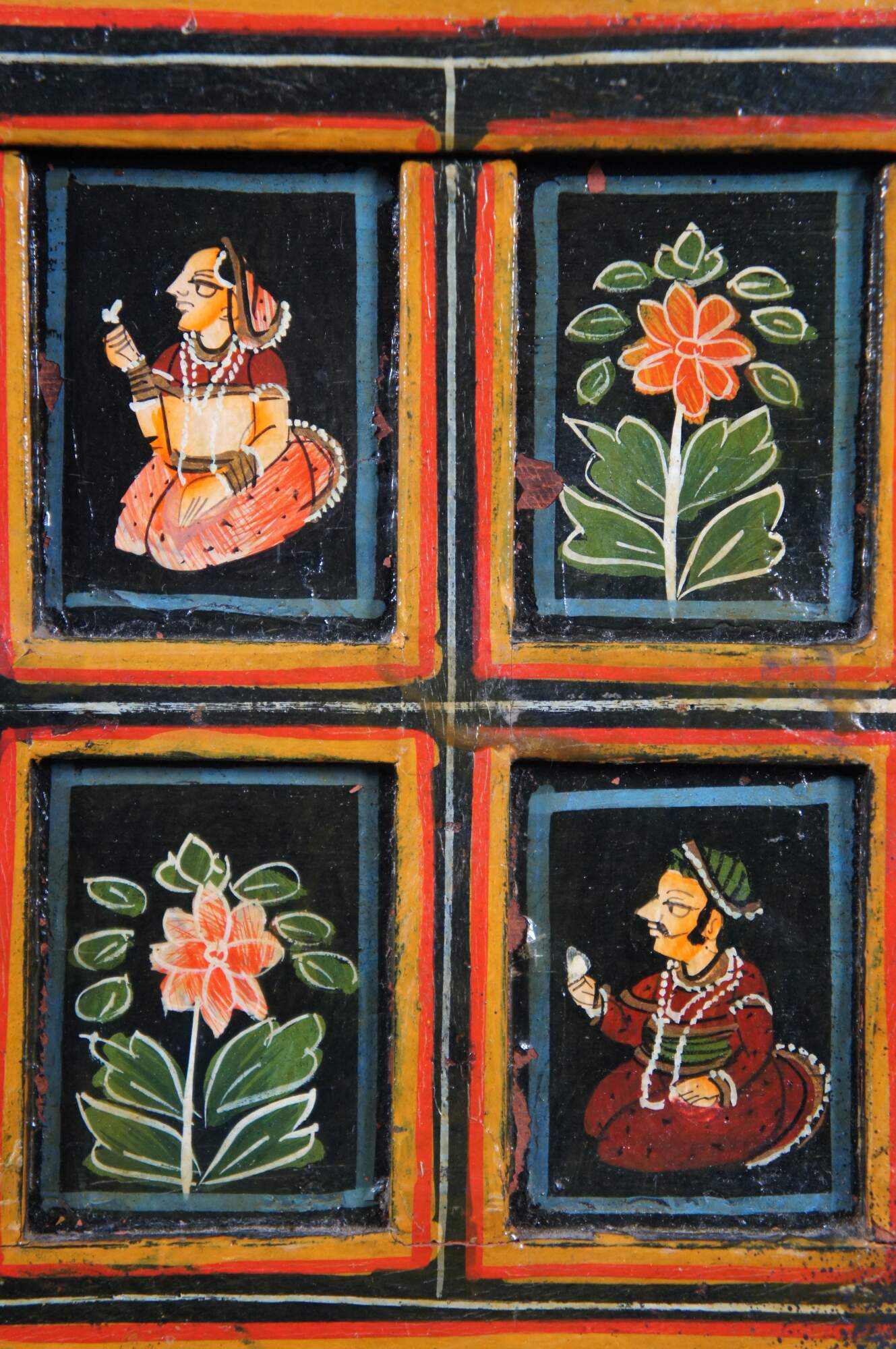 Beautiful antique hand painted Indian Mughal wedding / dowry / marriage box / keepsake storage chest / casket featuring hinged lid with polychrome painted figural and floral panel motif.