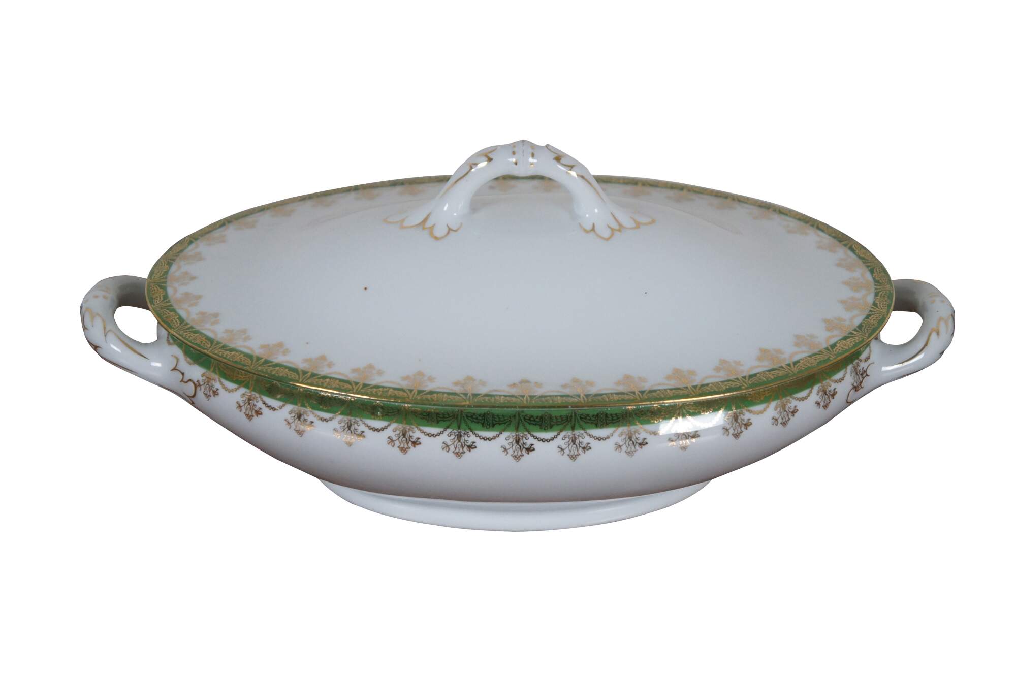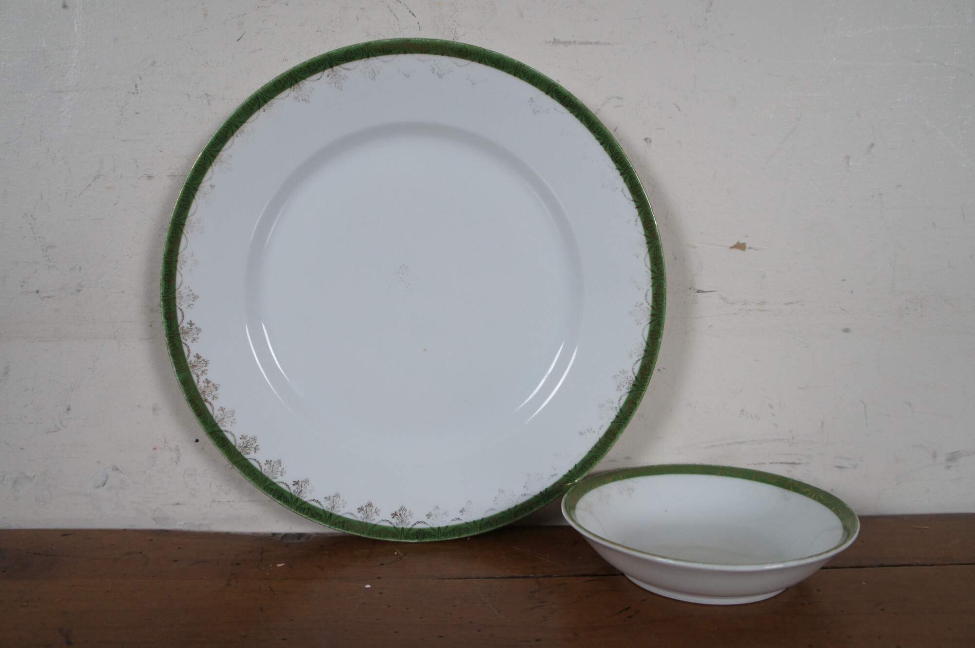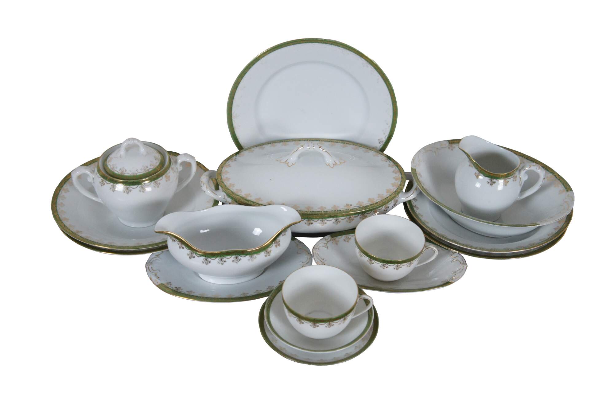 A rare antique pattern 18 piece assorted lot of porcelain dinnerware by Adolf Persch, circa 1902-1910. Features apple green border with gilded trim of Neoclassical beaded, floral swags. Includes plates, bowls, cups, saucers, gravy boat, cream, sugar, covered casserole / vegetable serving dish / bowl.