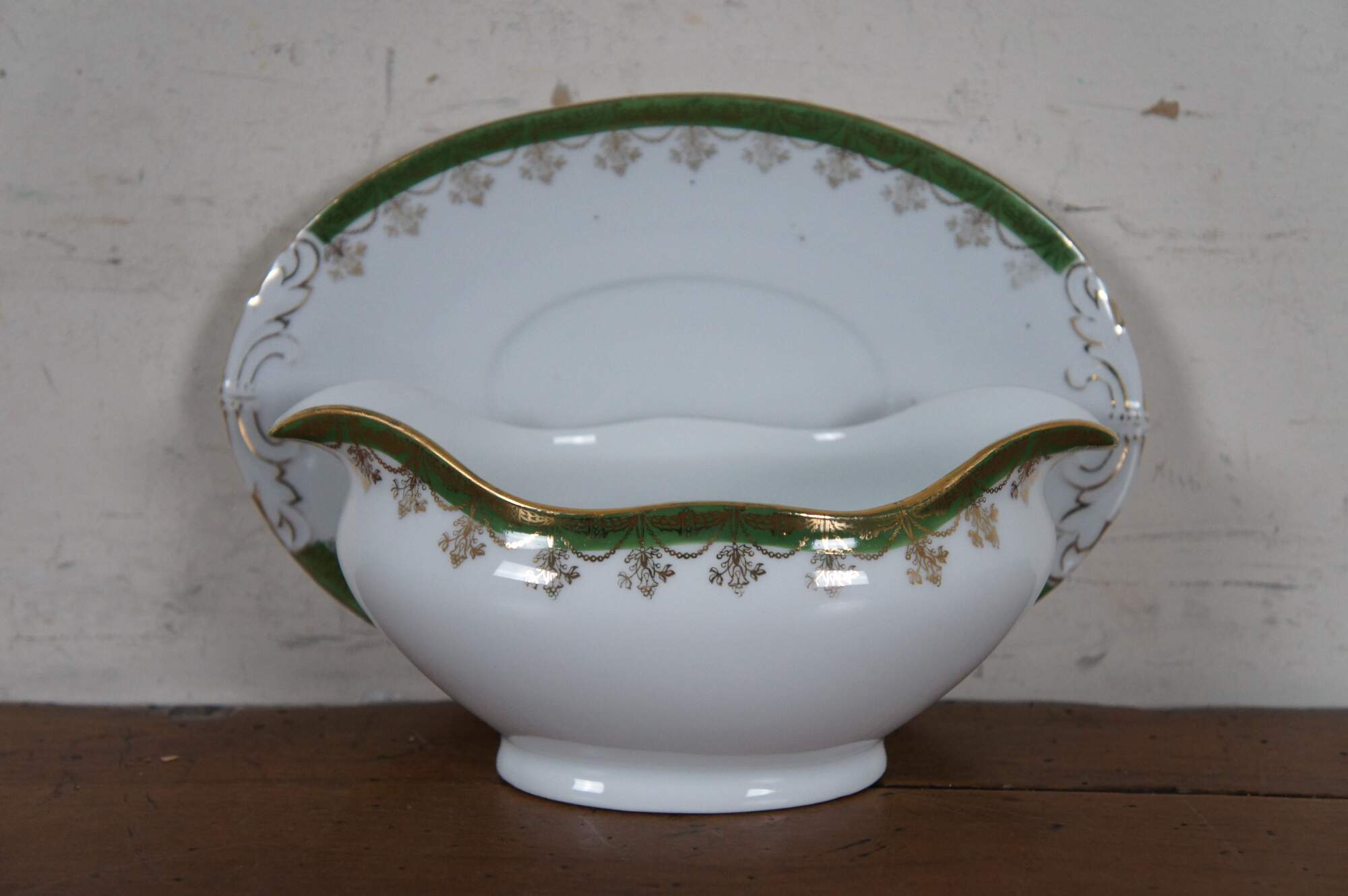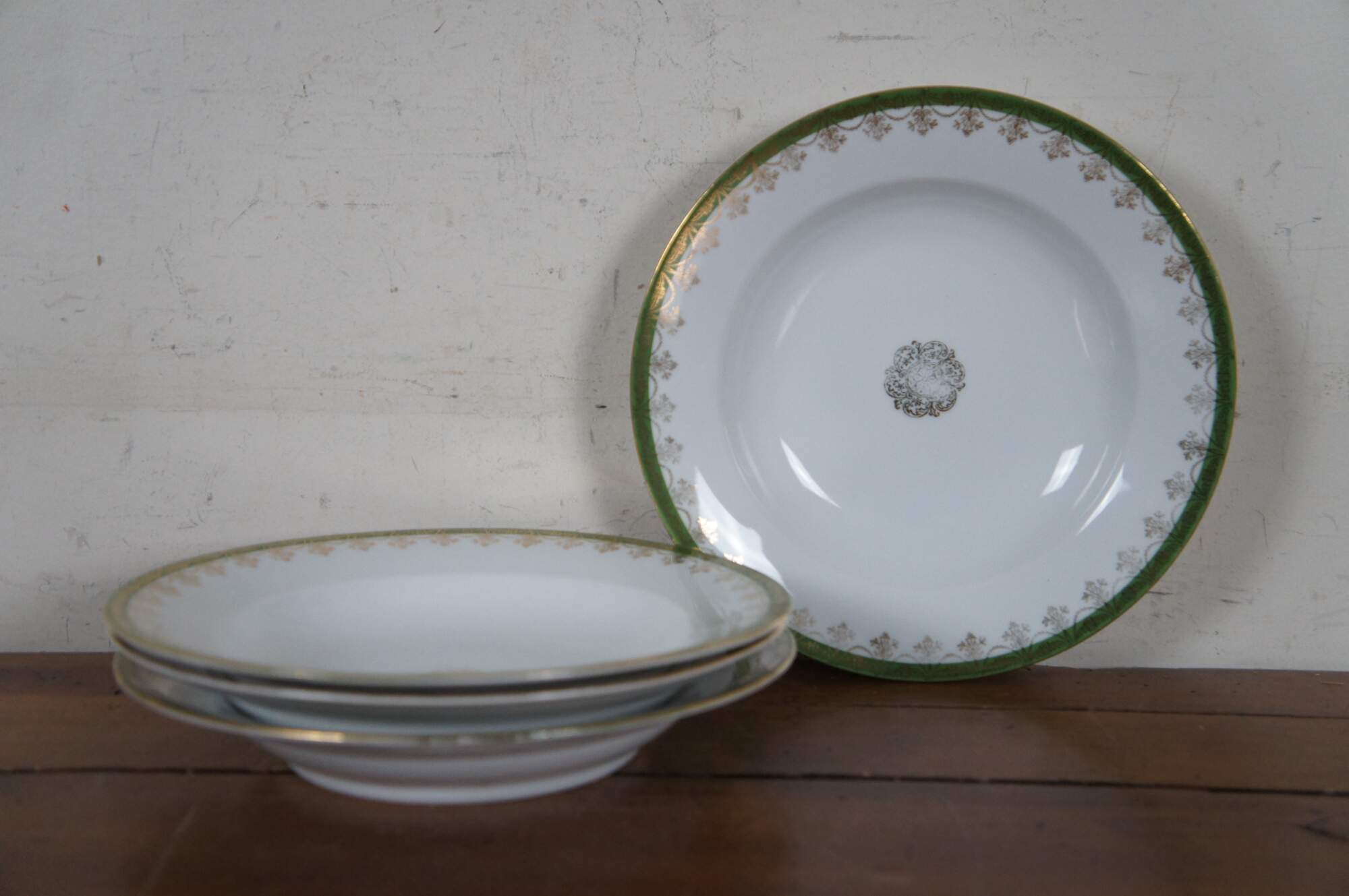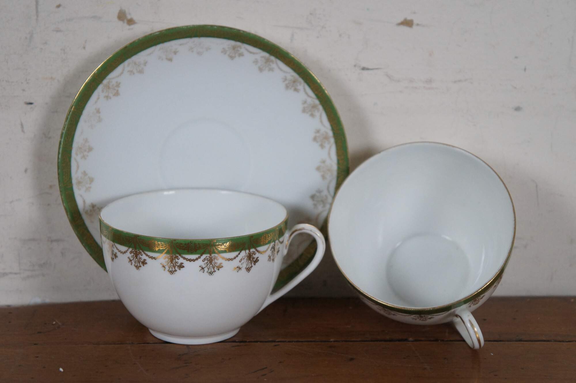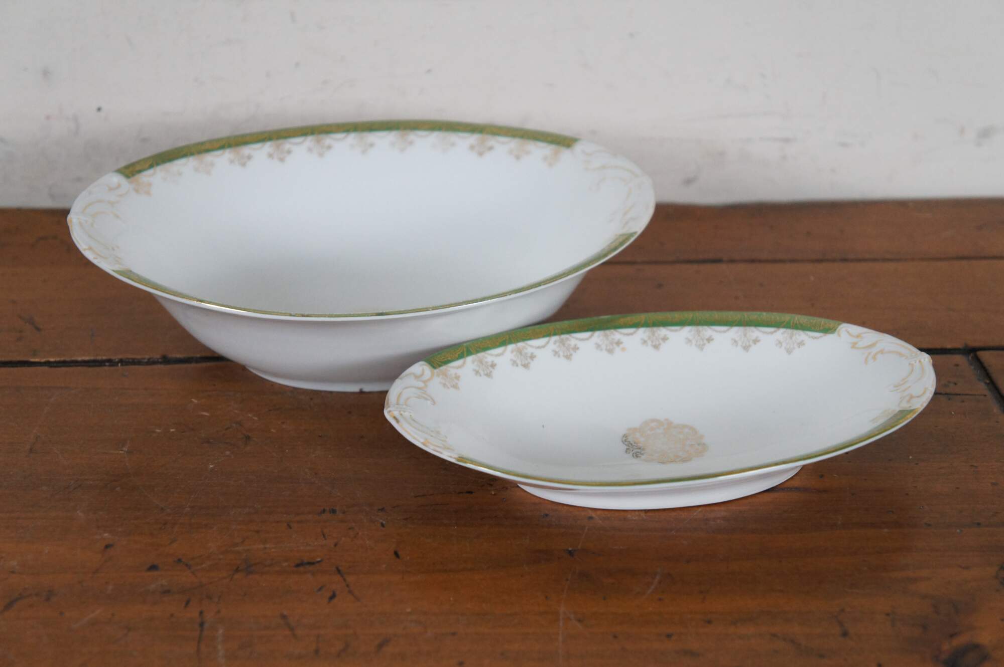 A rare antique pattern 18 piece assorted lot of porcelain dinnerware by Adolf Persch, circa 1902-1910. Features apple green border with gilded trim of Neoclassical beaded, floral swags. Includes plates, bowls, cups, saucers, gravy boat, cream, sugar, covered casserole / vegetable serving dish / bowl.