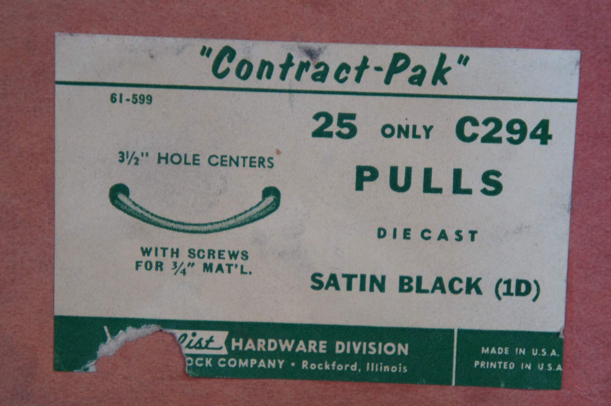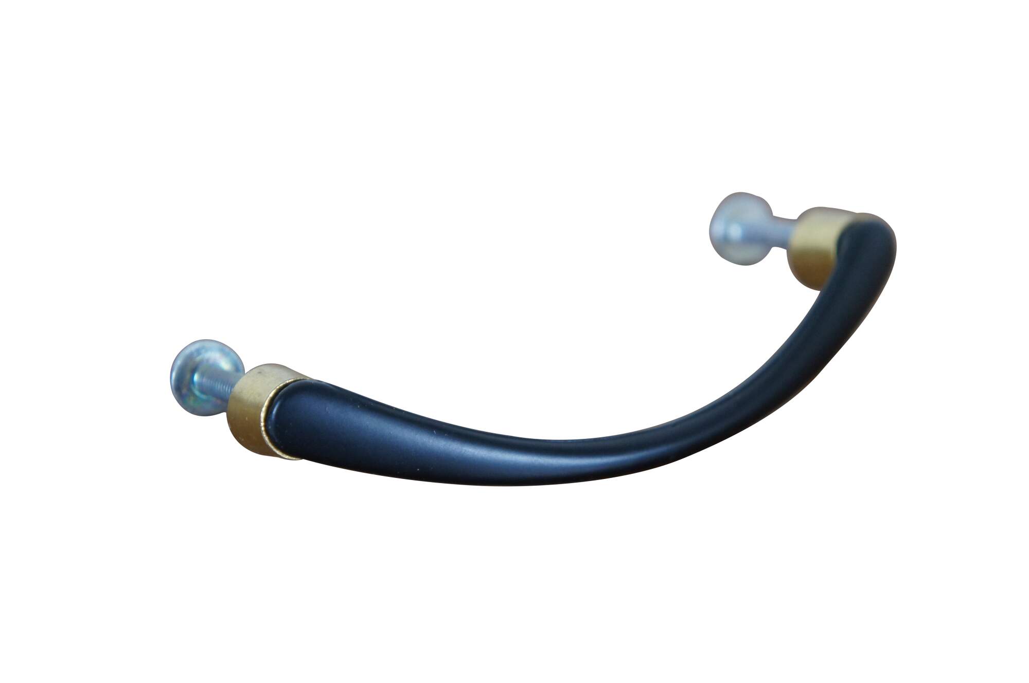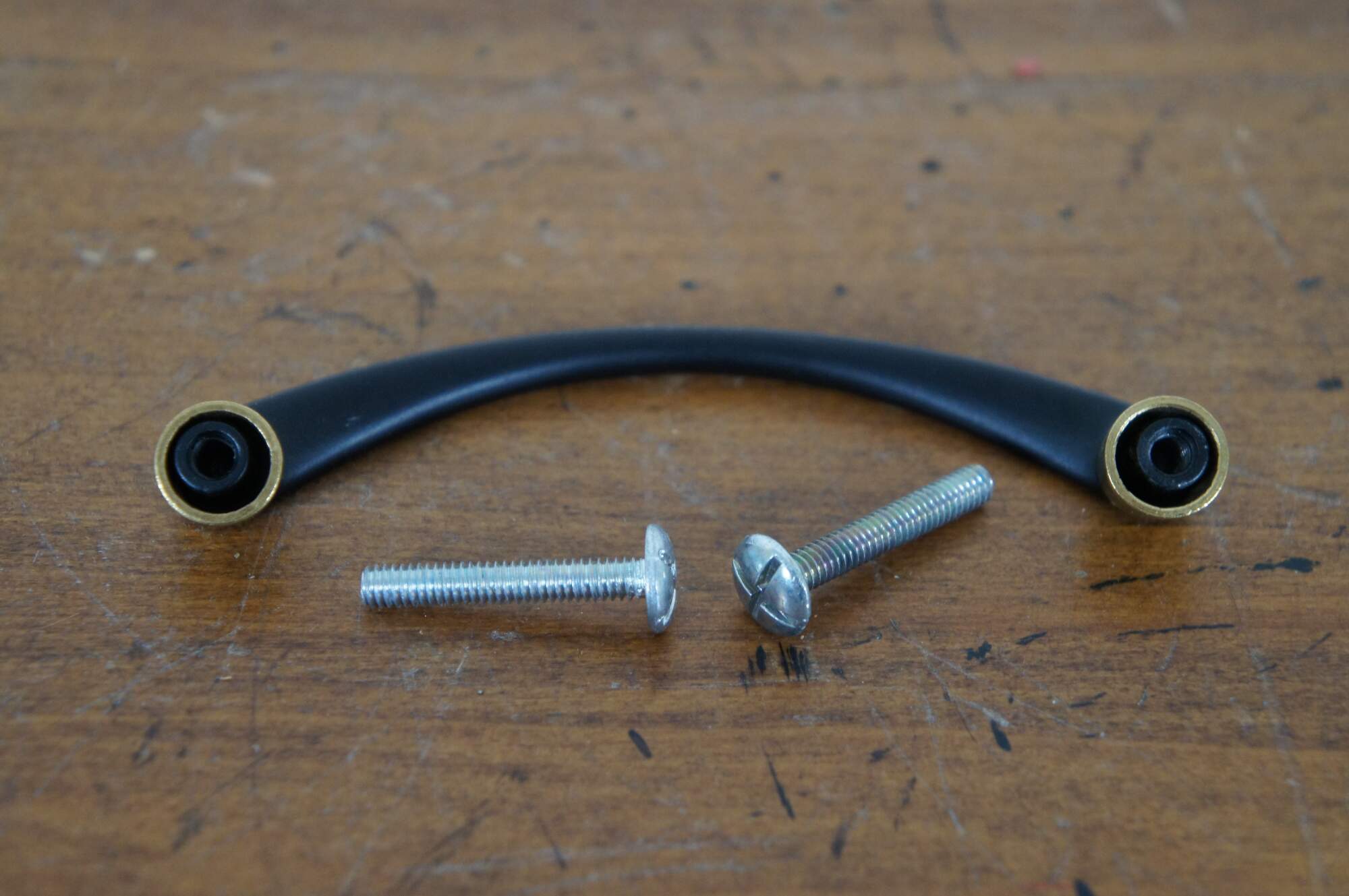 32 Available – mid century modern National Lock Co Medalist “Contract-Pak,” hardware item number C294 drawer pulls, die cast in a gentle curve with bright brass caps at the corners, in a Satin Black finish (no. 1D). 3" center holes, 3.875" length, screws included.