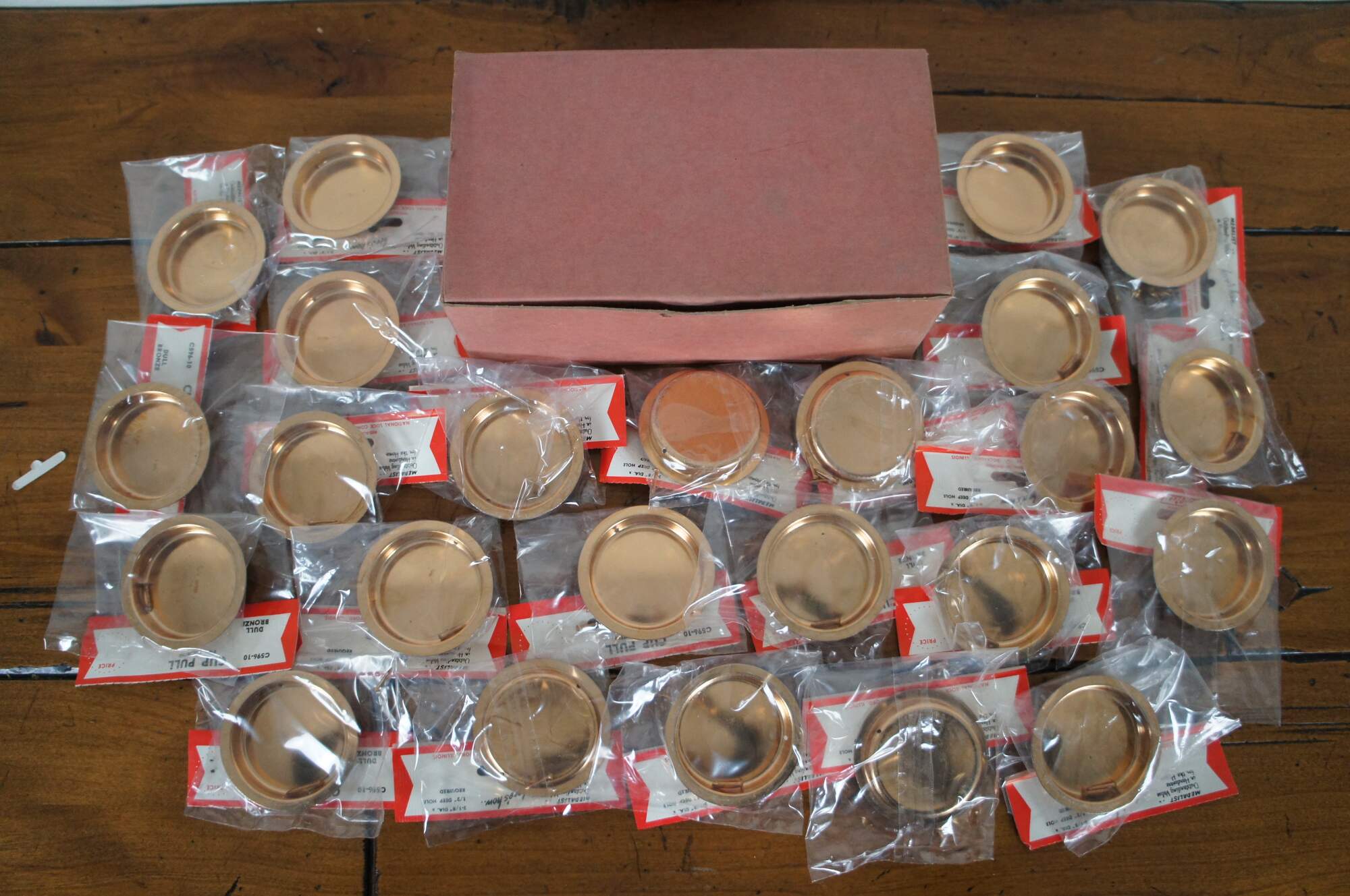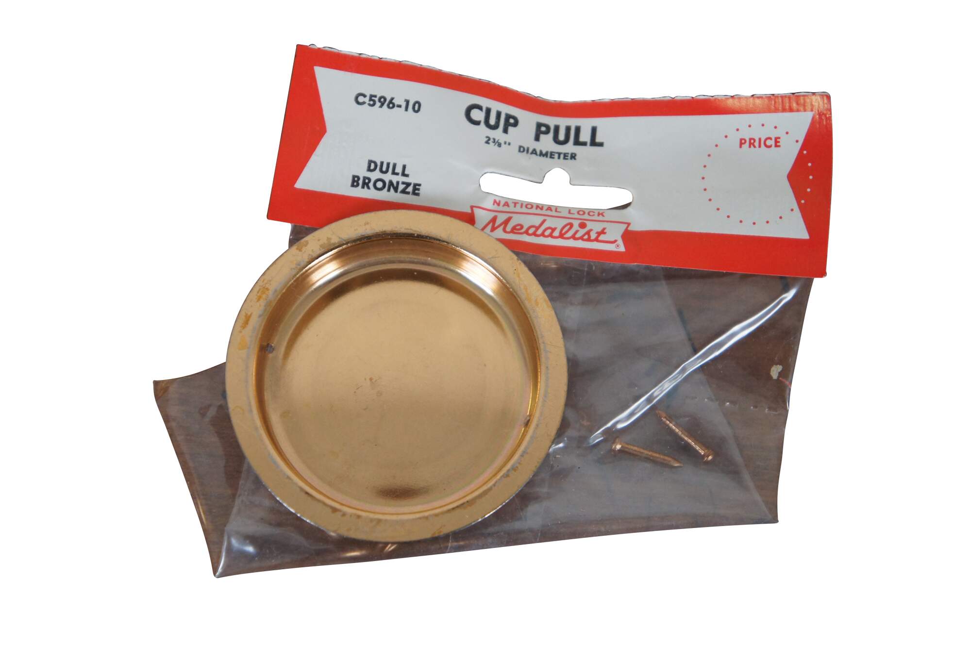 24 Available – Vintage National Lock Co Medalist “Contract-Pak,” item number C596 Cup shaped drawer pulls, crafted in bronze in a circular shape with circular divot and a Dull Bronze finish hardware (no. 10). 65-596. 2 3/8" diameter, includes esc pins.