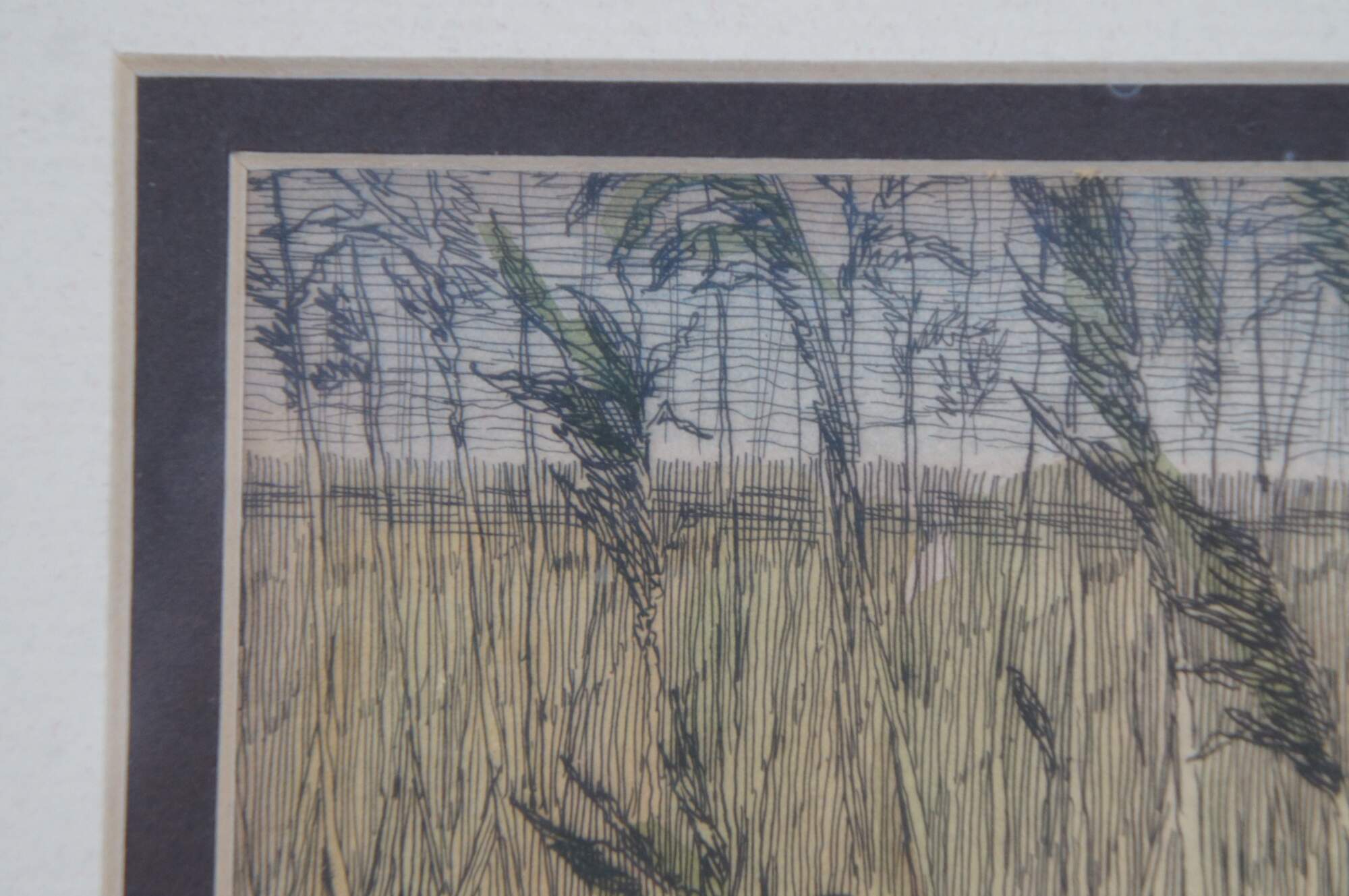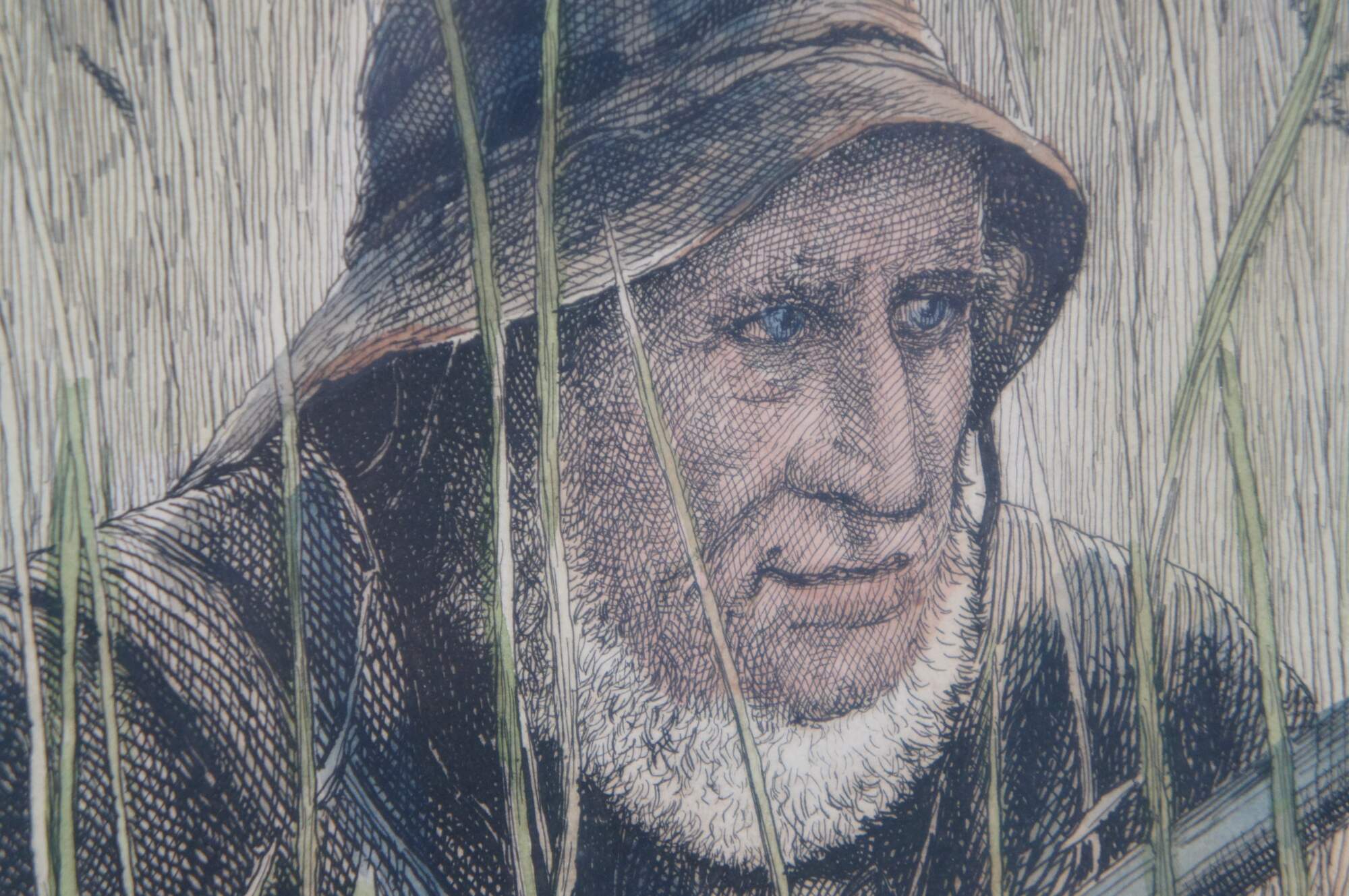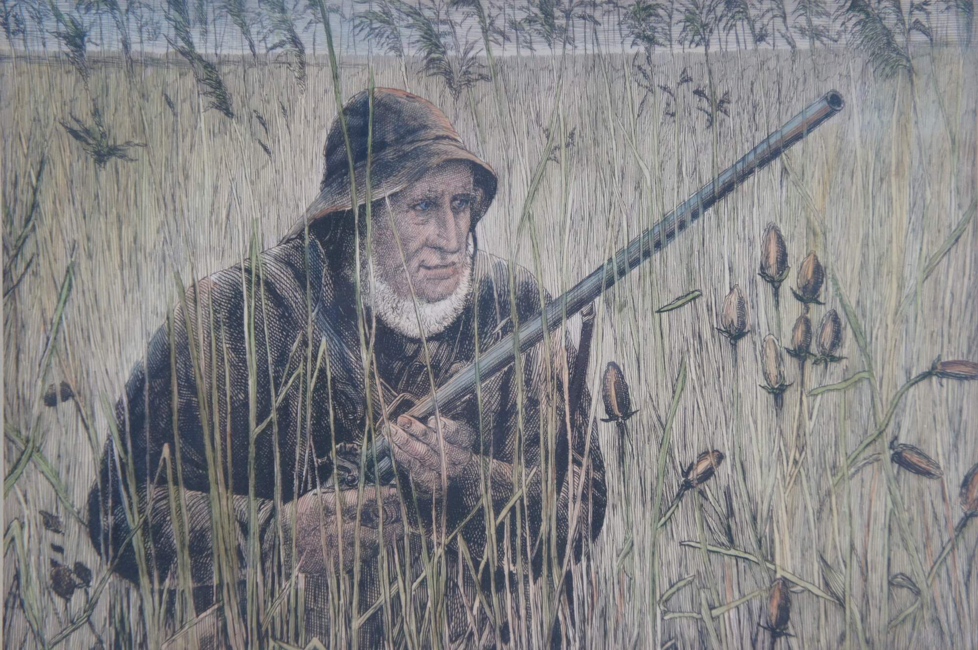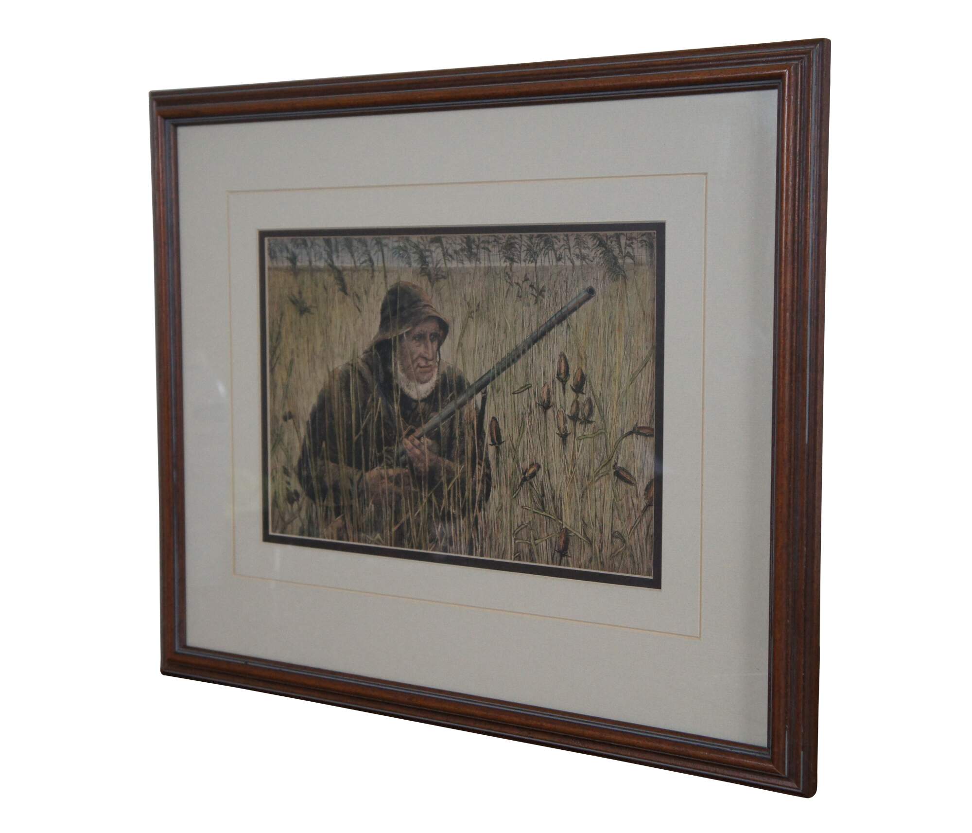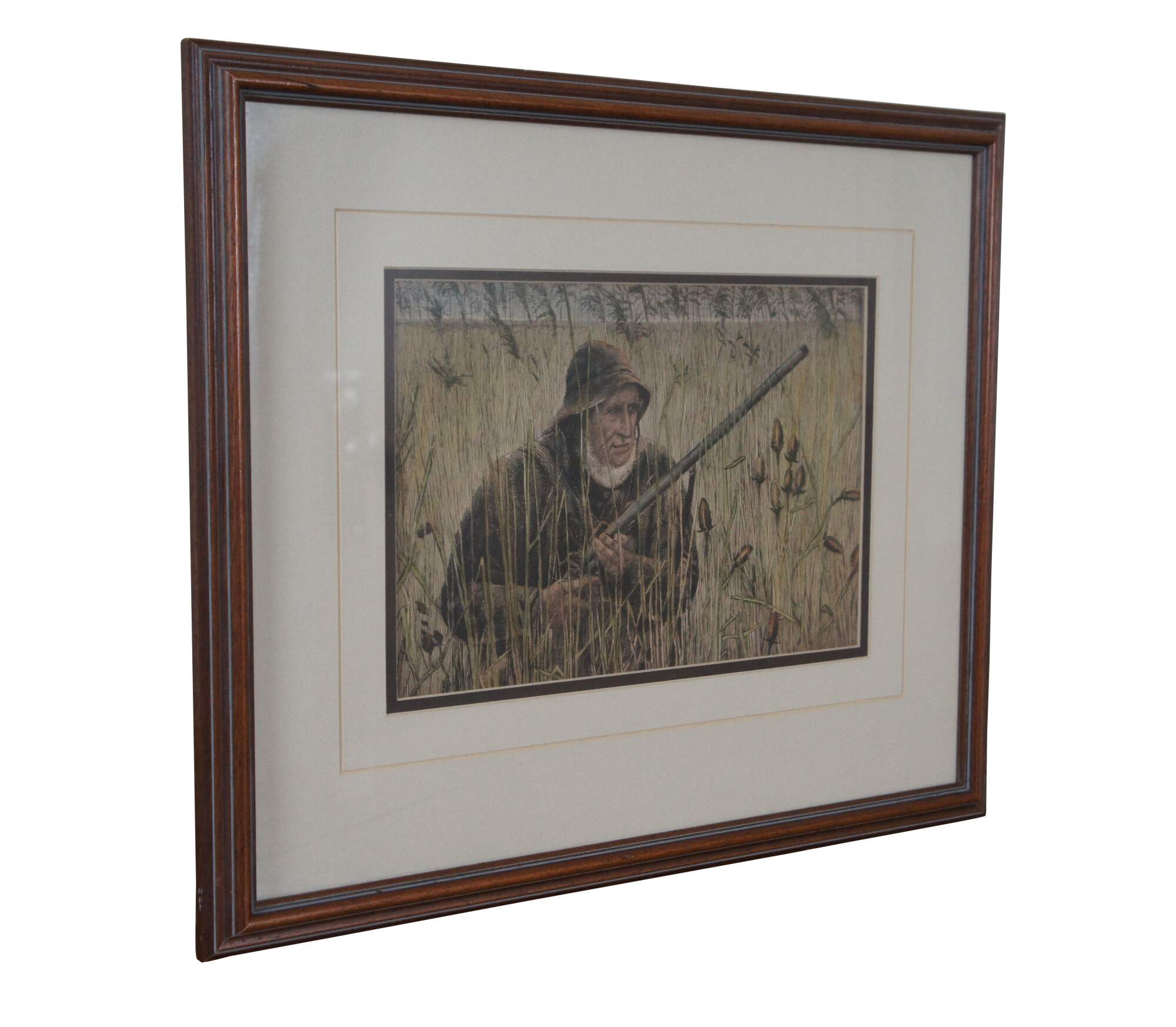 Antique hand colored duck hunt engraving featuring a man with his gun in the field. Circa late 1800s