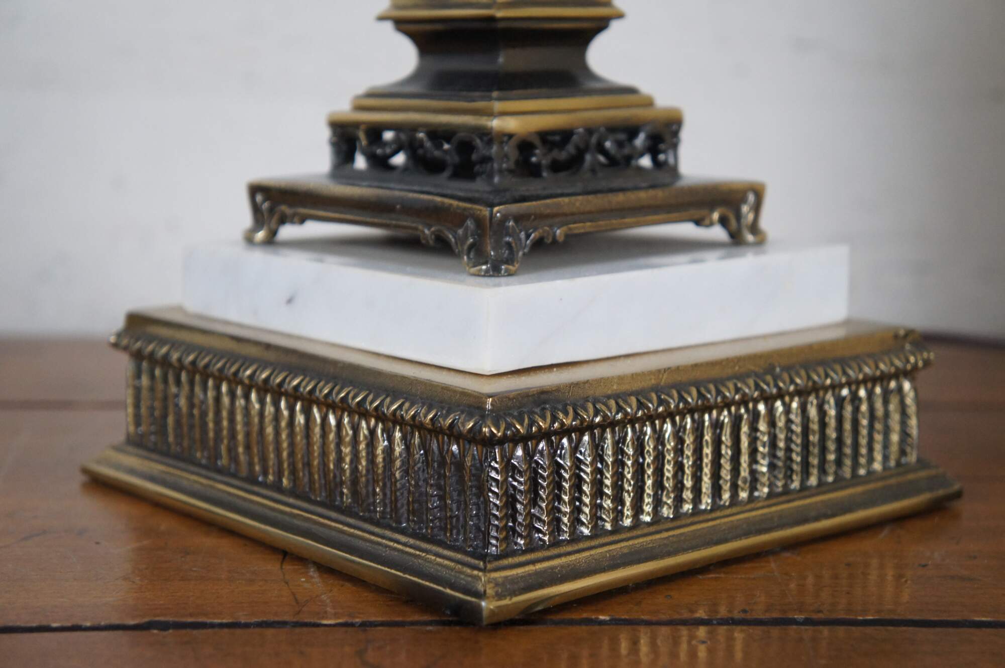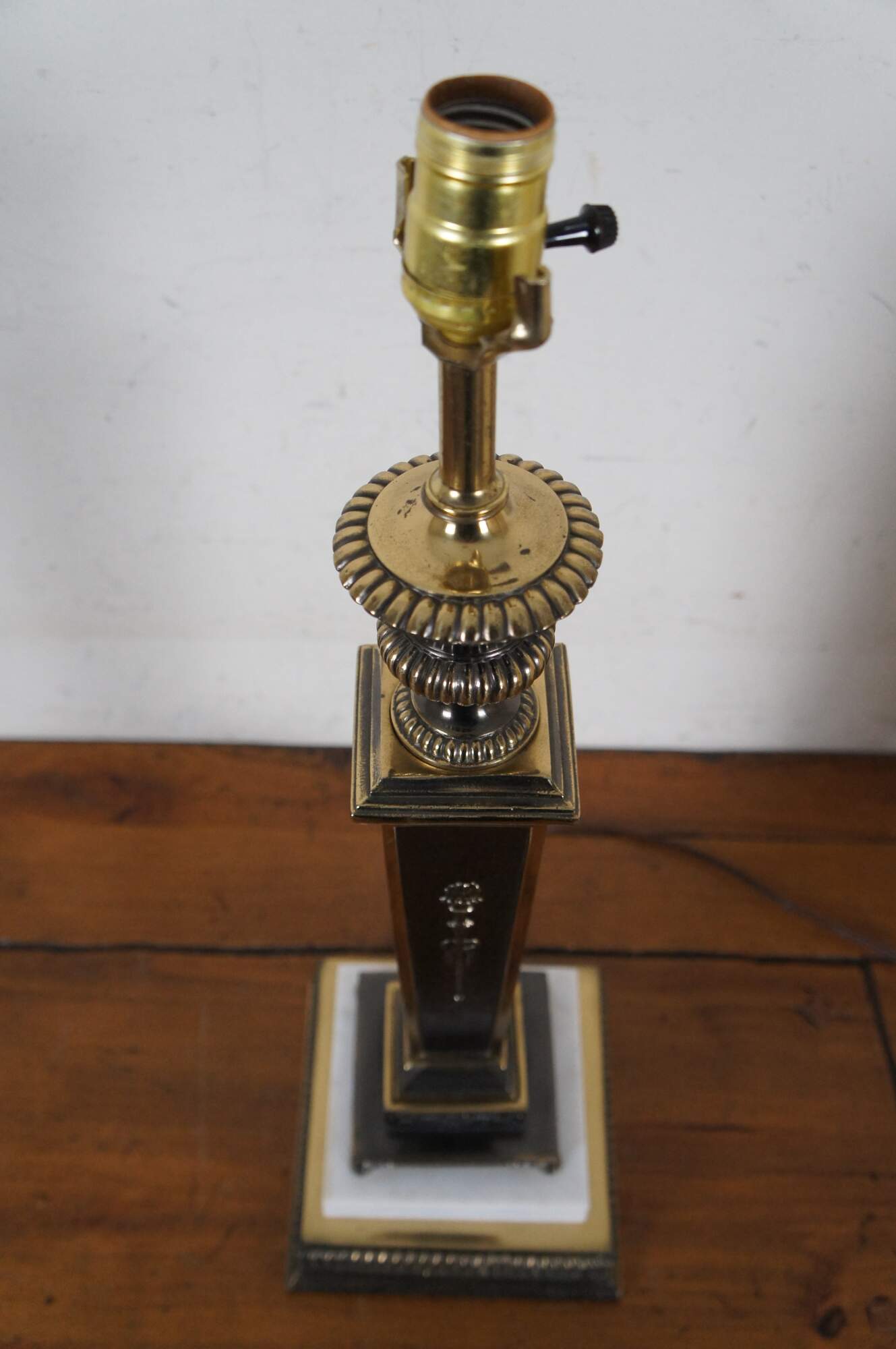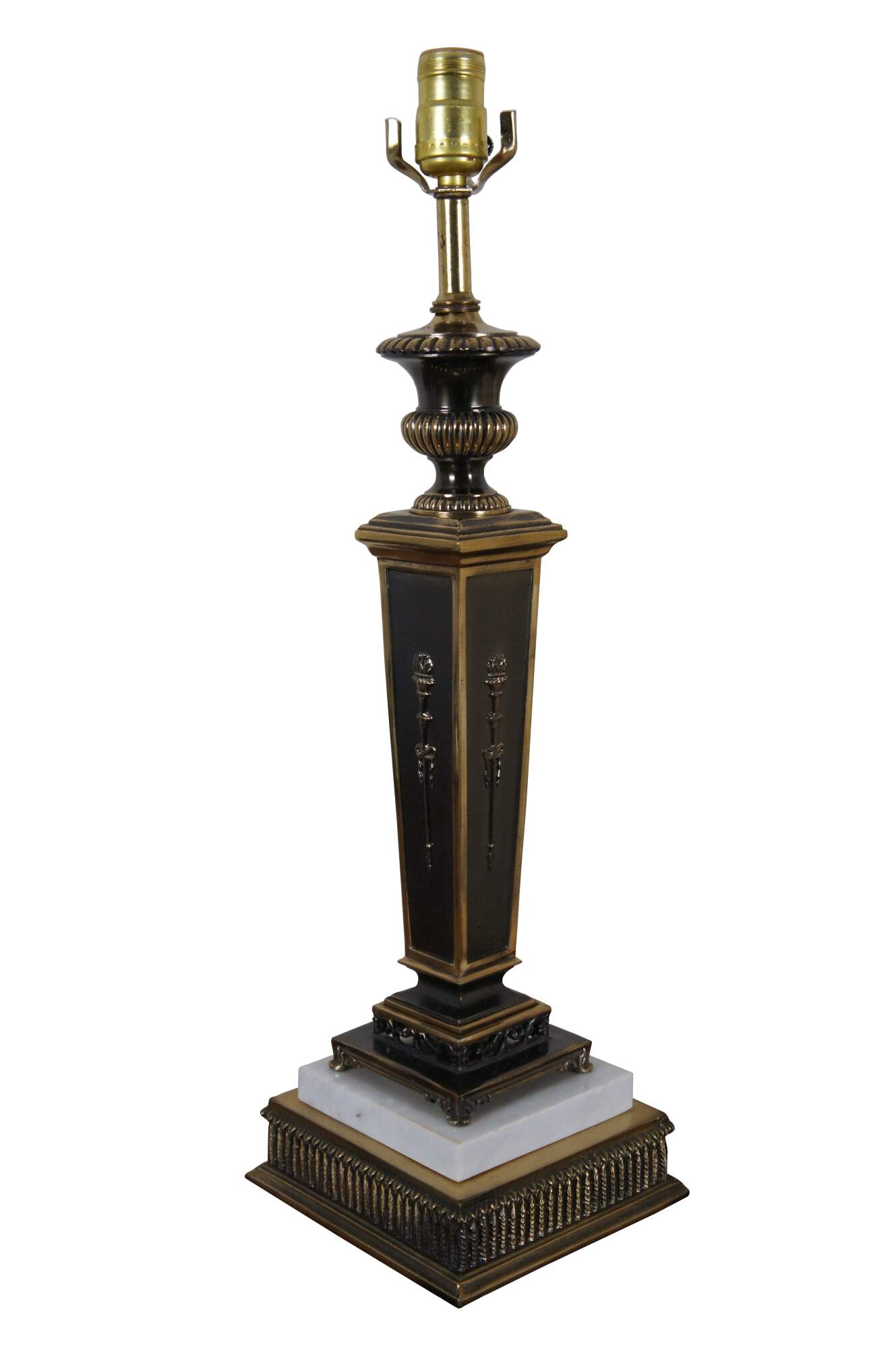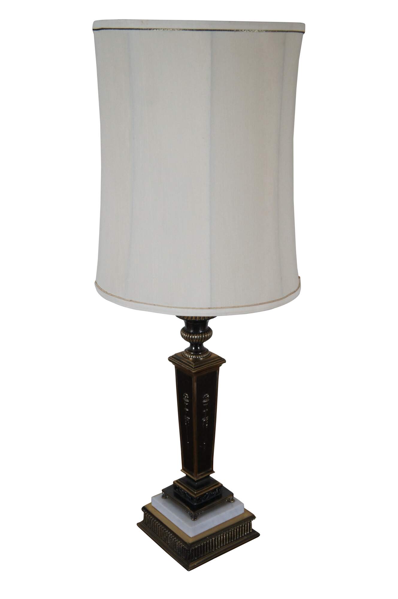 Vintage Empire style torchiere / square column / candlestick shaped table lamp, crafted of brass with dark accents and white marble on the base. Includes cap shaped finial and cylindrical white cloth shade with narrow trim.