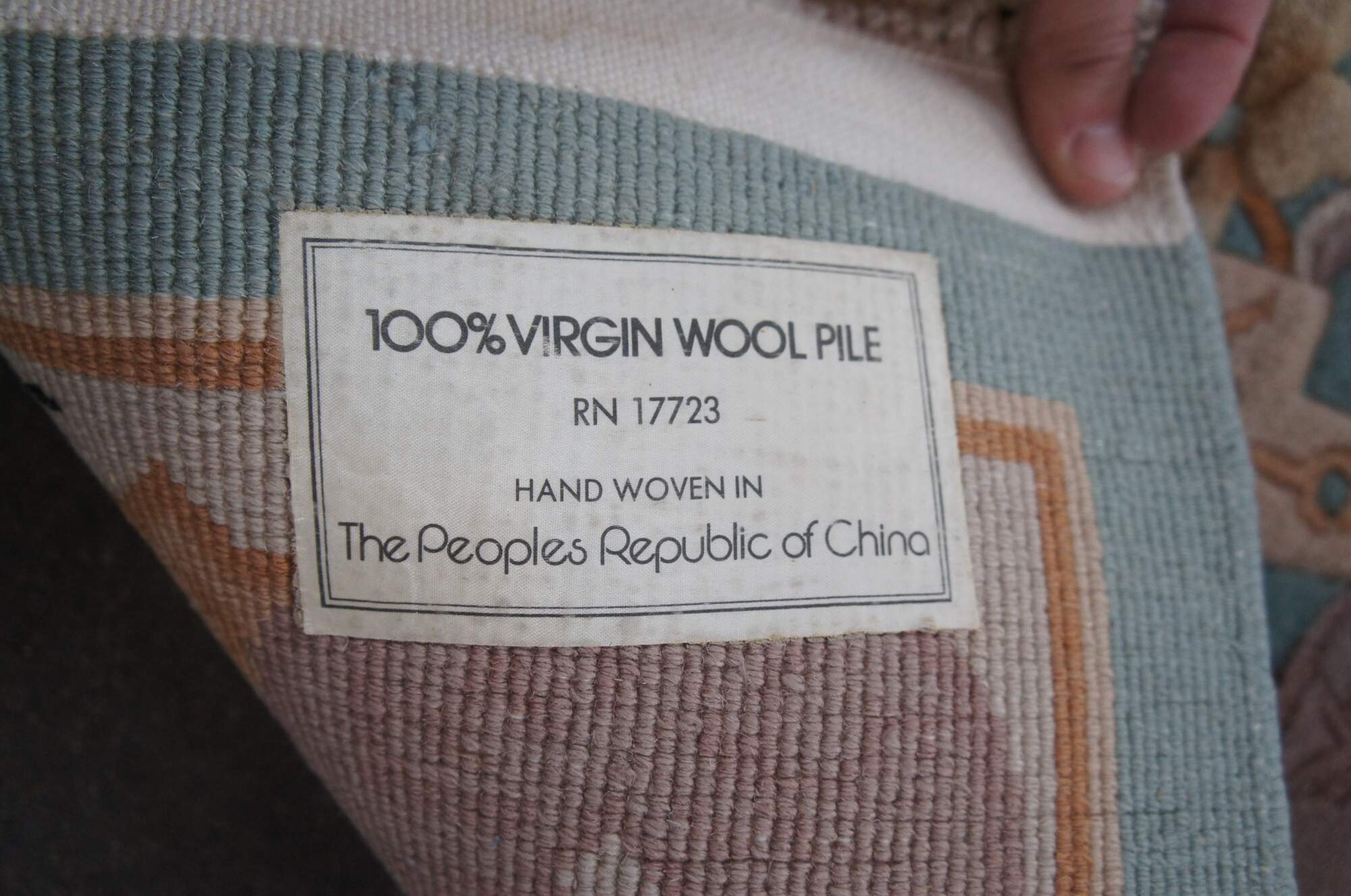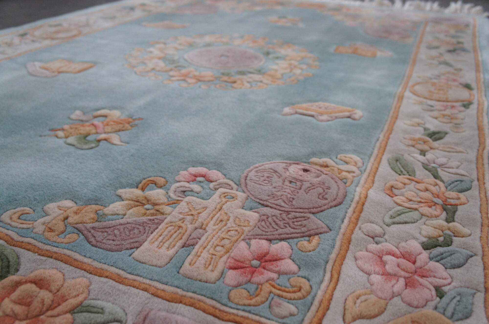 Vintage Chinese Oriental area rug or carpet. Made of 100% virgin wool featuring a floral aubusson design with blue field surrounded by scholars scrolls, books, stands, and feng shui coins representing good fortune, luck, wealth, and prosperity. Blues, purple, peach, orange, cream, pinks, green. Hand woven in The Peoples Republic of China.