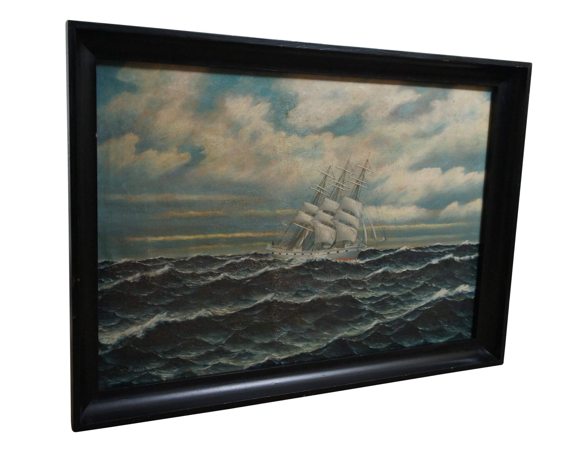 Antique Dutch School oil painting on canvas showing a yacht / clipper ship on a choppy sea. Signed in lower left corner J. Johannesen (Y. Yohannsen) – 1917.