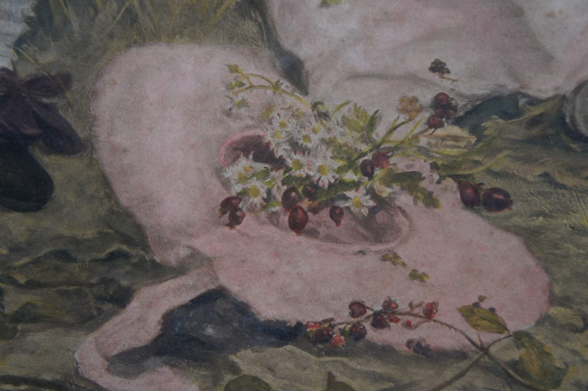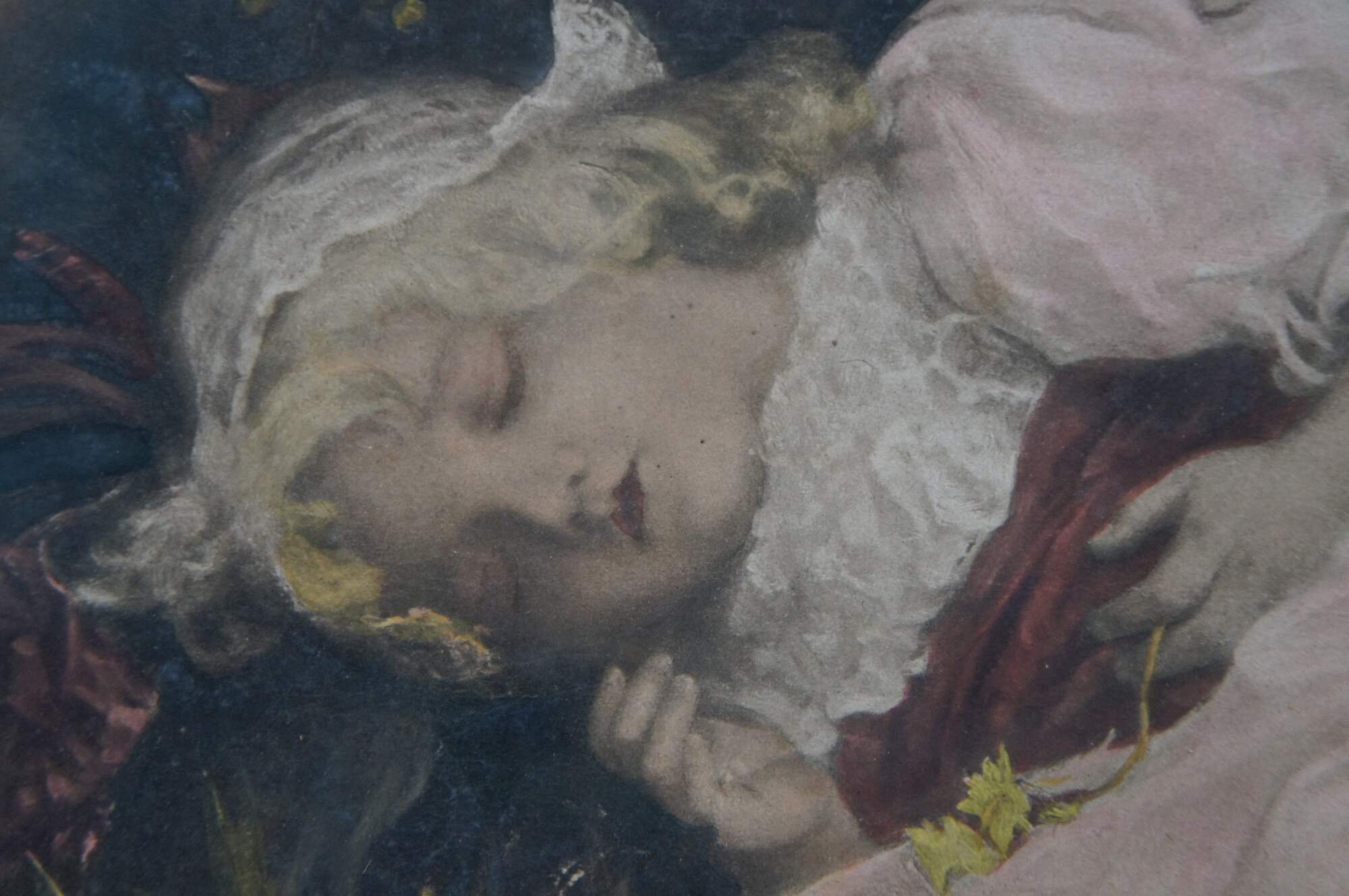 Antique colored lithograph print of “Babes in the Wood” by Fred Morgan, showing a pair of children, reminiscent of Hansel and Gretel, seated together in the woods, the girl sleeping on the boy’s knee. Matted and framed.