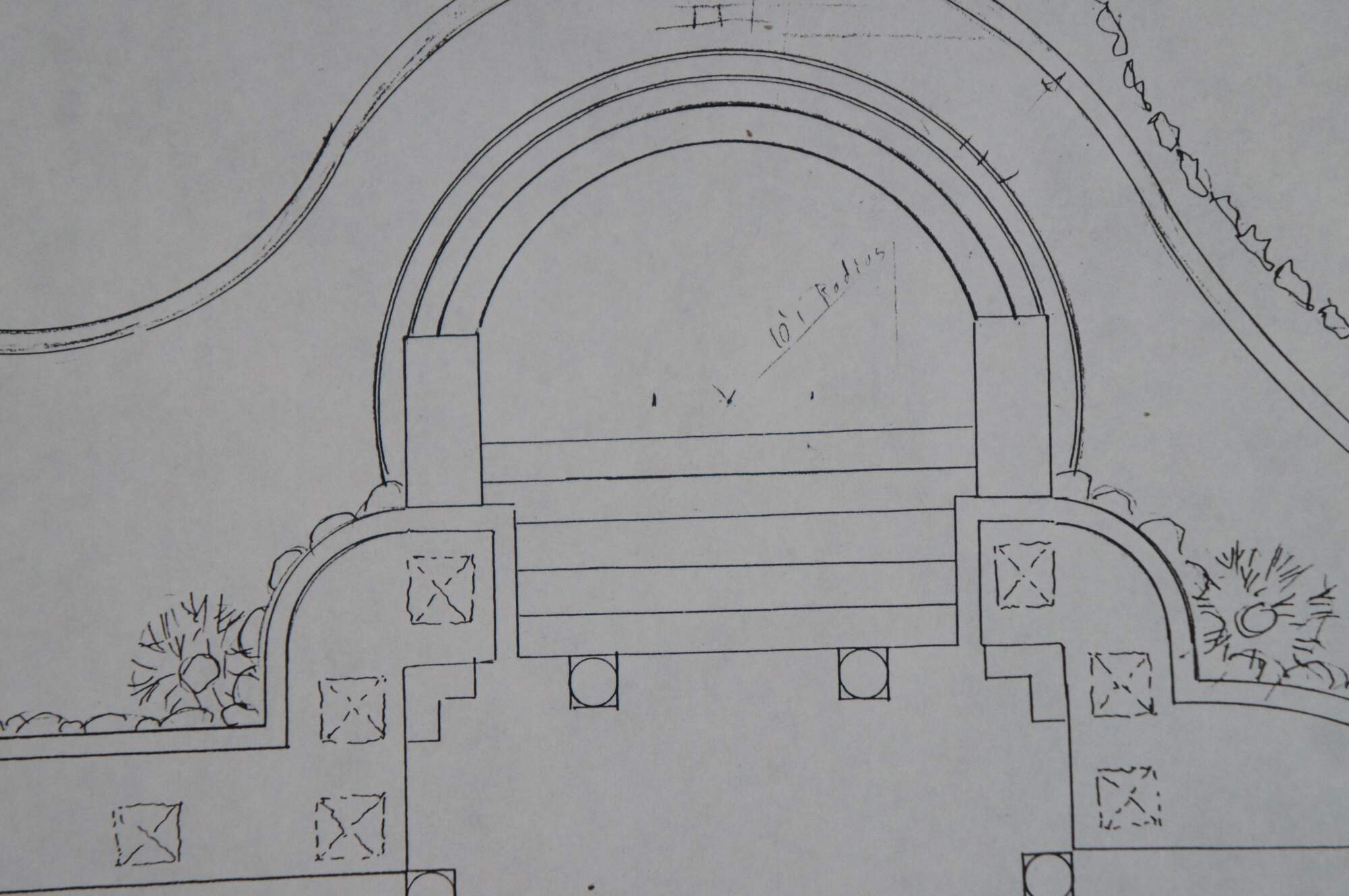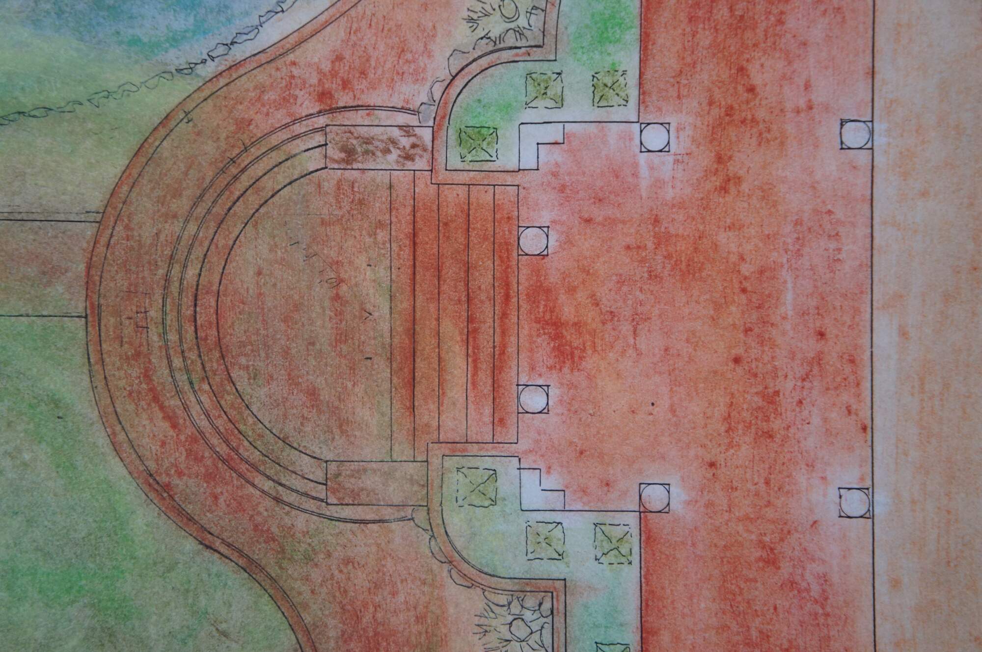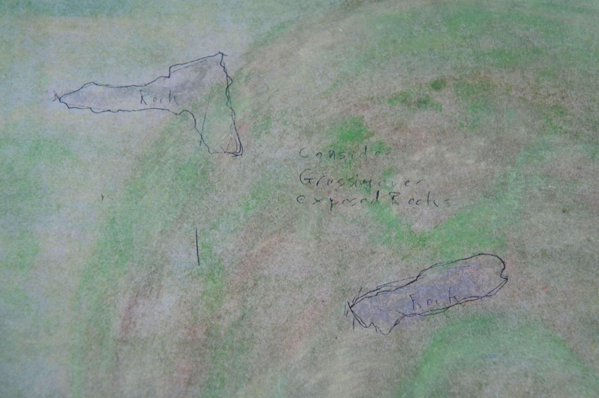 Pen and watercolor bird’s eye view architectural garden / grounds drawing / landscape layout of 995 Deer Point Rd in Olga Washingtons Orcas Island. Signed Peter Butler in one corner. Also includes an un-colored photocopy of the design/layout.