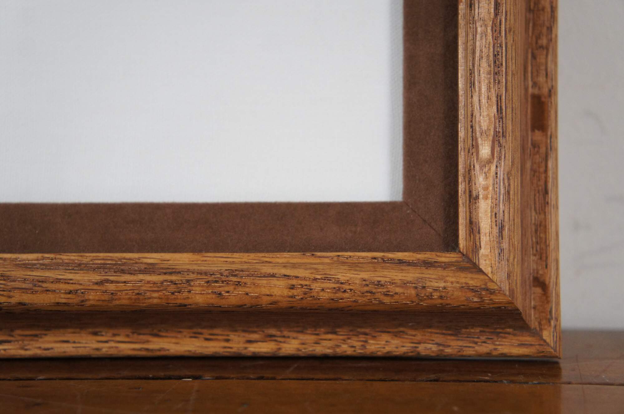 Vintage framed piece of crewel needlepoint embroidery / cross stitch art depicting a sea otter and pup floating in a bed of seaweed. Design by Virginia Miller; kit originally produced by Janlynn circa 1988. Framed in Oak