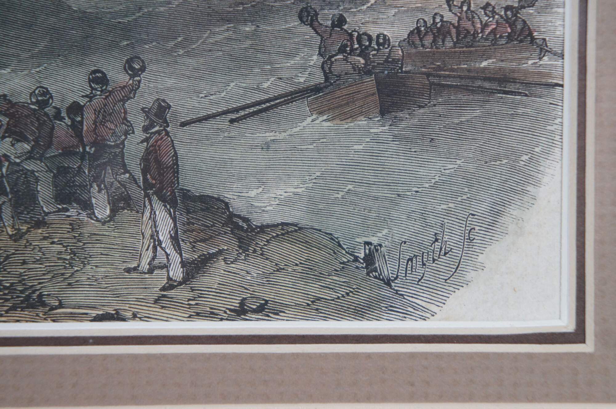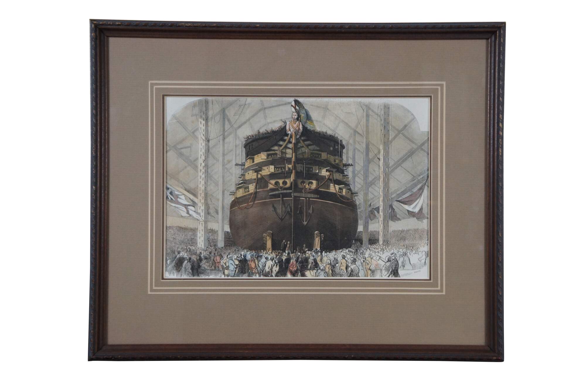 Pair of antique nautical / maritime hand colored engravings depicting “The Launch of the H.M.S. Royal Albert” from the Woolwich Dockyard and “The Launch of the Paramatta,” from the Illustrated London News, both signed in plate by illustrator / engraver, Frederick James Smyth.