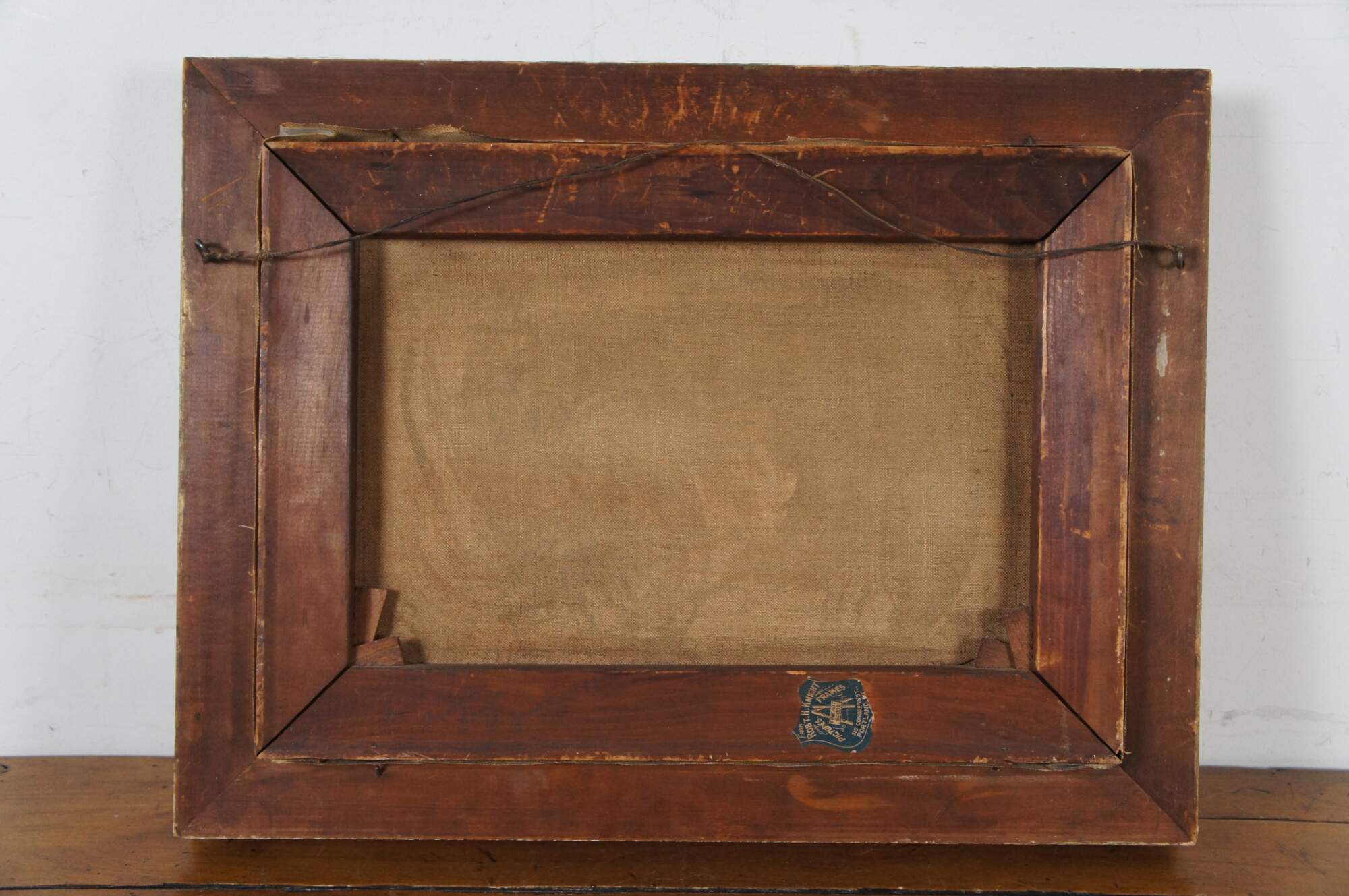 Early 20th century antique A.F. Dyer still life oil painting on canvas depicting a centerpiece bowl of fruit -peaches and grapes- in front of a glass goblet and a white and blue porcelain pitcher. From Robert H. Knight Fine Art Goods of Portland, Maine.