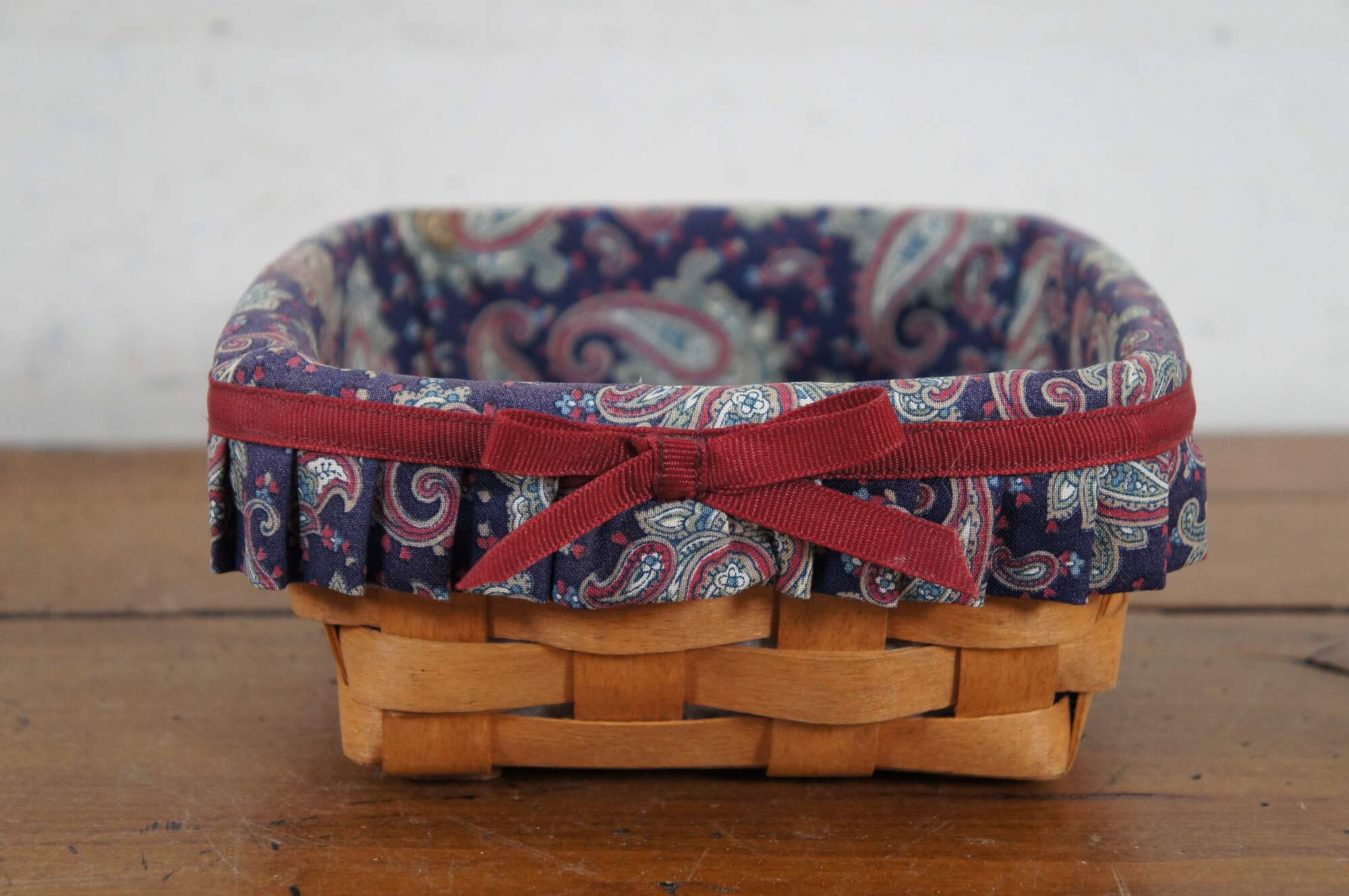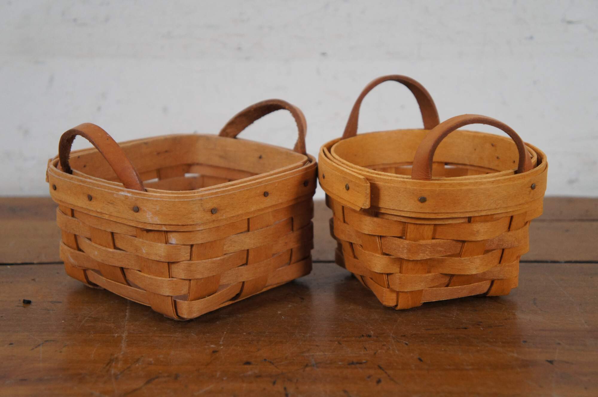 Lot of five vintage Longaberger hand woven maple baskets including on wall hanging mail basket with plastic liner, a square 12" waste basket, small square basket with paisley cotton liner, and two miniature baskets - one square and one round - with leather handles. Signed JDH 79, Chtl 1992, THR 1993, CEG 1995, CSJ 1999.