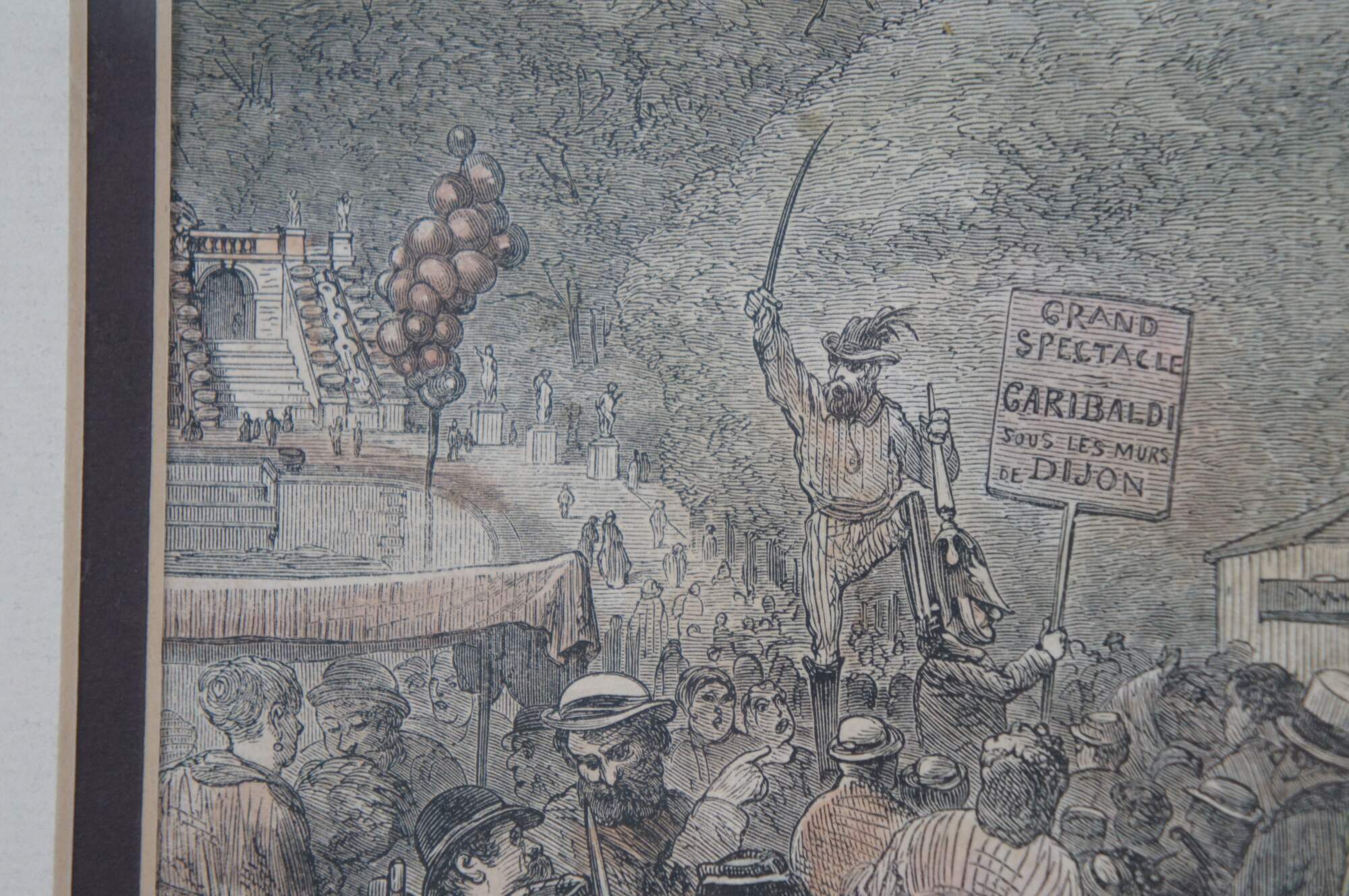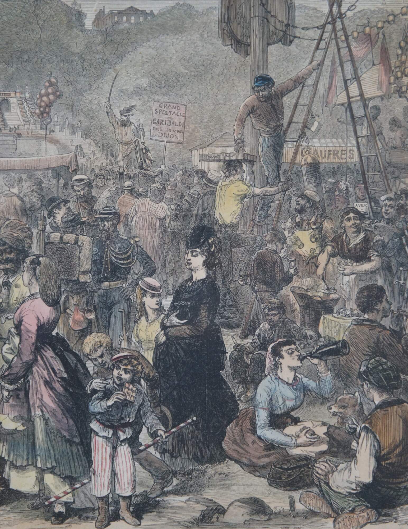 Framed antique hand colored wood engraving depicting "The Fair of St Cloud Near Paris" by Felix Regamey, showing a crowded throng of people enjoying a festival. Engraved by J.W. Palmer, 1871. Framed in a distressed gilded floral frame. This image comes from the Illustrated London News.