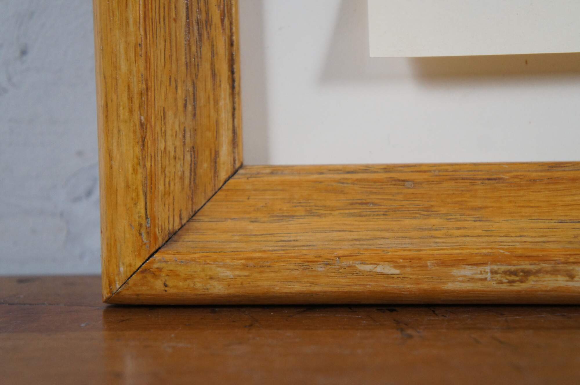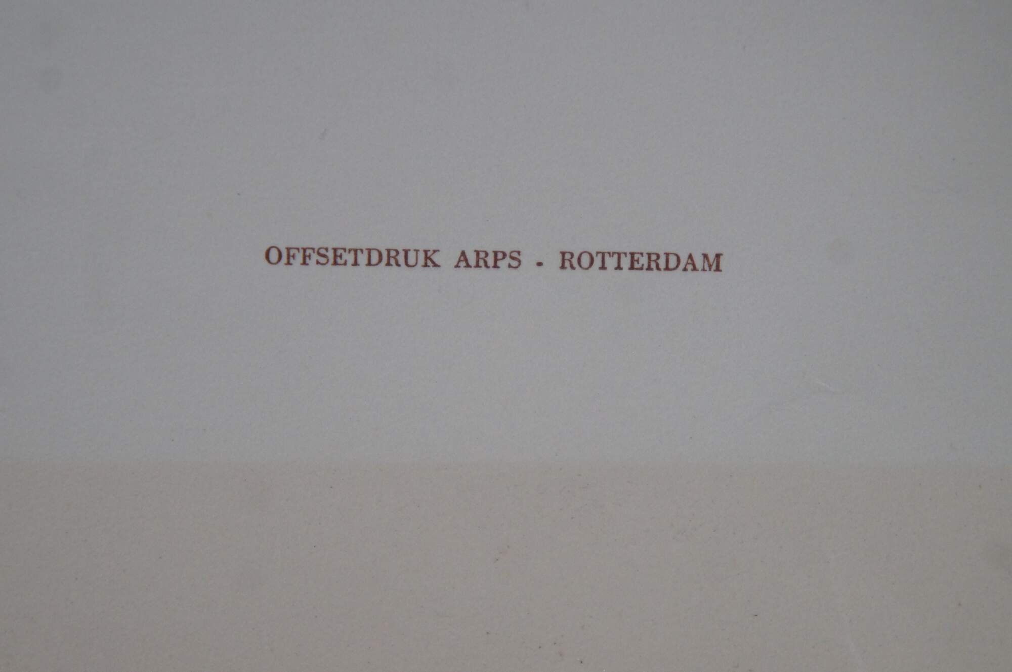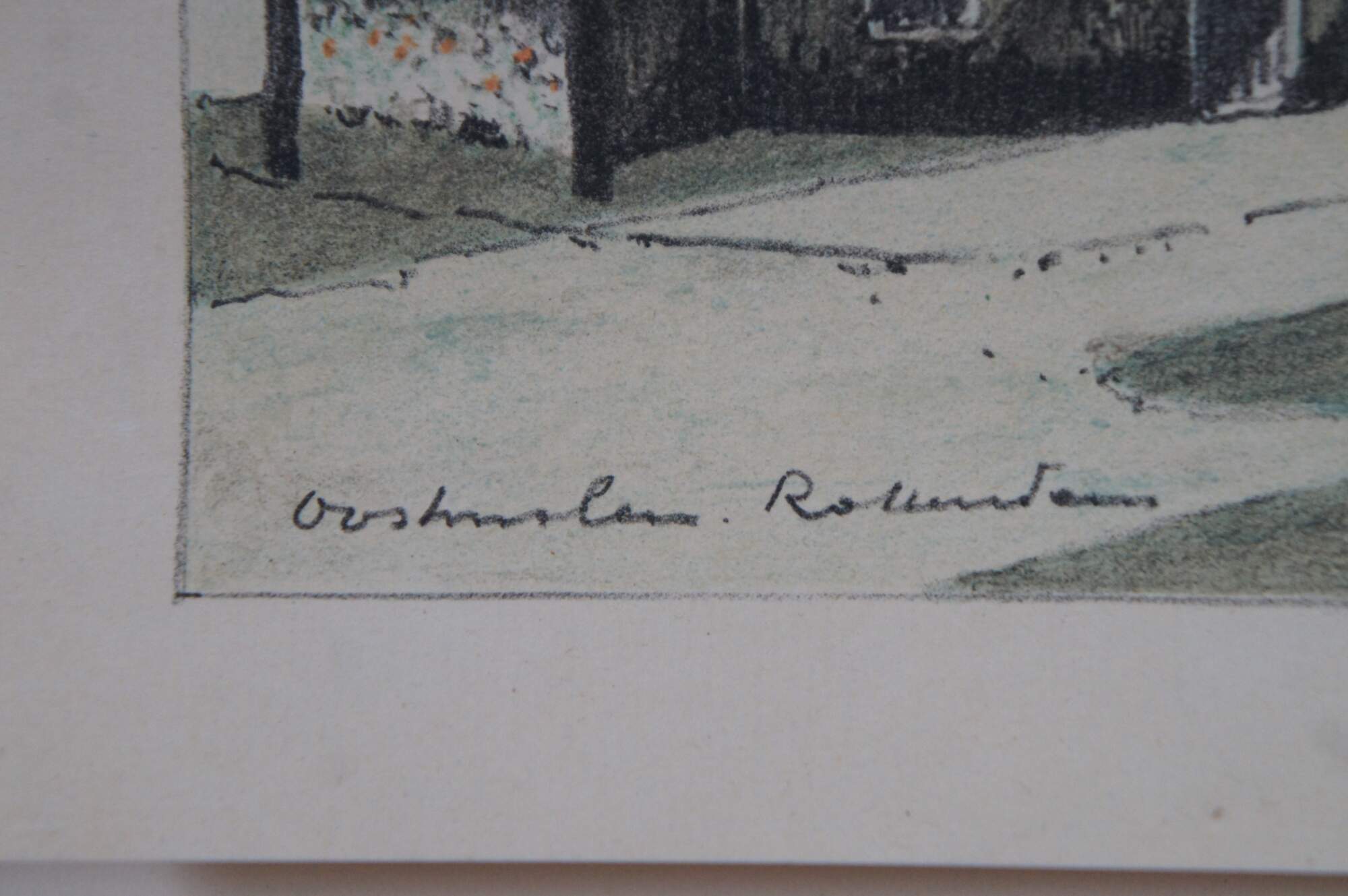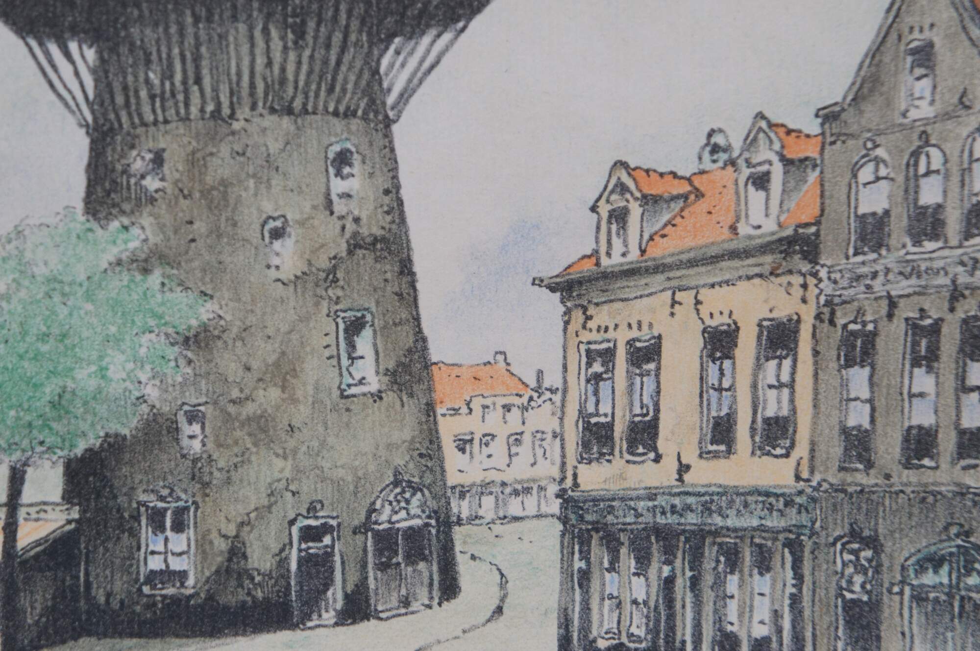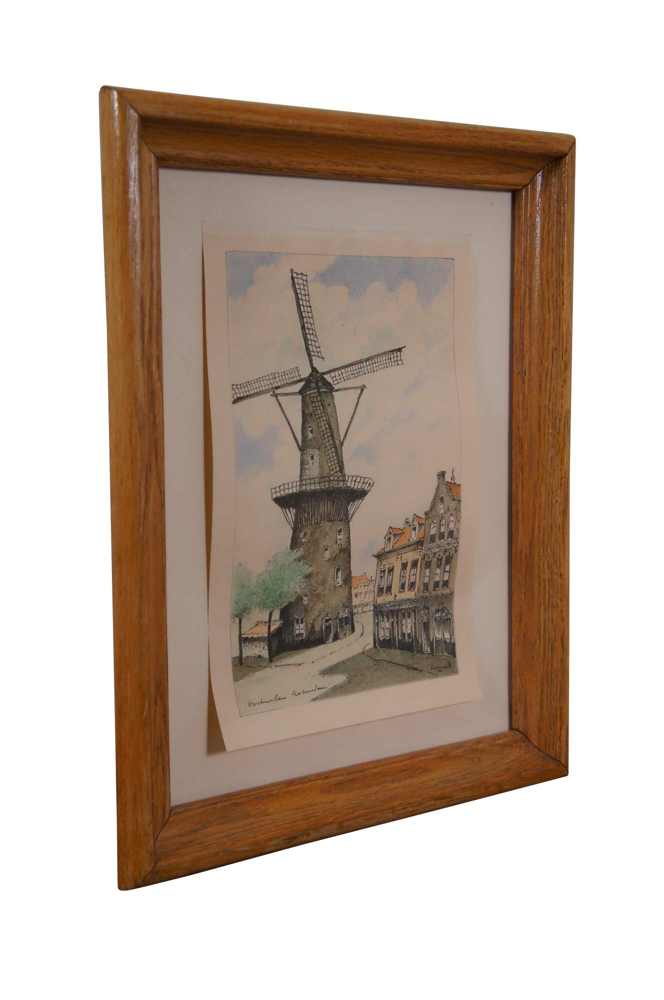 Framed vintage offset lithograph print depicting a windmill in the streets of Rotterdam, The Netherlands. Framed in a simple beveled wood frame. The original titled "Mill at Rotterdam