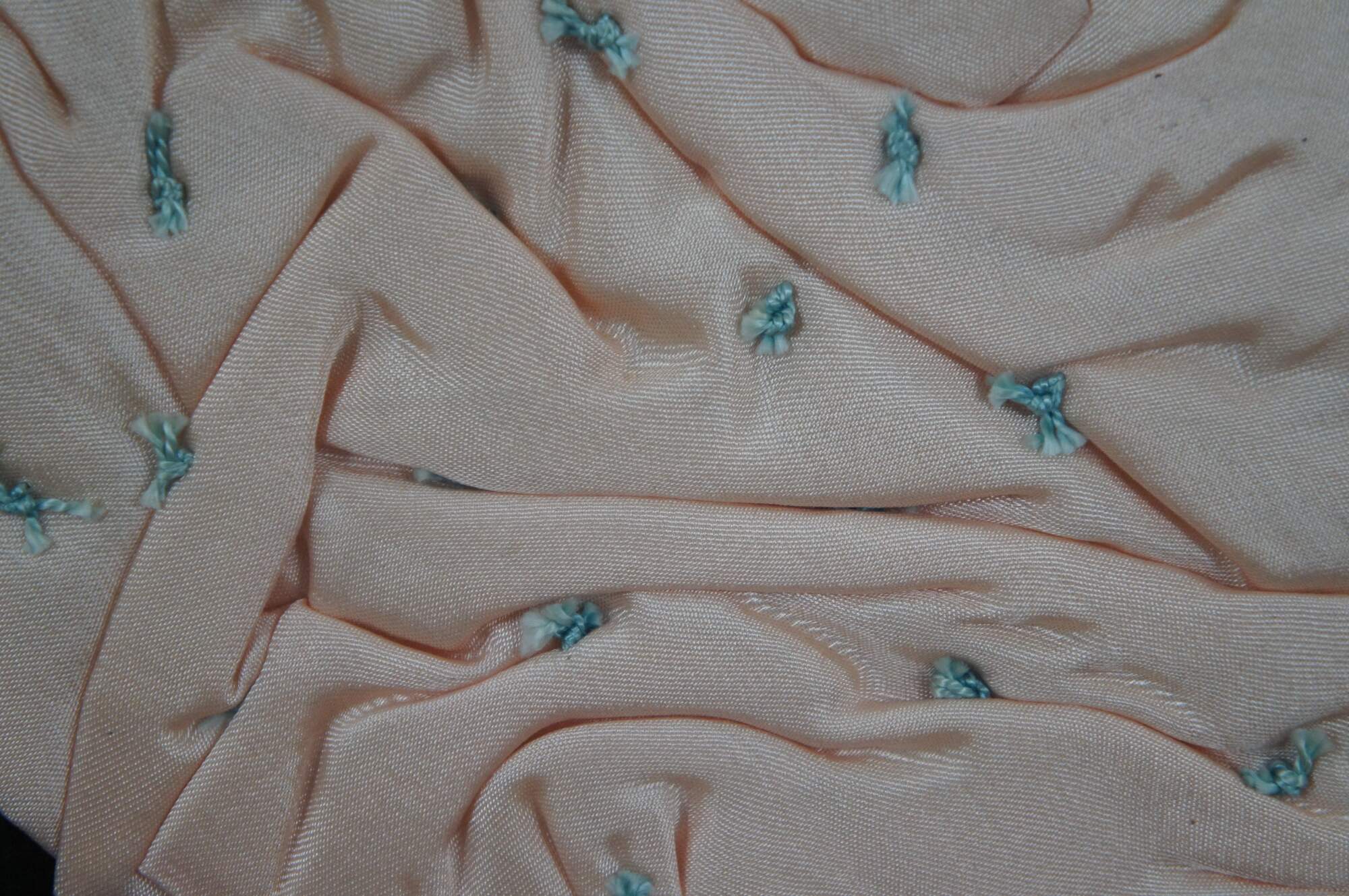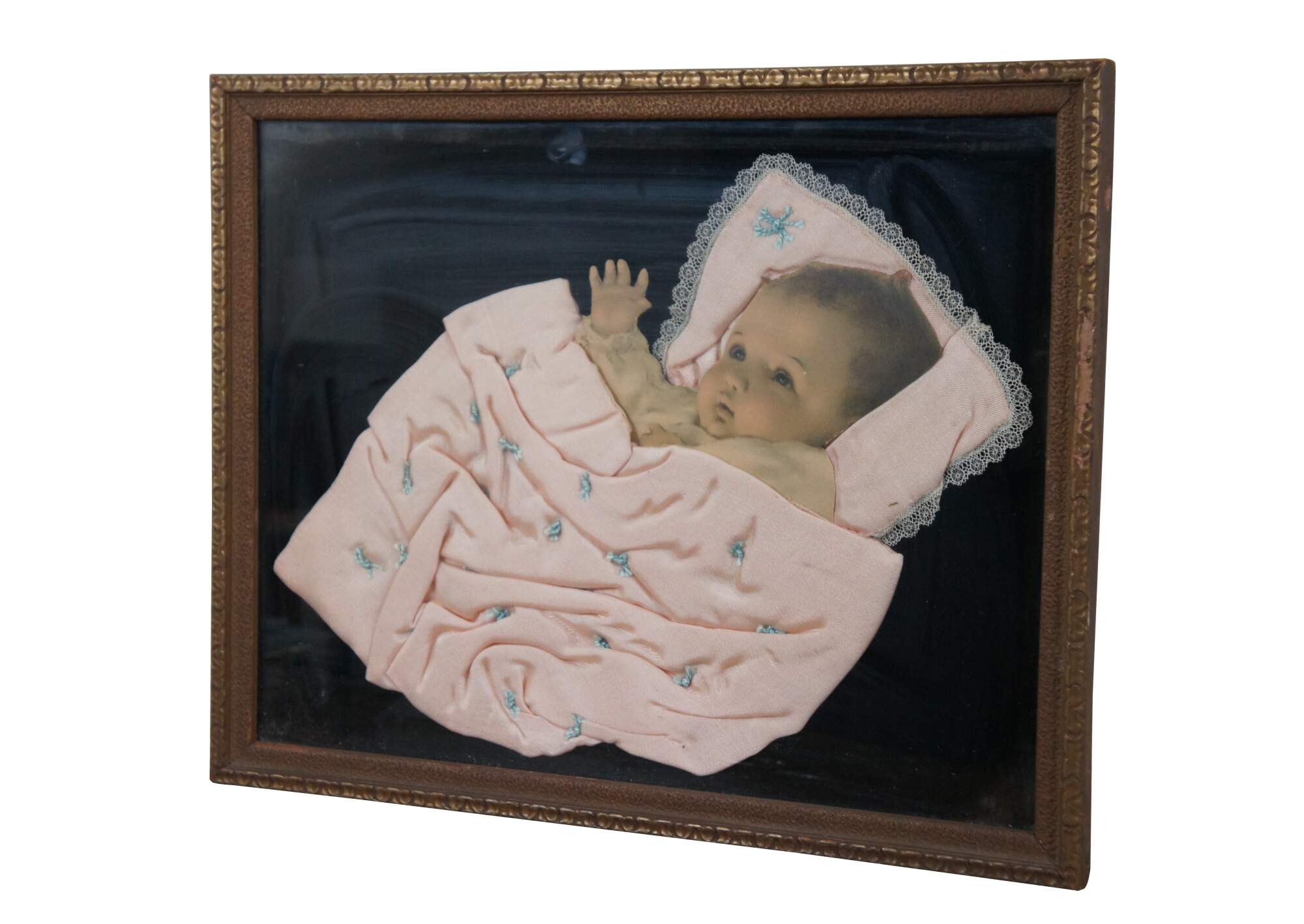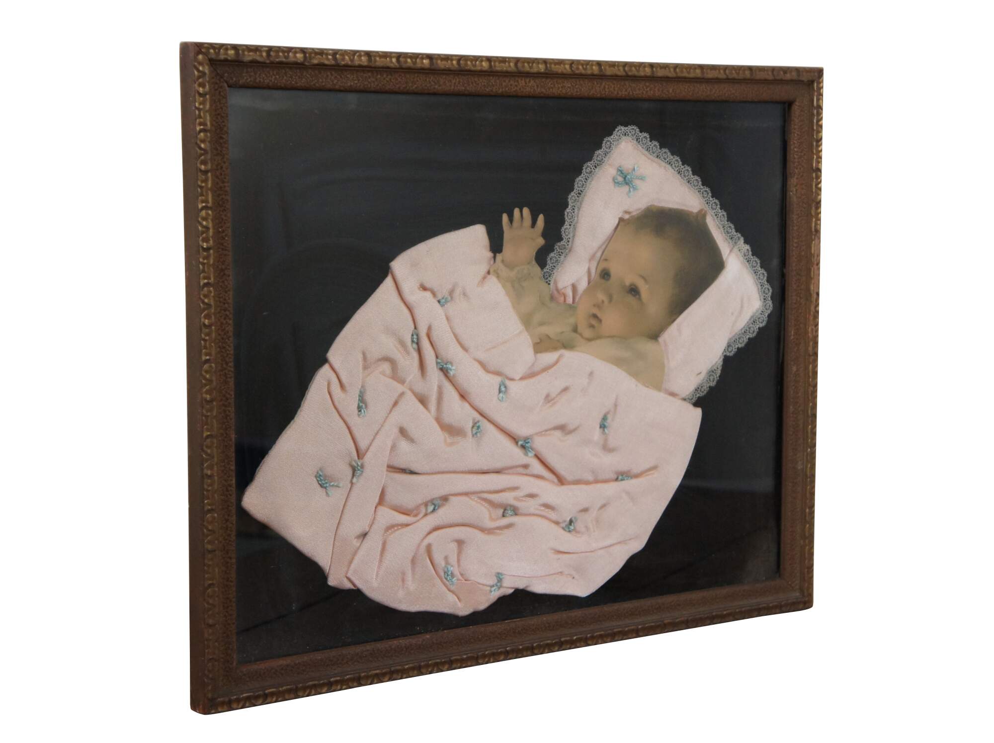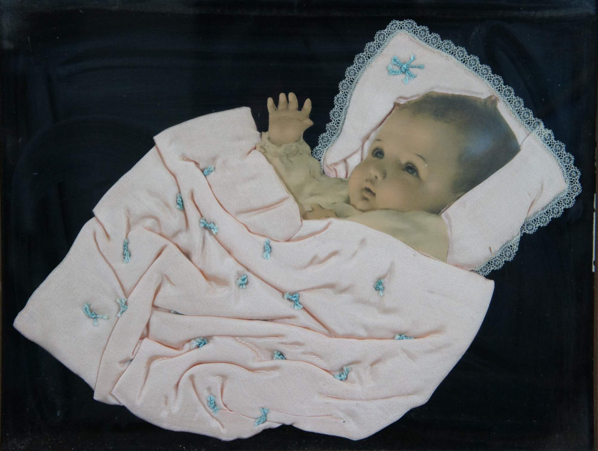 Early 20th century framed pink baby blanket with stitched blue tufting and lace trim, nestled around a die cut photograph of a baby, mounted on a backdrop of black velvet. Possibly a piece of memorial / mourning art, purportedly popular from the Victorian era through the 1930's. Framed in a brown wood frame with semi abstract carved details.