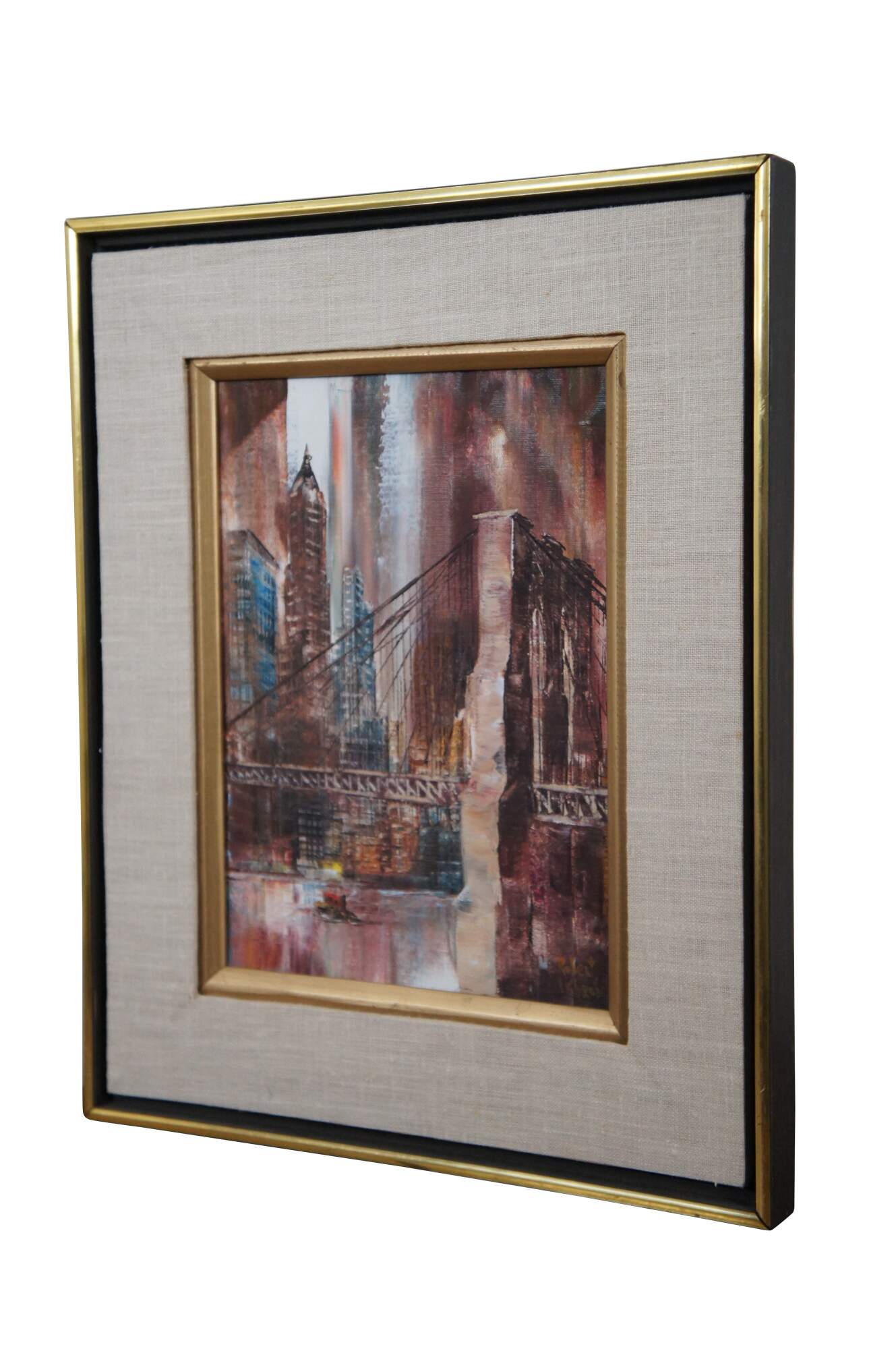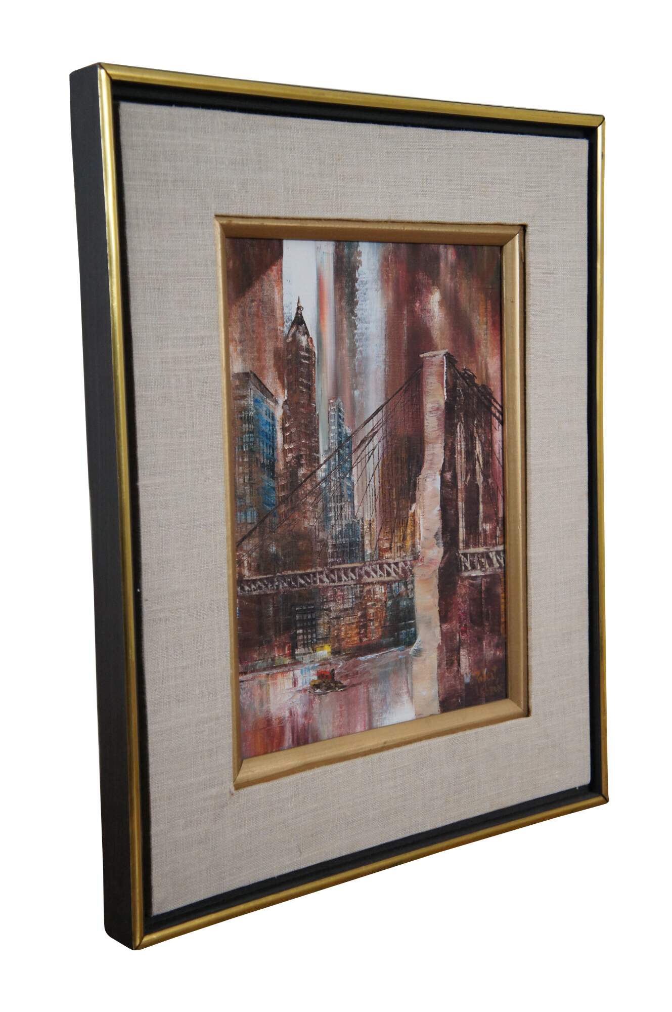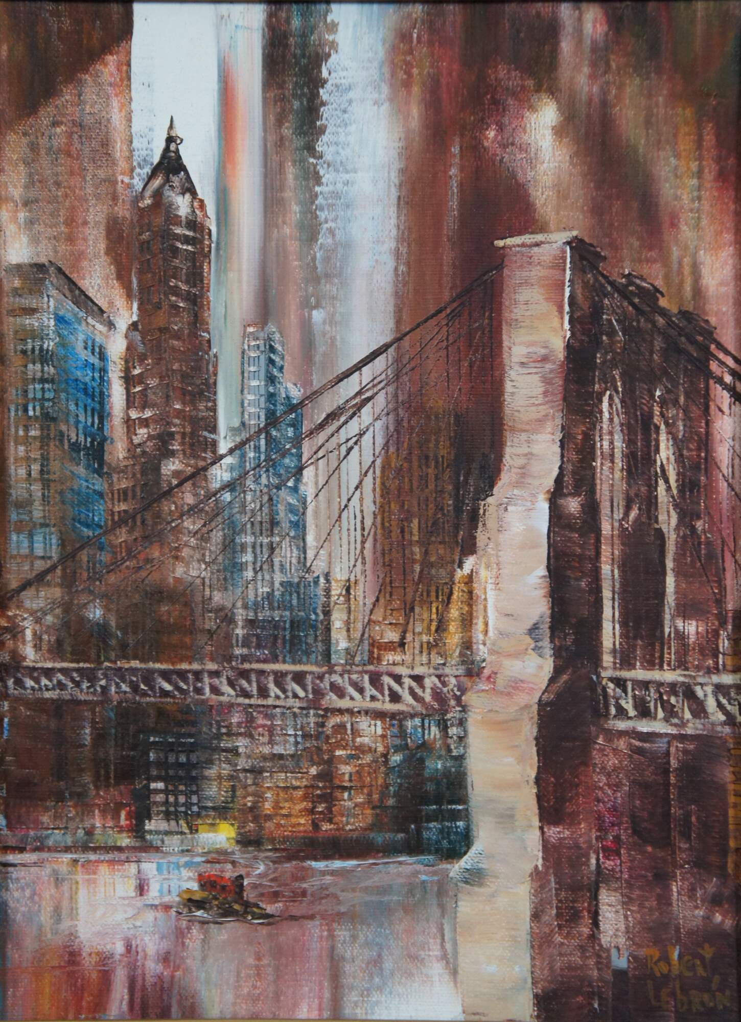 Vintage oil on canvas expressionist / semi-abstract cityscape painting of New York City and the Brooklyn Bridge by Robert Lebron. Signed in lower right. Framed in a gilded double frame with an off-white linen mat.