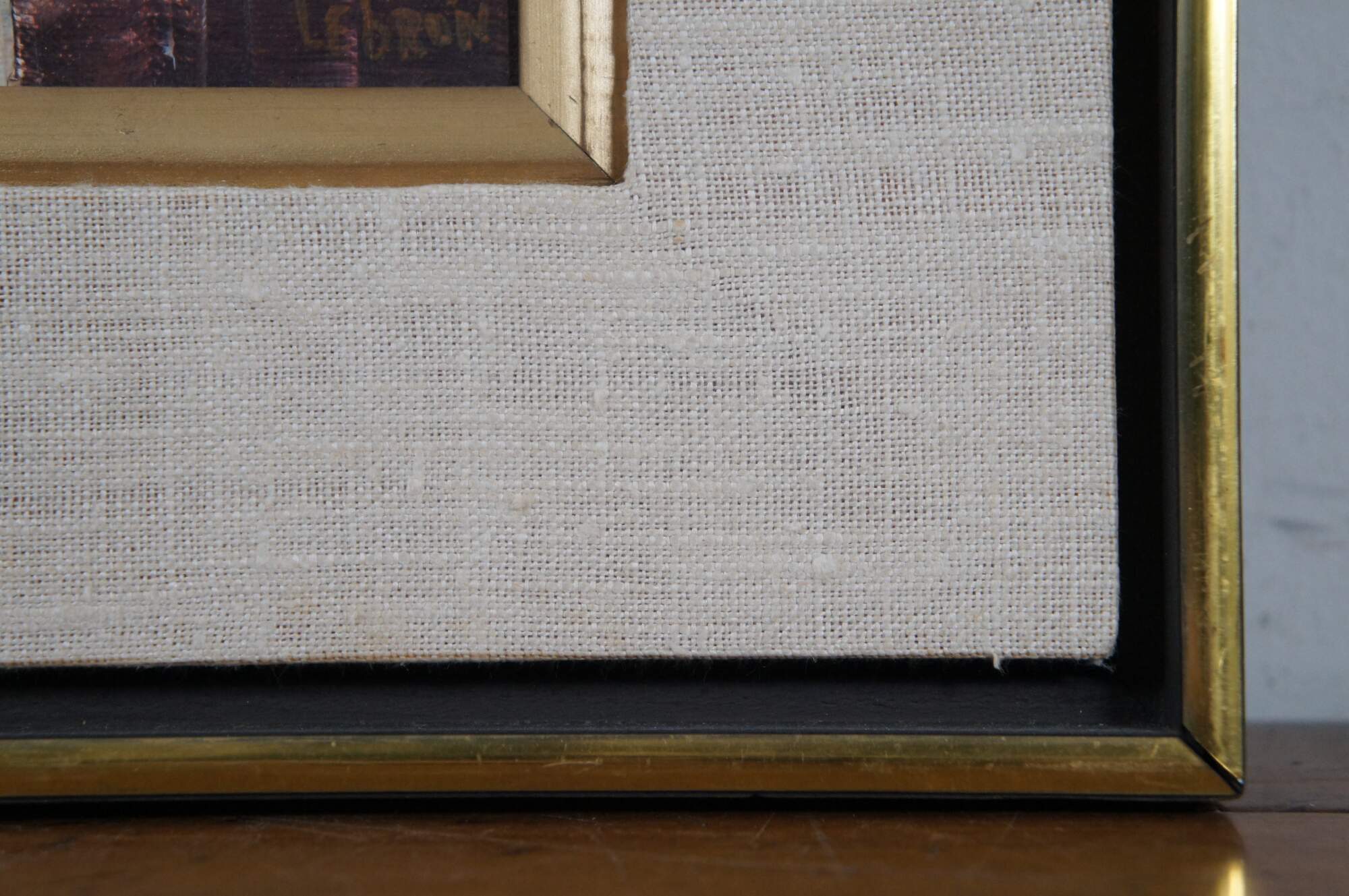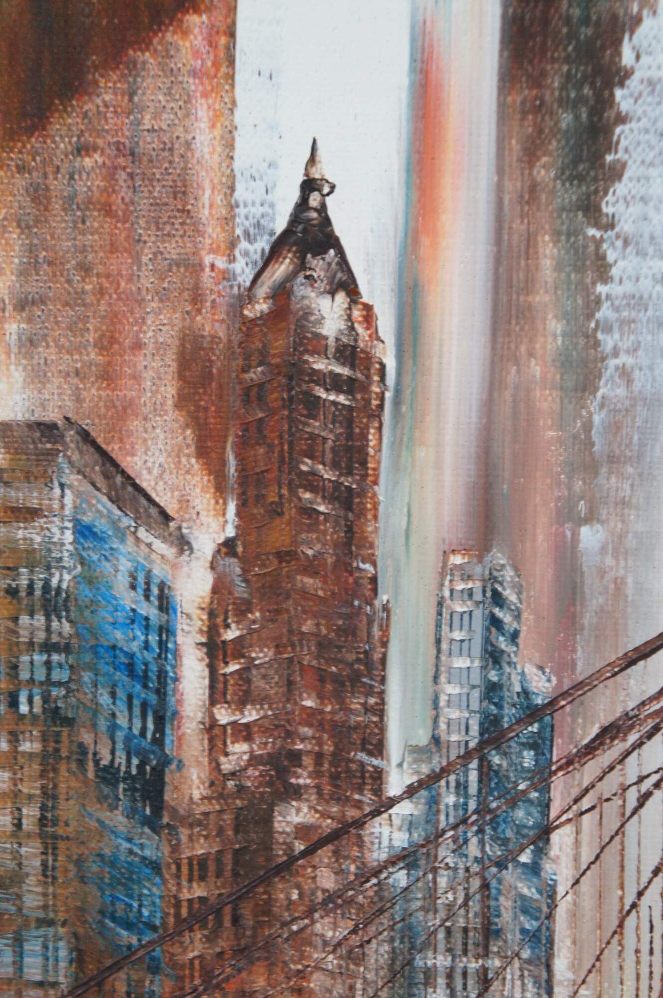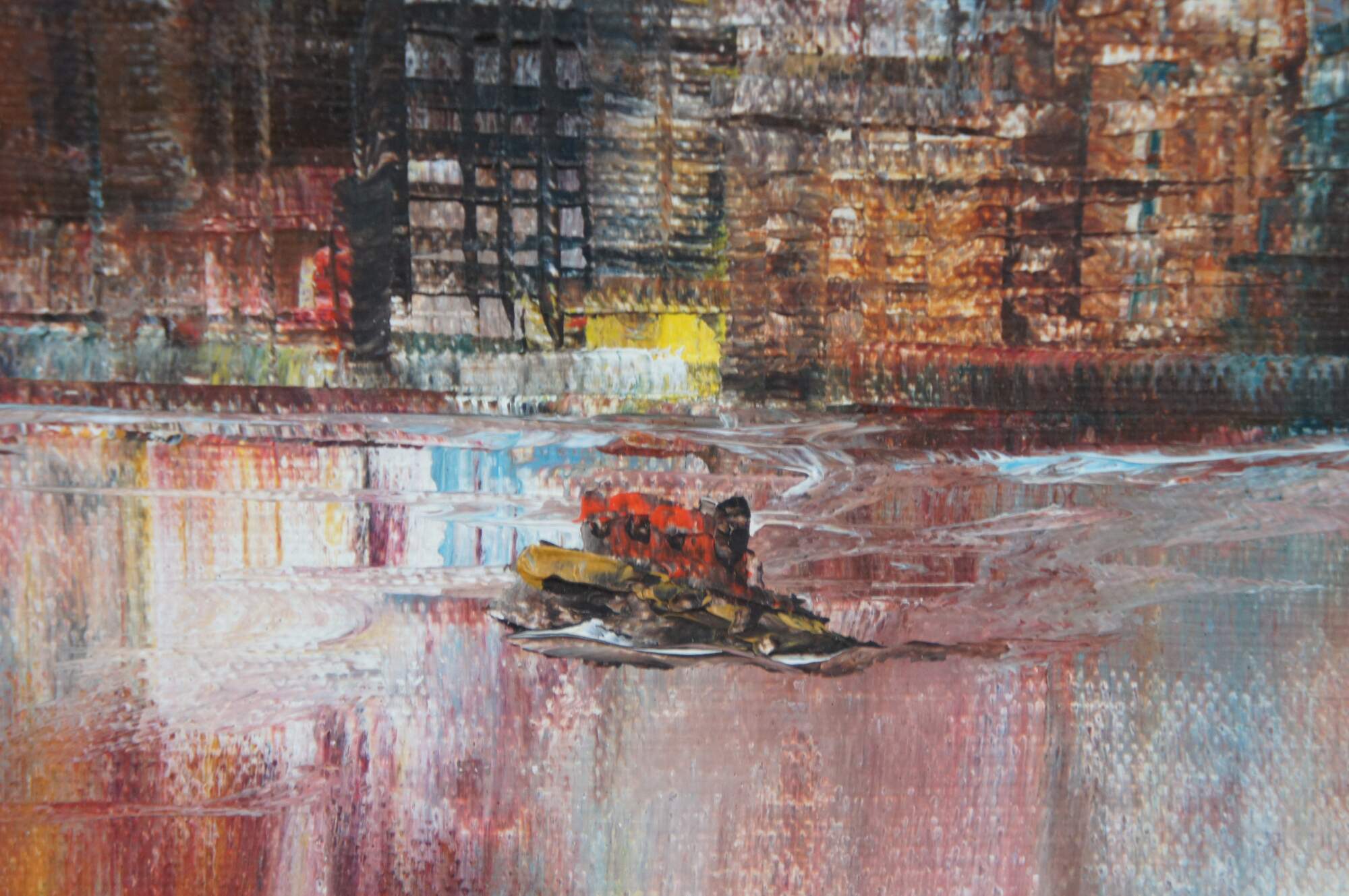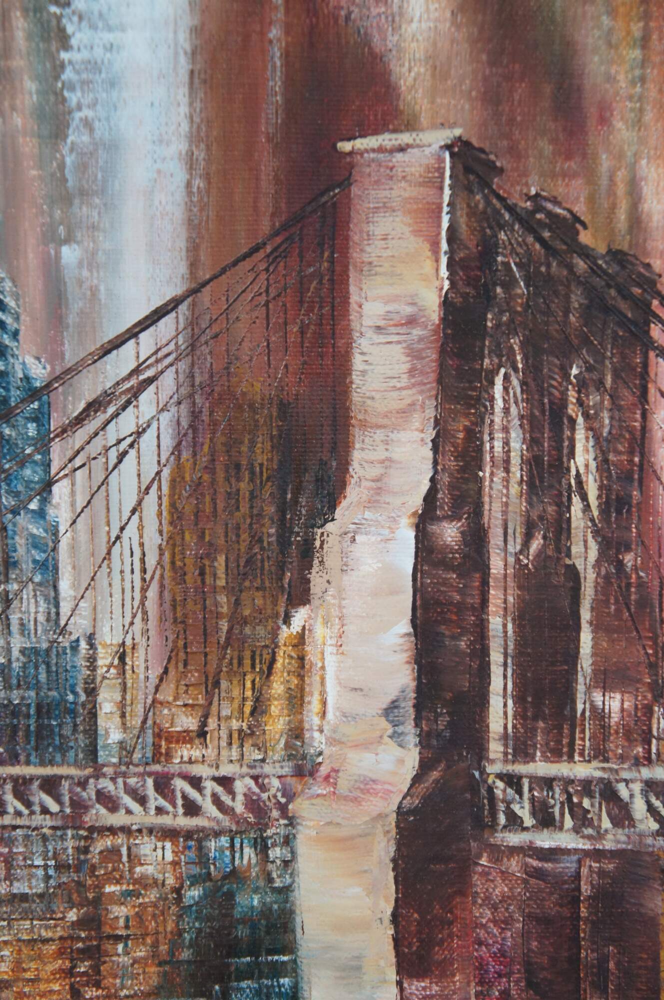 Vintage oil on canvas expressionist / semi-abstract cityscape painting of New York City and the Brooklyn Bridge by Robert Lebron. Signed in lower right. Framed in a gilded double frame with an off-white linen mat.
