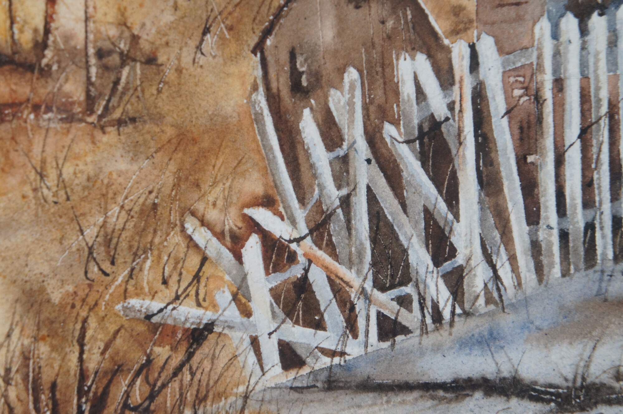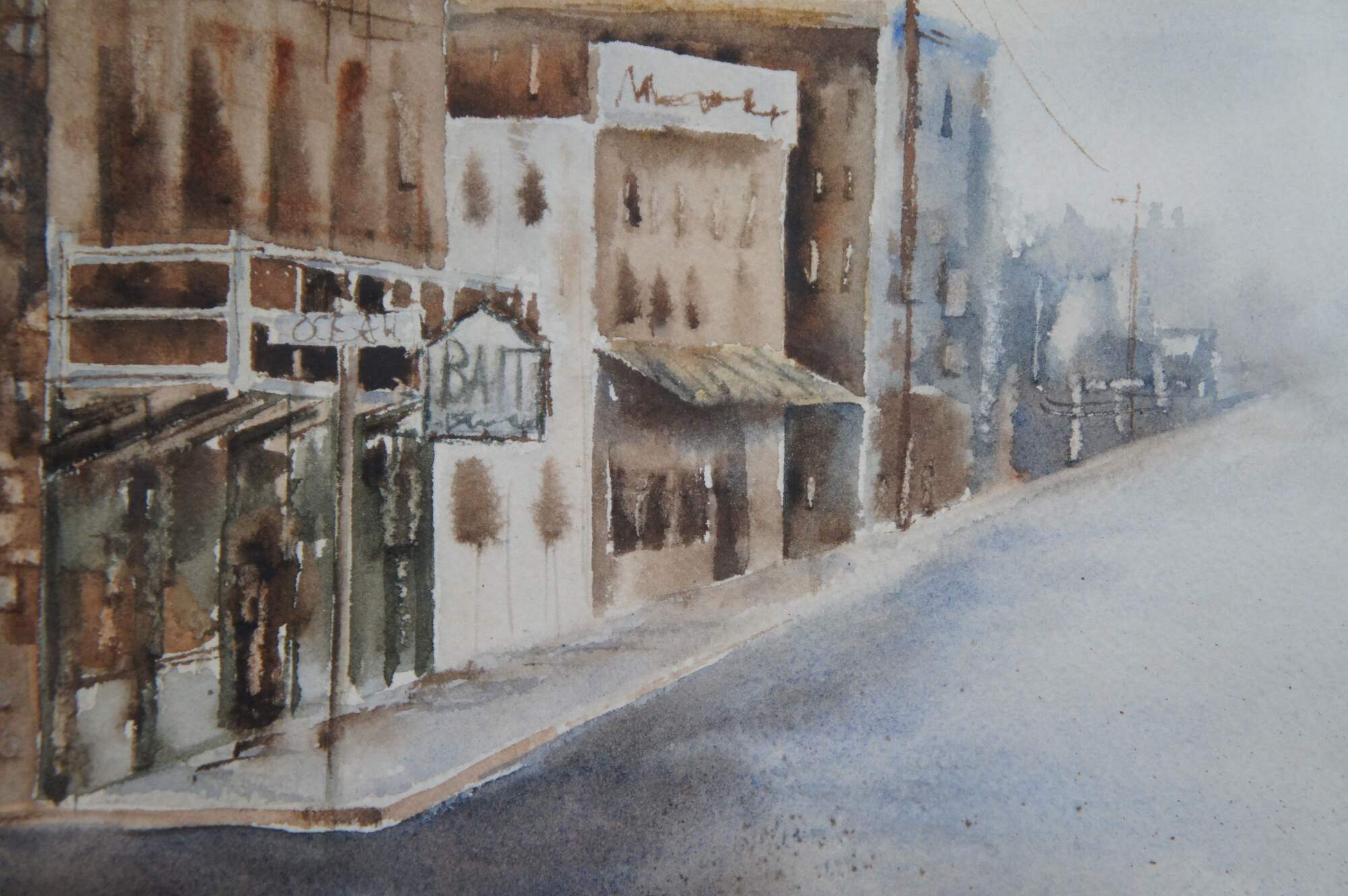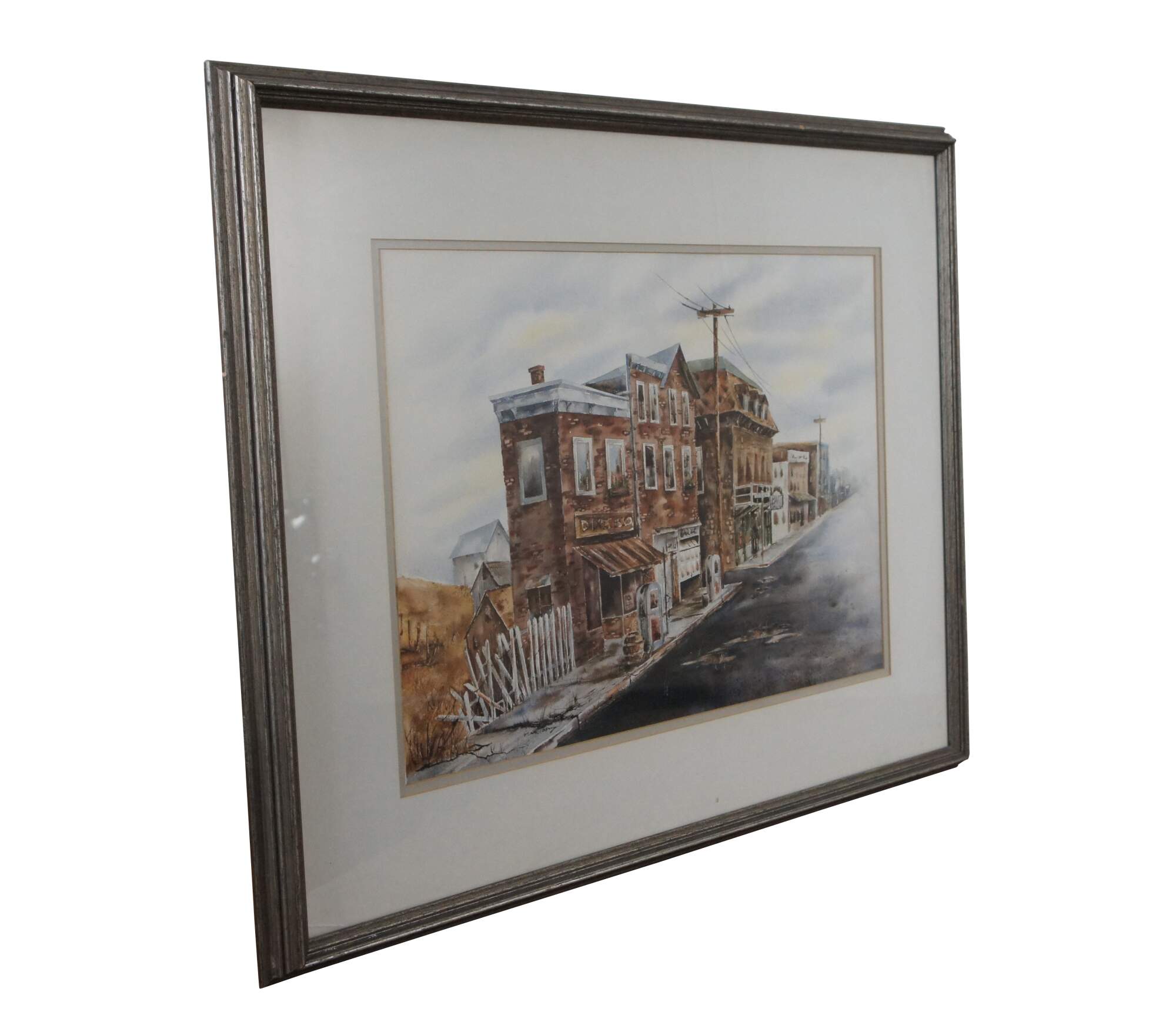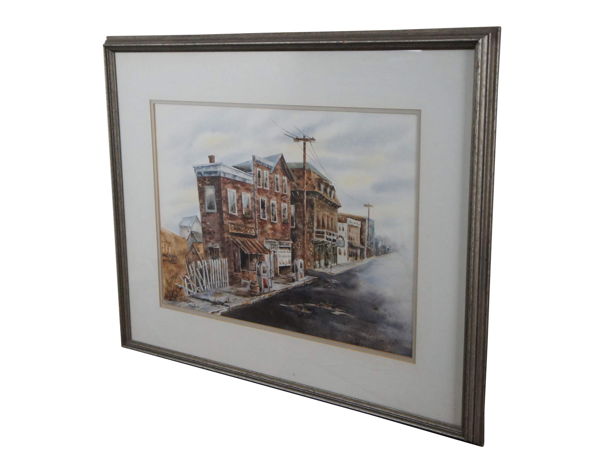 Vintage watercolor painting depicting a run down stretch of Dixie Highway or US 150. No signature. Framed in a lightly distressed, silver gilt frame with raised bevel.