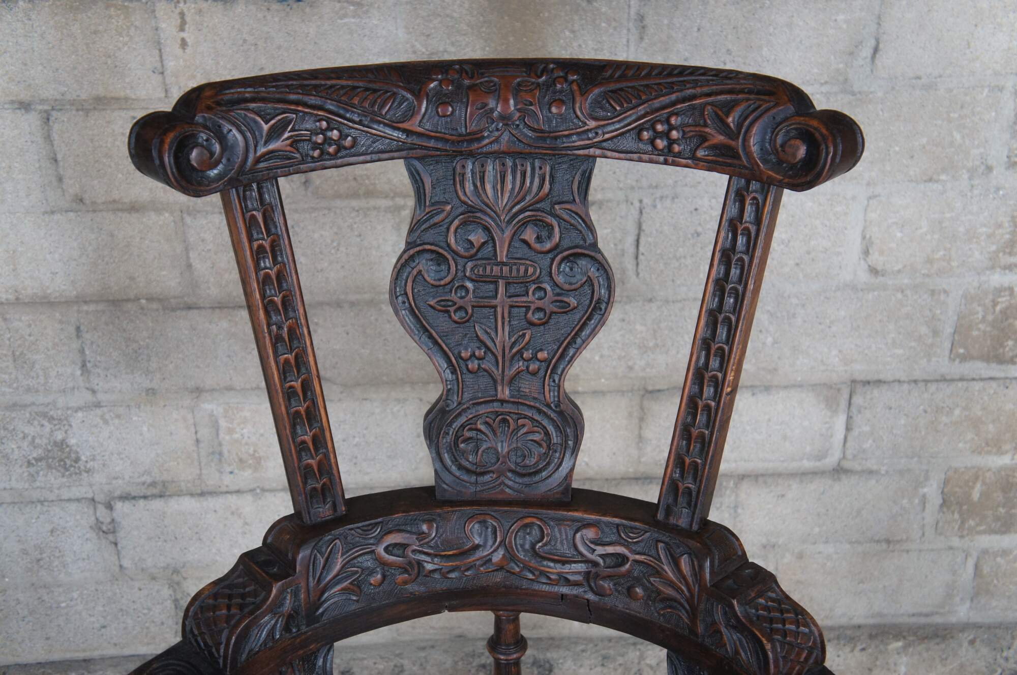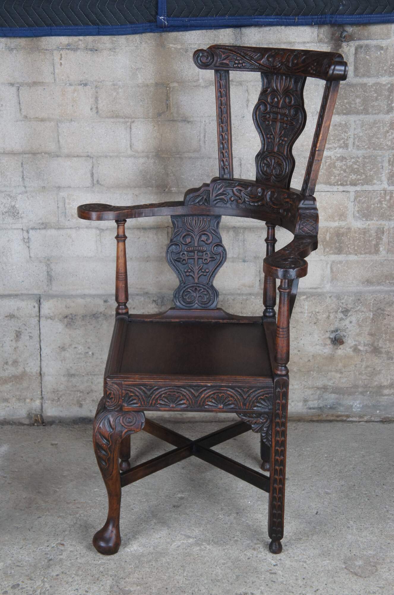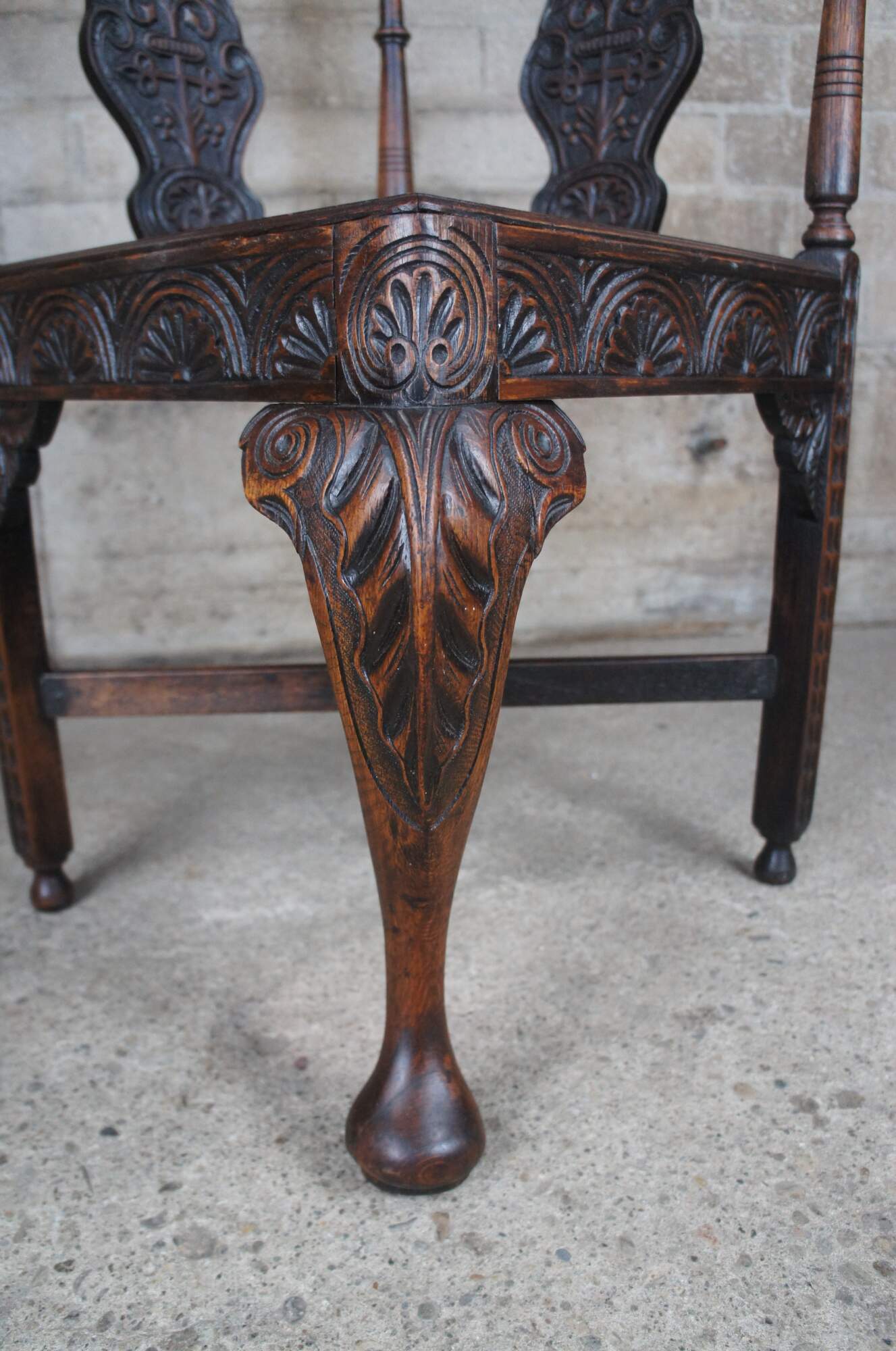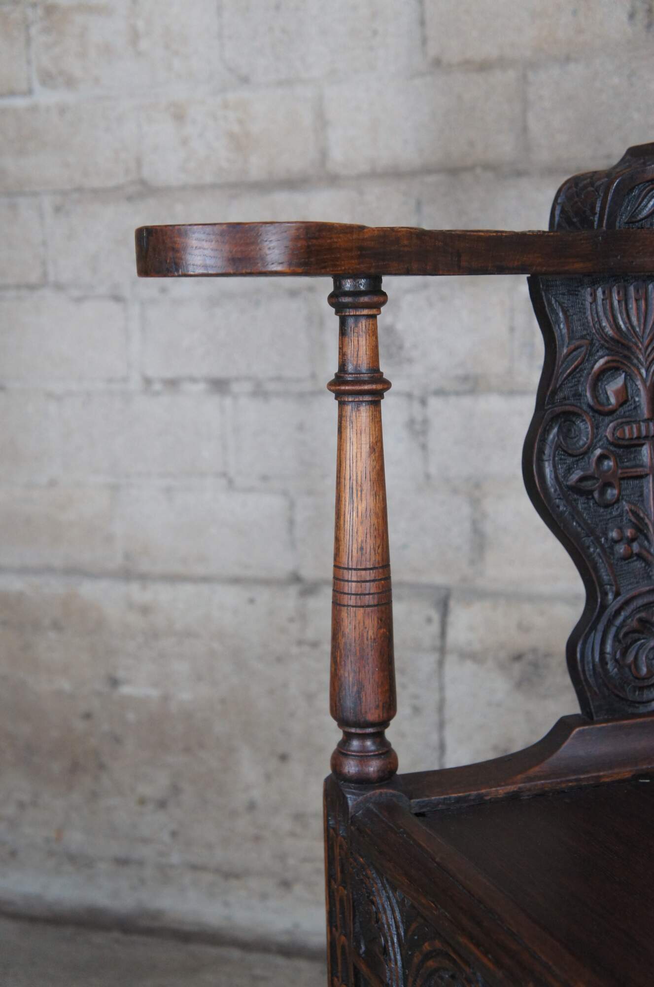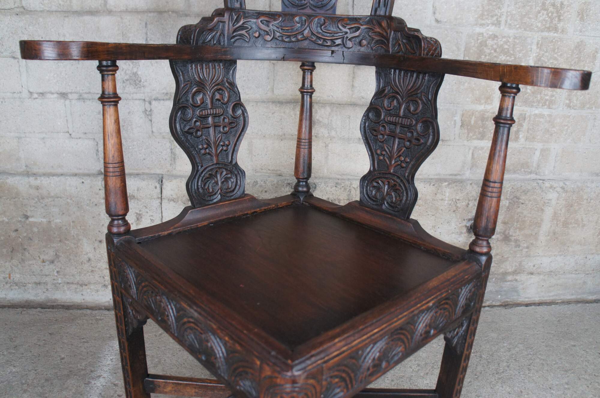 Exceedingly Rare English Yorkshire Wainscot High back corner armchair, circa 17th century. Made of oak with an impressive hand carved back that features a whimsical figure along the crest over a foliate and berries motif, C and S scrolls, turned supports, and hand tooling throughout. The chairs apron showcases a scalloped shell at the corner between an arcade of palladiums over a flower and lower leafy spandrels. The chair is supported by four legs with a pronounced central cabriole leg and acanthus carved knee leading to pad foot. Includes a leather removable seat cushion.
