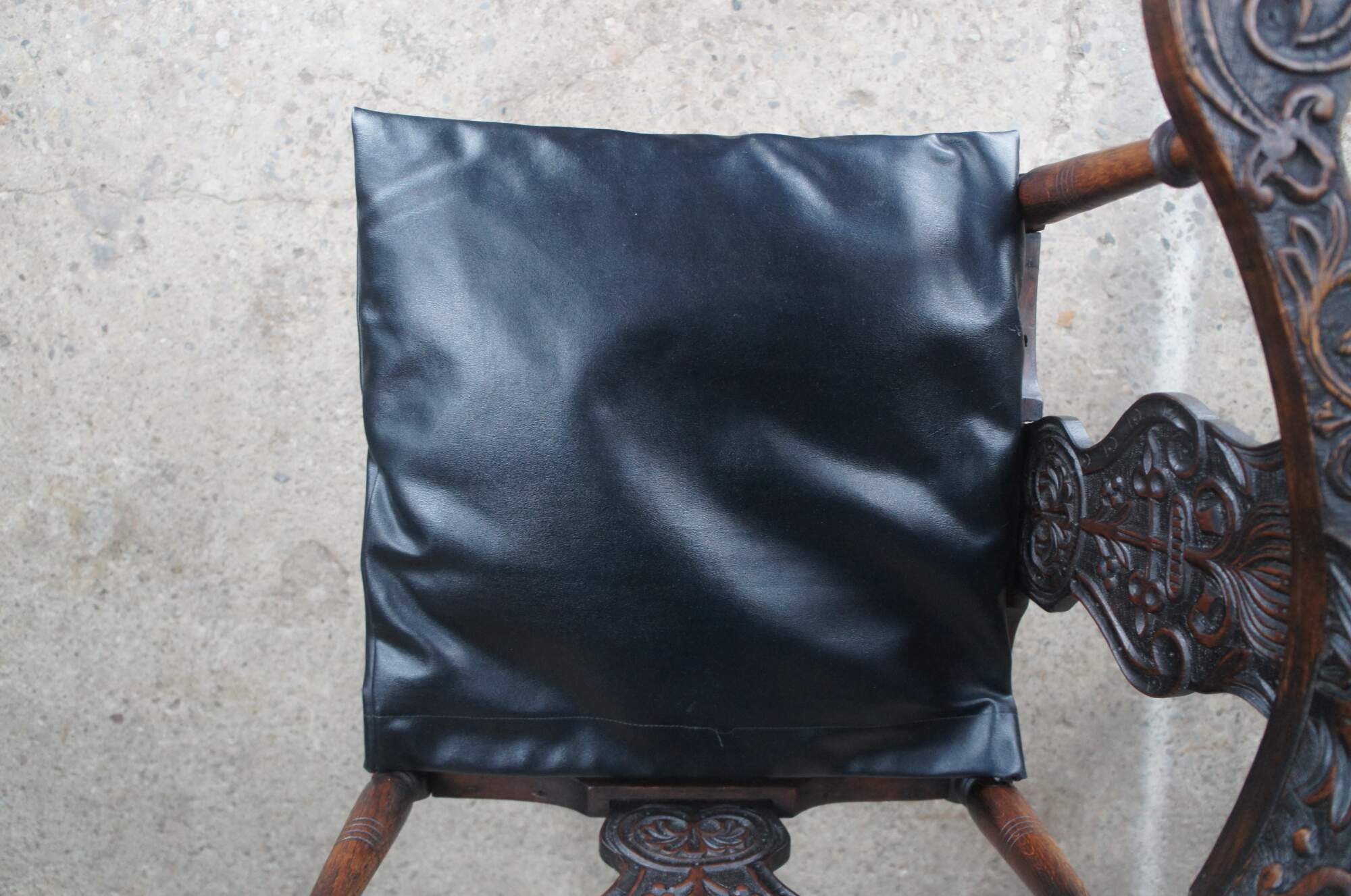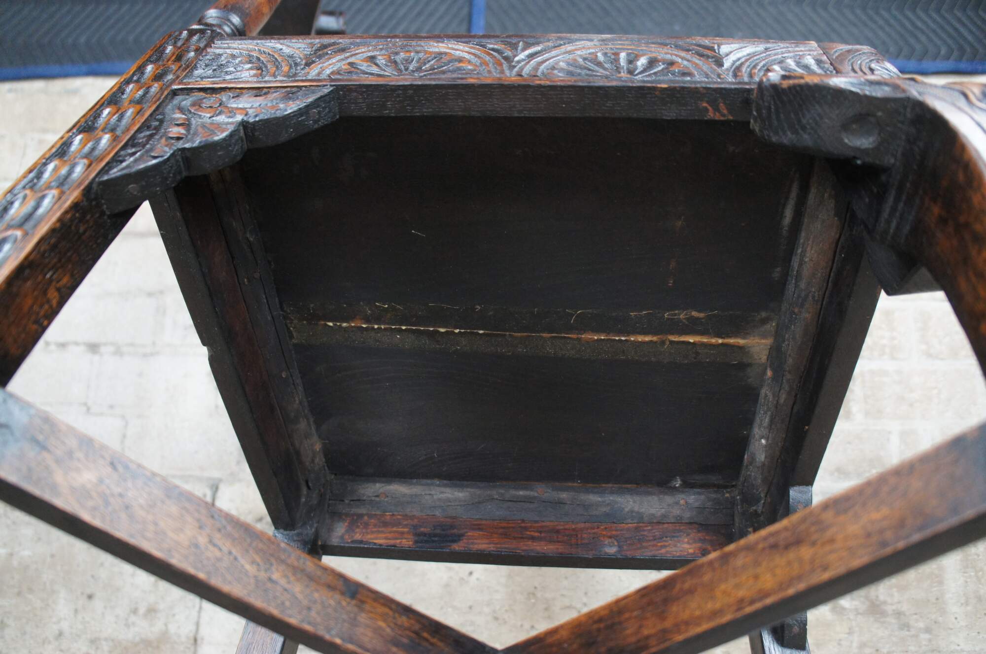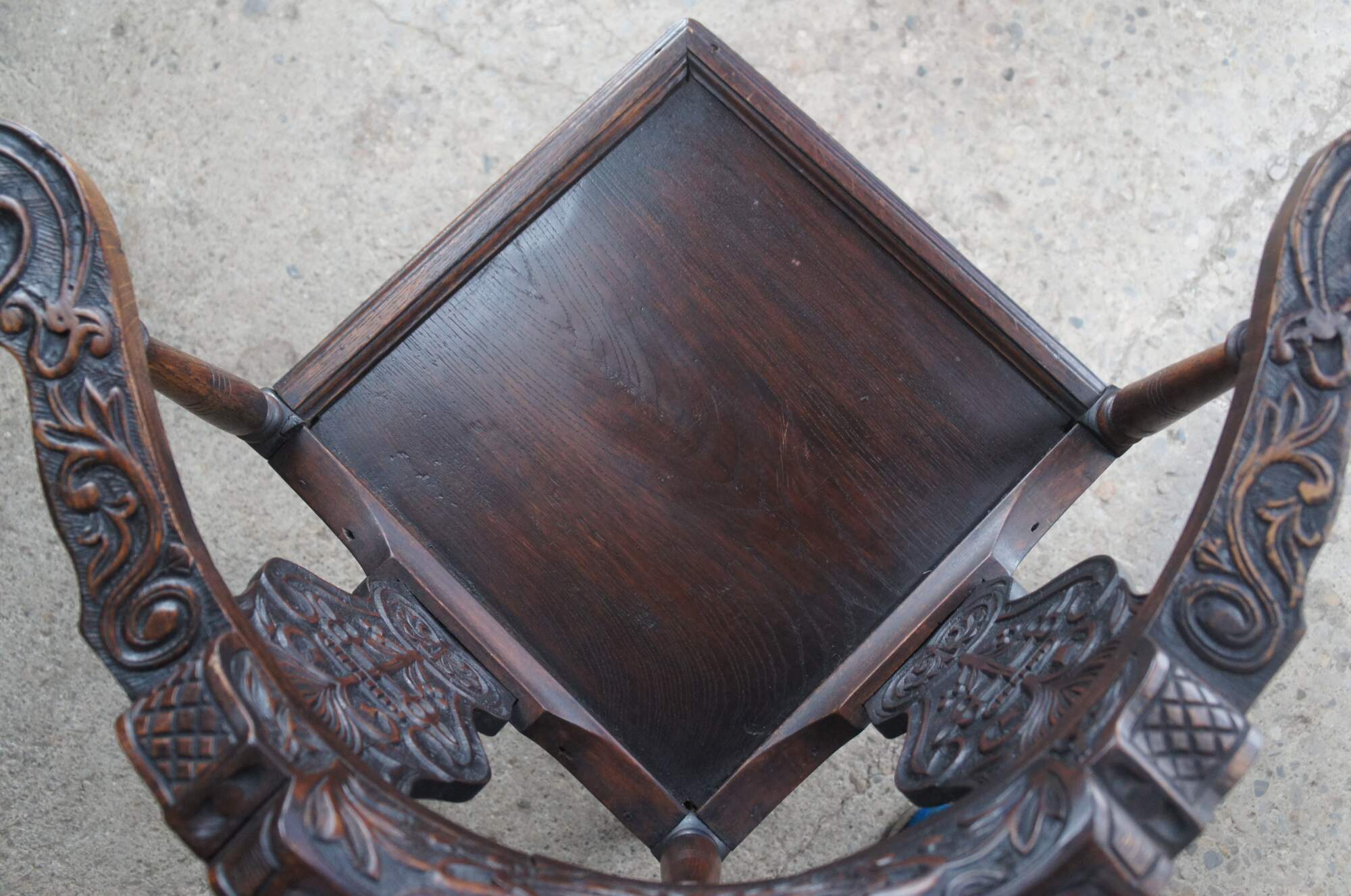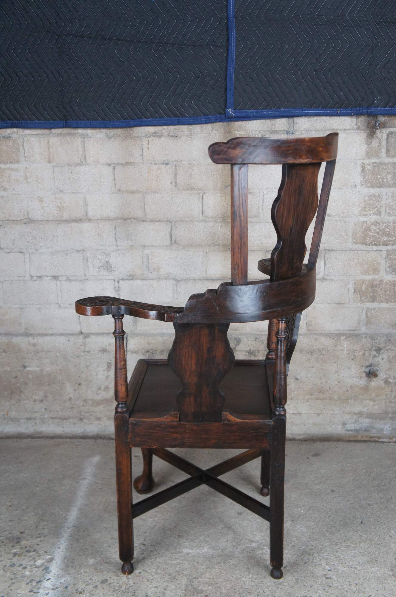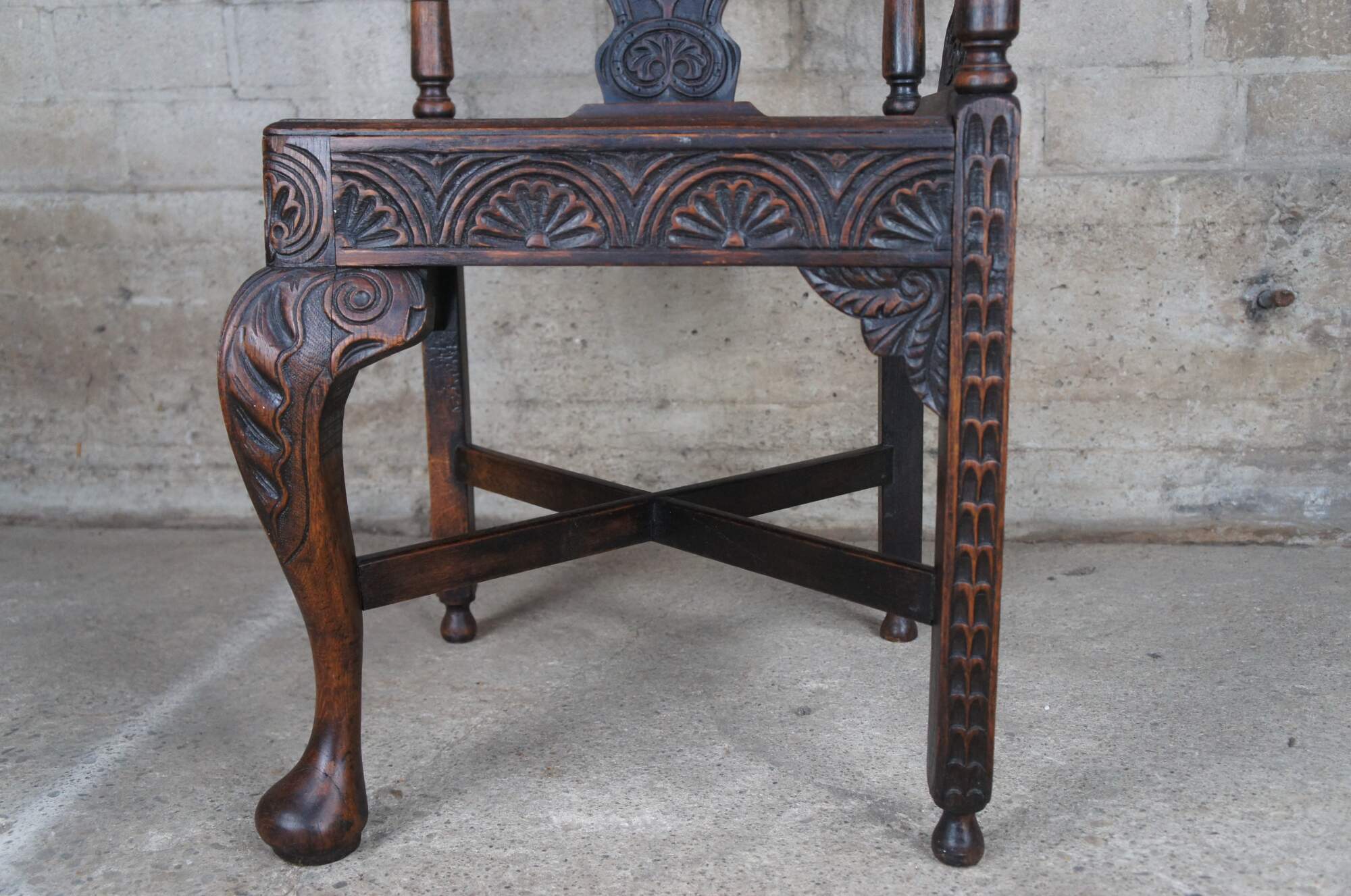 Exceedingly Rare English Yorkshire Wainscot High back corner armchair, circa 17th century. Made of oak with an impressive hand carved back that features a whimsical figure along the crest over a foliate and berries motif, C and S scrolls, turned supports, and hand tooling throughout. The chairs apron showcases a scalloped shell at the corner between an arcade of palladiums over a flower and lower leafy spandrels. The chair is supported by four legs with a pronounced central cabriole leg and acanthus carved knee leading to pad foot. Includes a leather removable seat cushion.