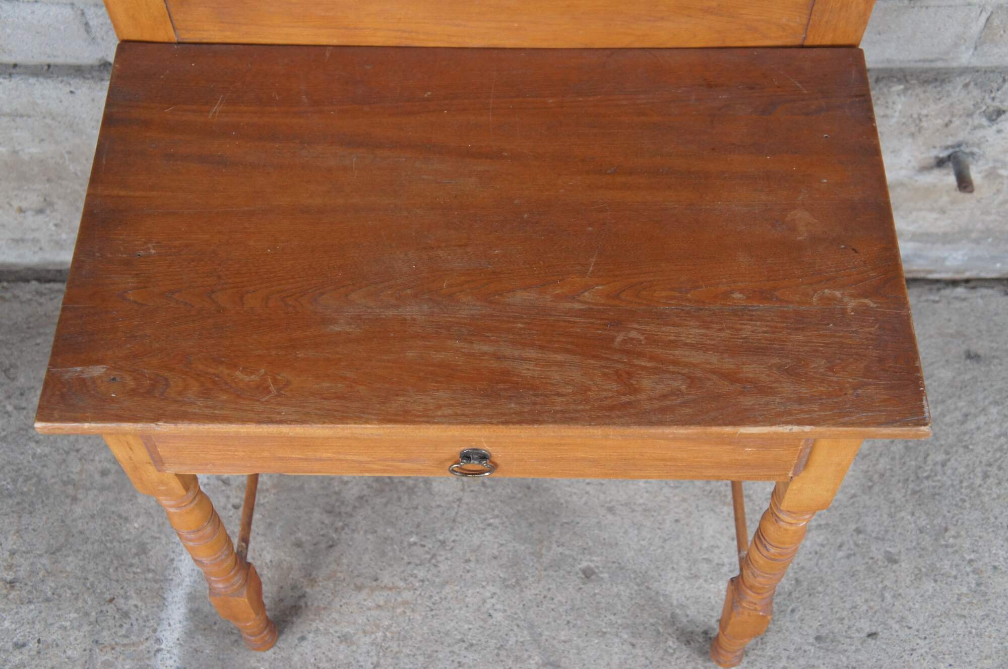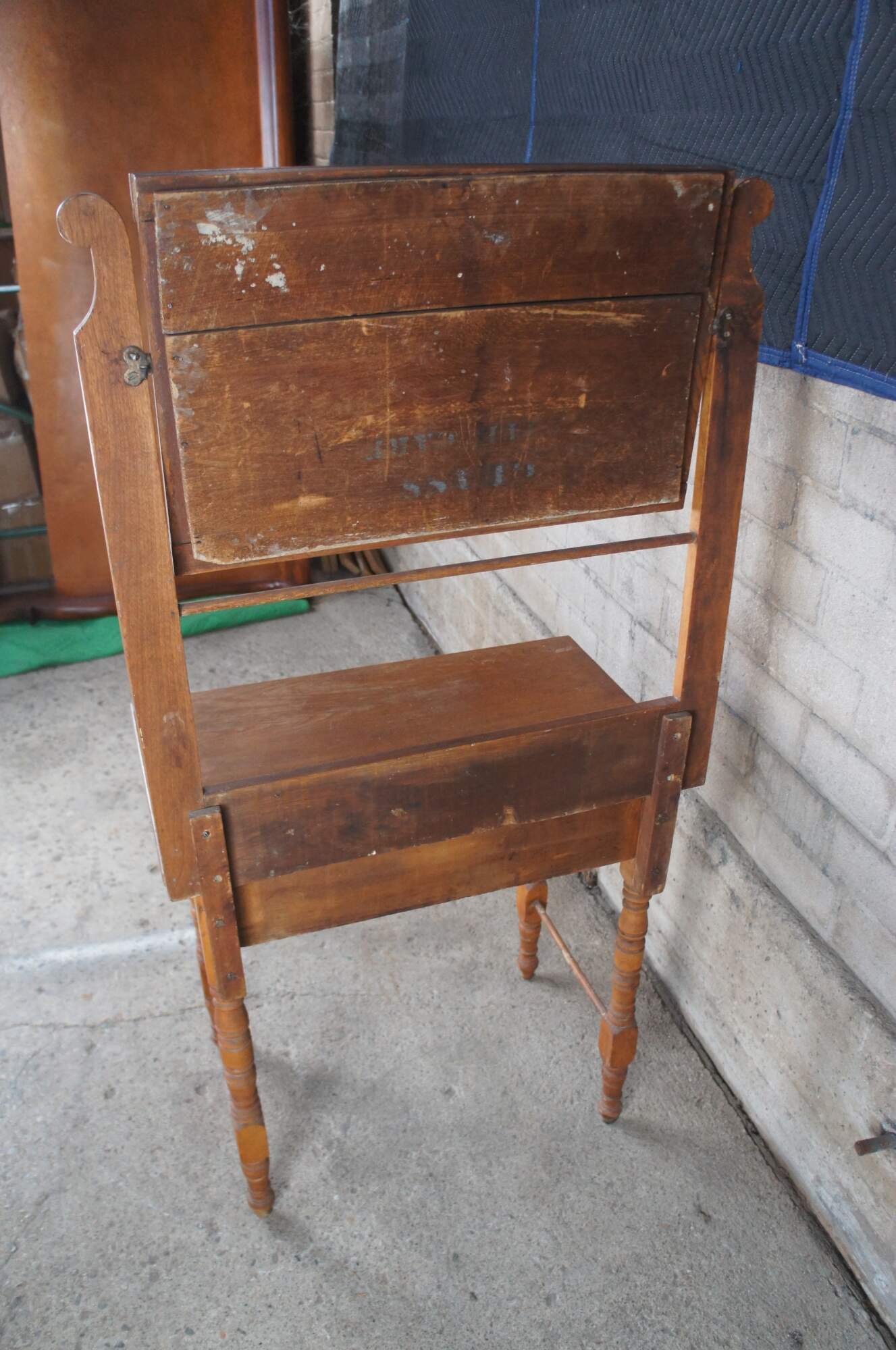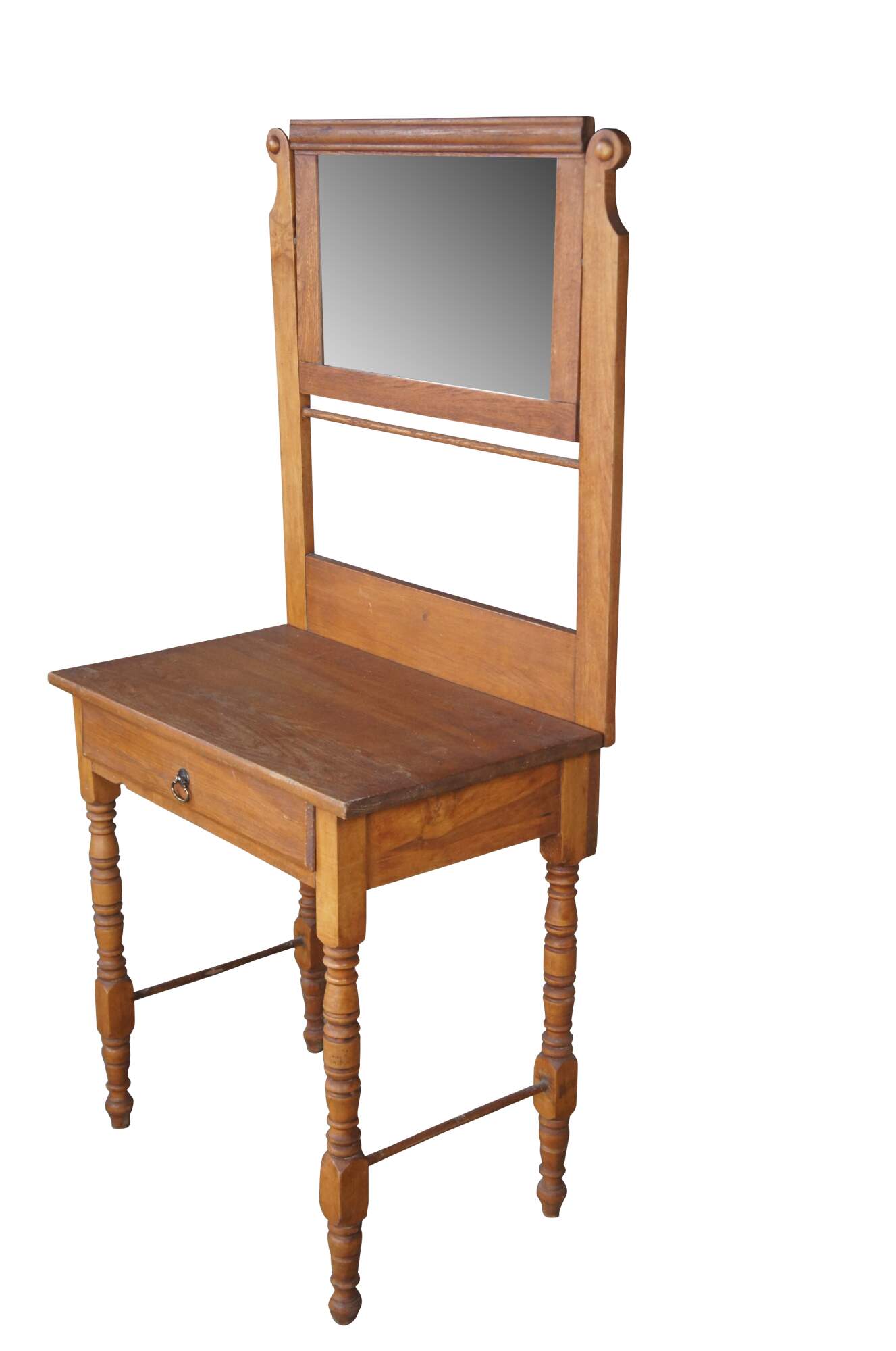 A quaint late Victorian washstand, circa 1900. Made from oak with a high back featuring a swivel mirror and towel bar. The base has one interior shelf with brass pull and is supported by turned legs.