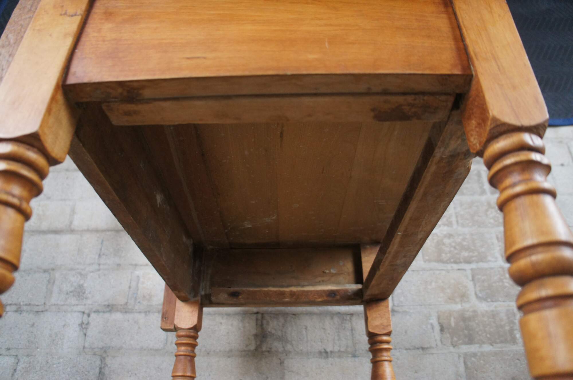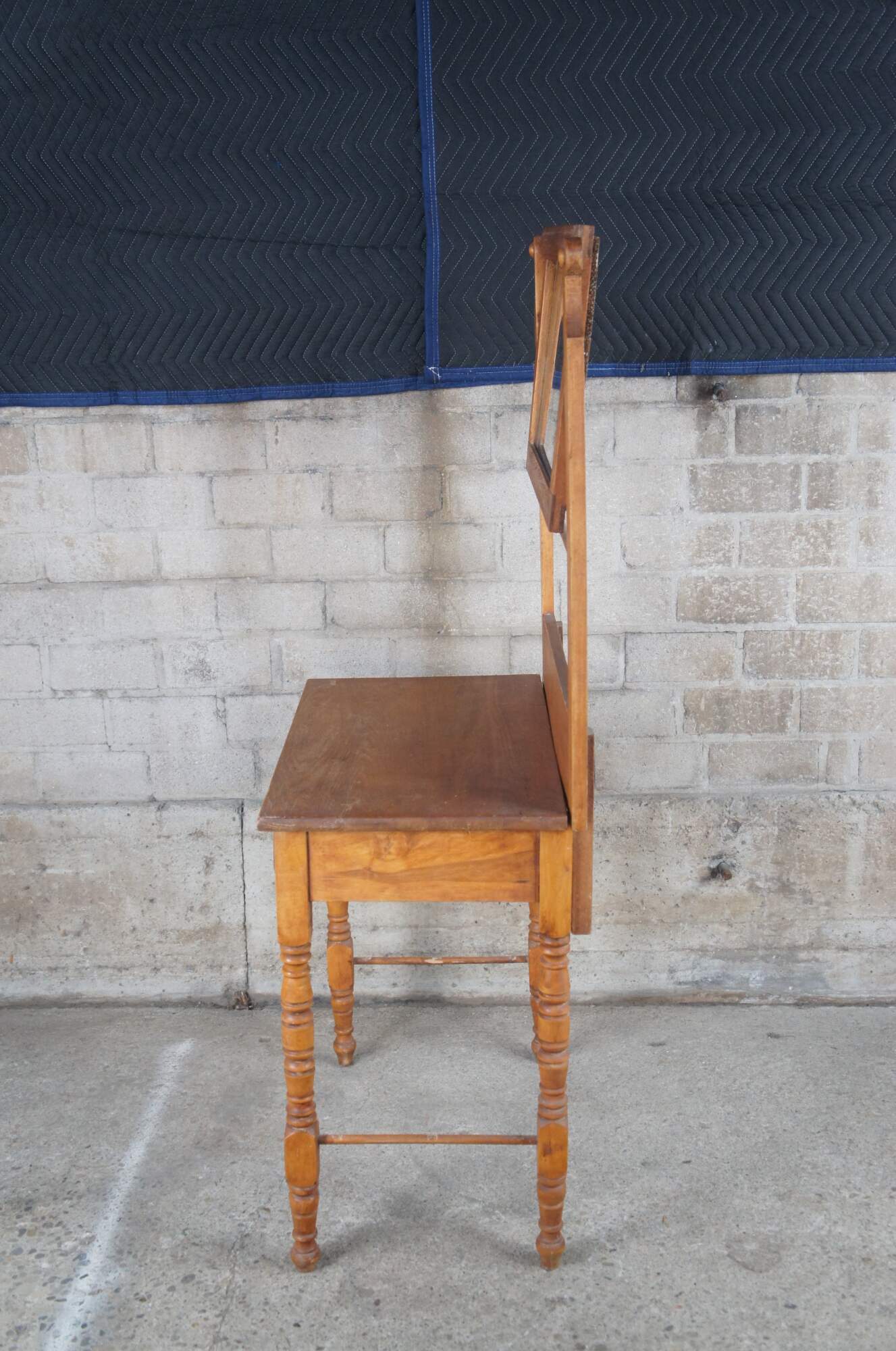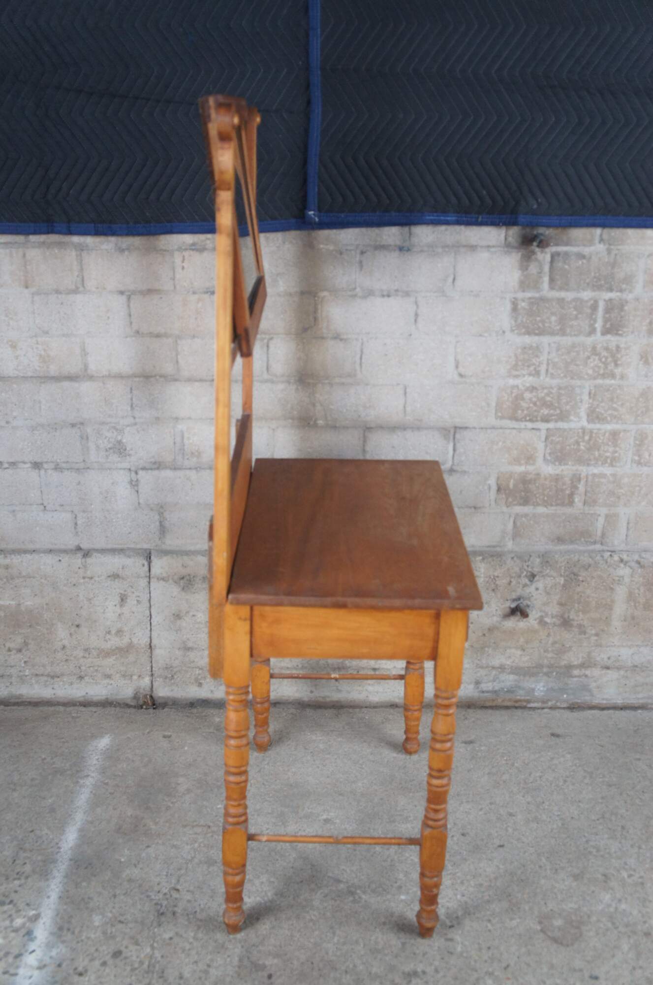 A quaint late Victorian washstand, circa 1900. Made from oak with a high back featuring a swivel mirror and towel bar. The base has one interior shelf with brass pull and is supported by turned legs.