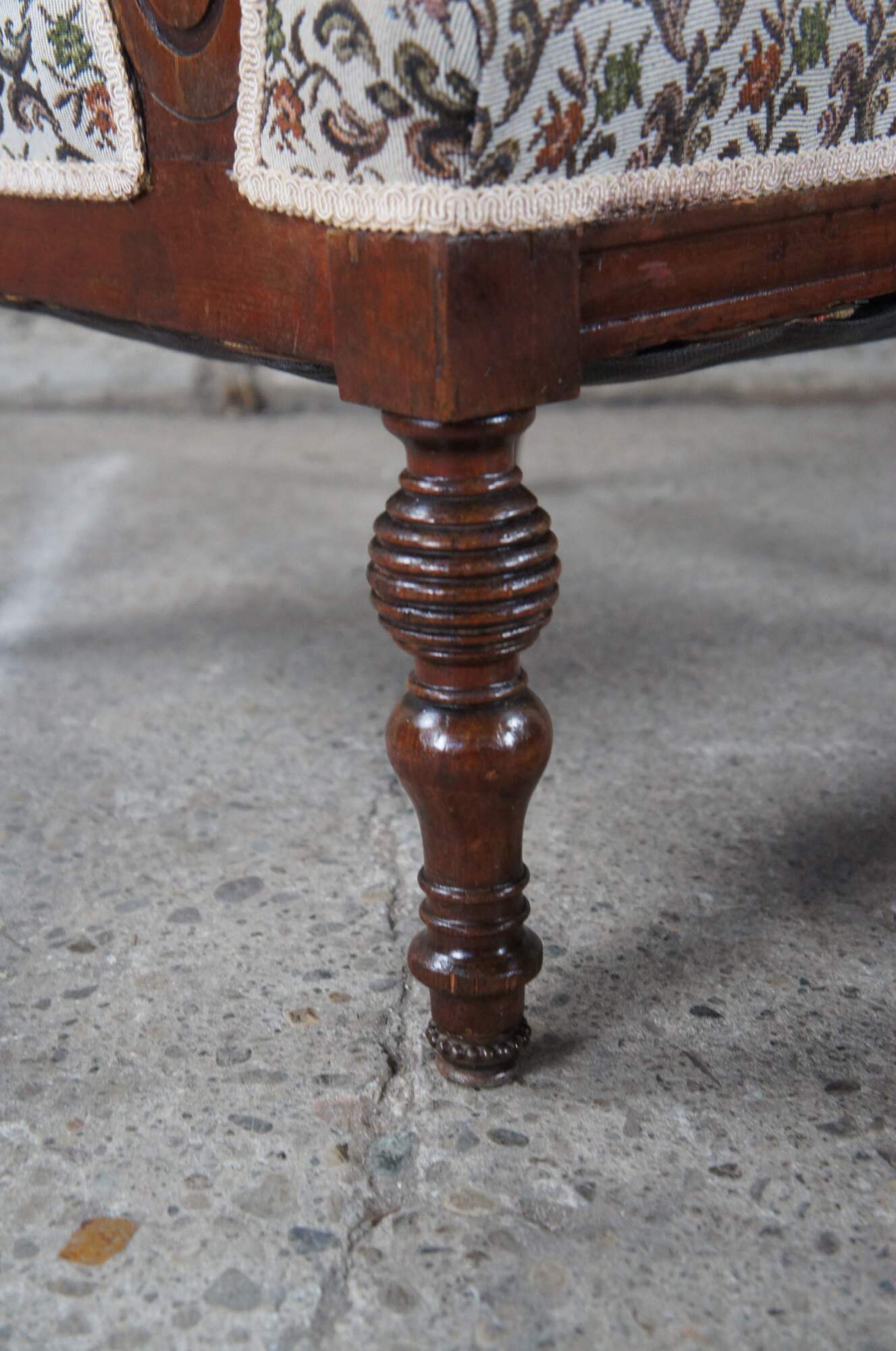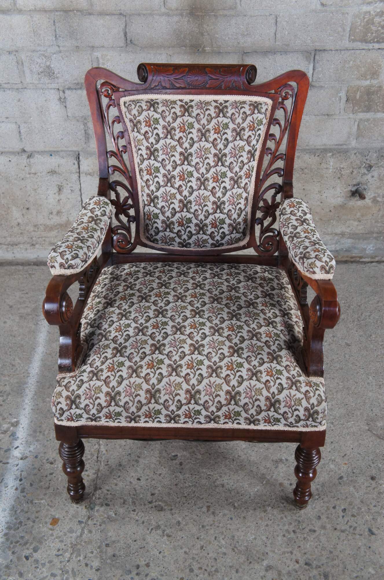 2 impressive Victorian era library, club or parlor arm chairs and ottomans. Made from mahogany with a pierced foliate back, downswept padded arms with accompanied S scroll supports, turned wheel medallions and geometric floral upholstery. Crest rail is scrolled and centered by a 20 petal chrysanthemum flanked by leaves on each side. The chair is supported by turned beehive legs along the front over a baluster turned arrow foot and square legs at the rear.