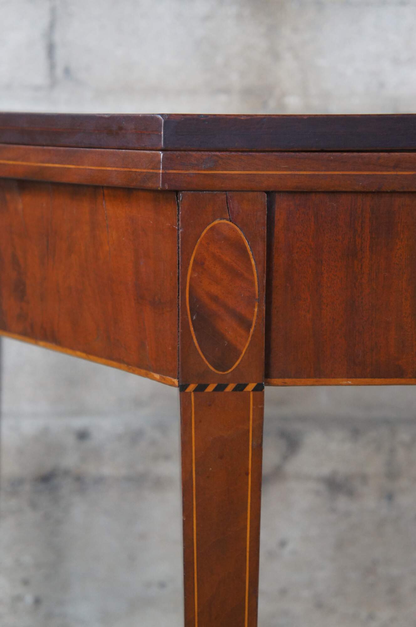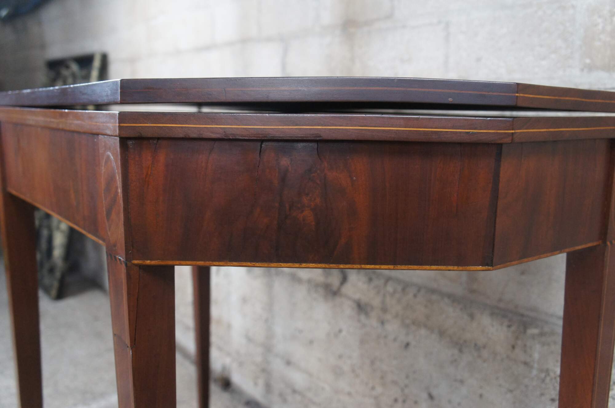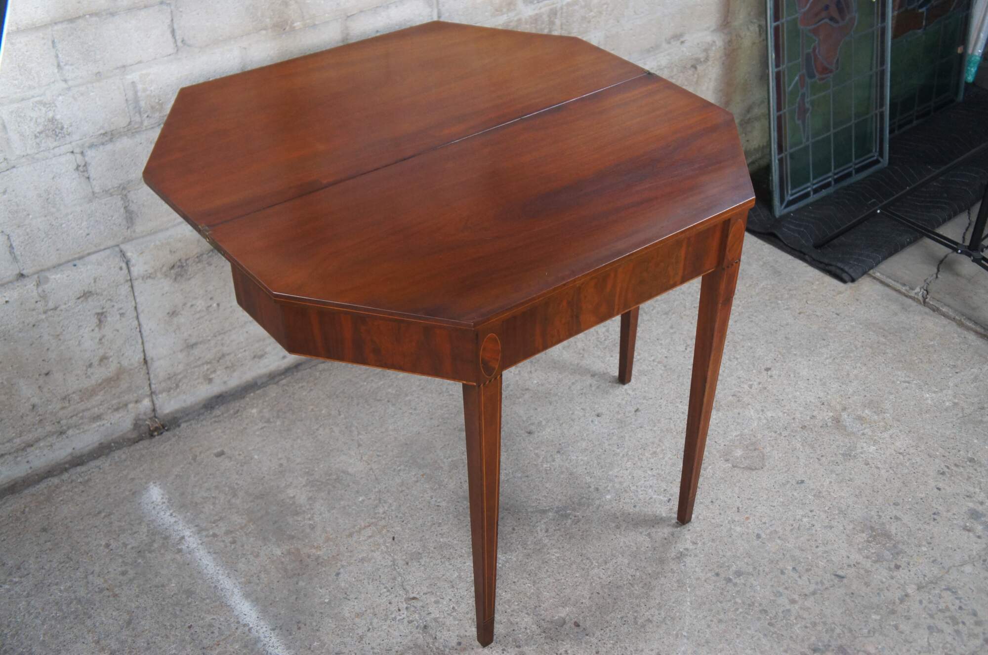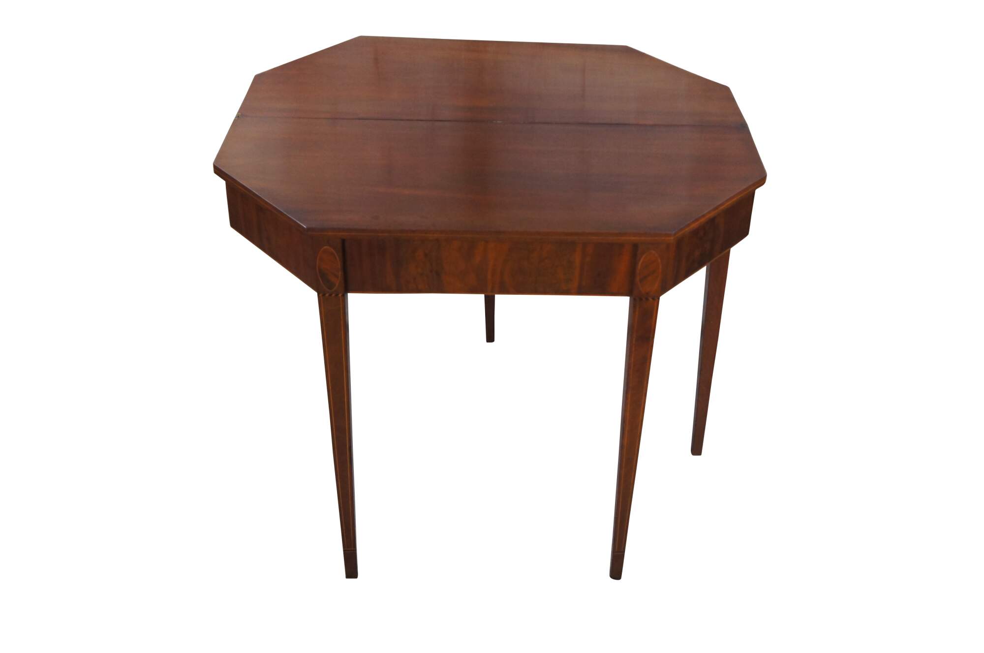 Antique Sheraton period card or game table, circa 1790-1820. Made from mahogany with crotch mahogany veneer, featuring an inlaid flip top octagonal demilune top supported by square tapered legs. Each leg showcases oval inlay over striping and stringing inlay. Once expanded the table is supported by the fourth leg which swings behind to hold the top.