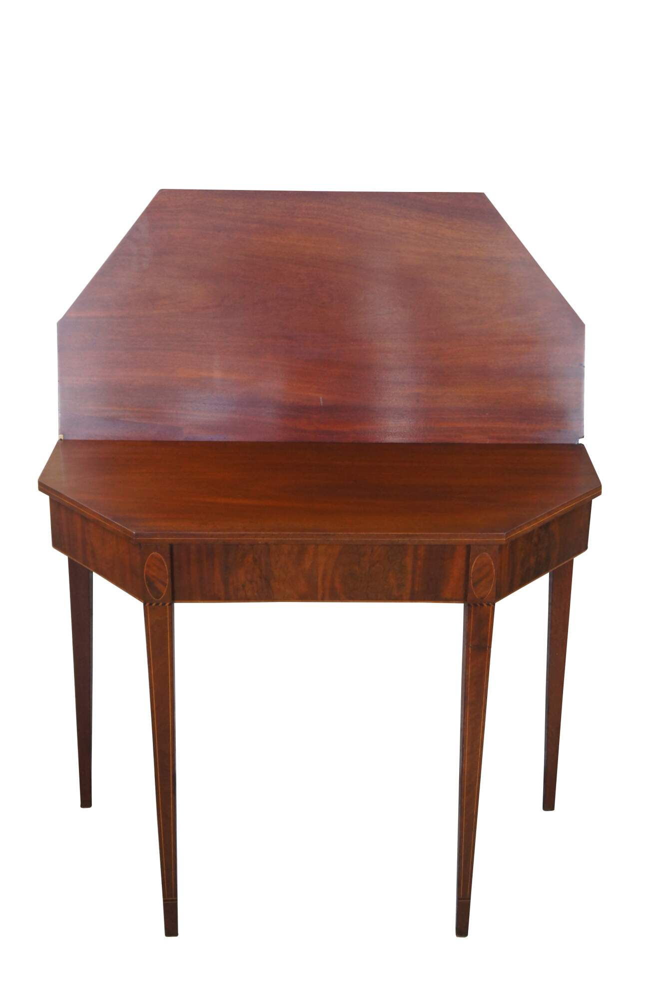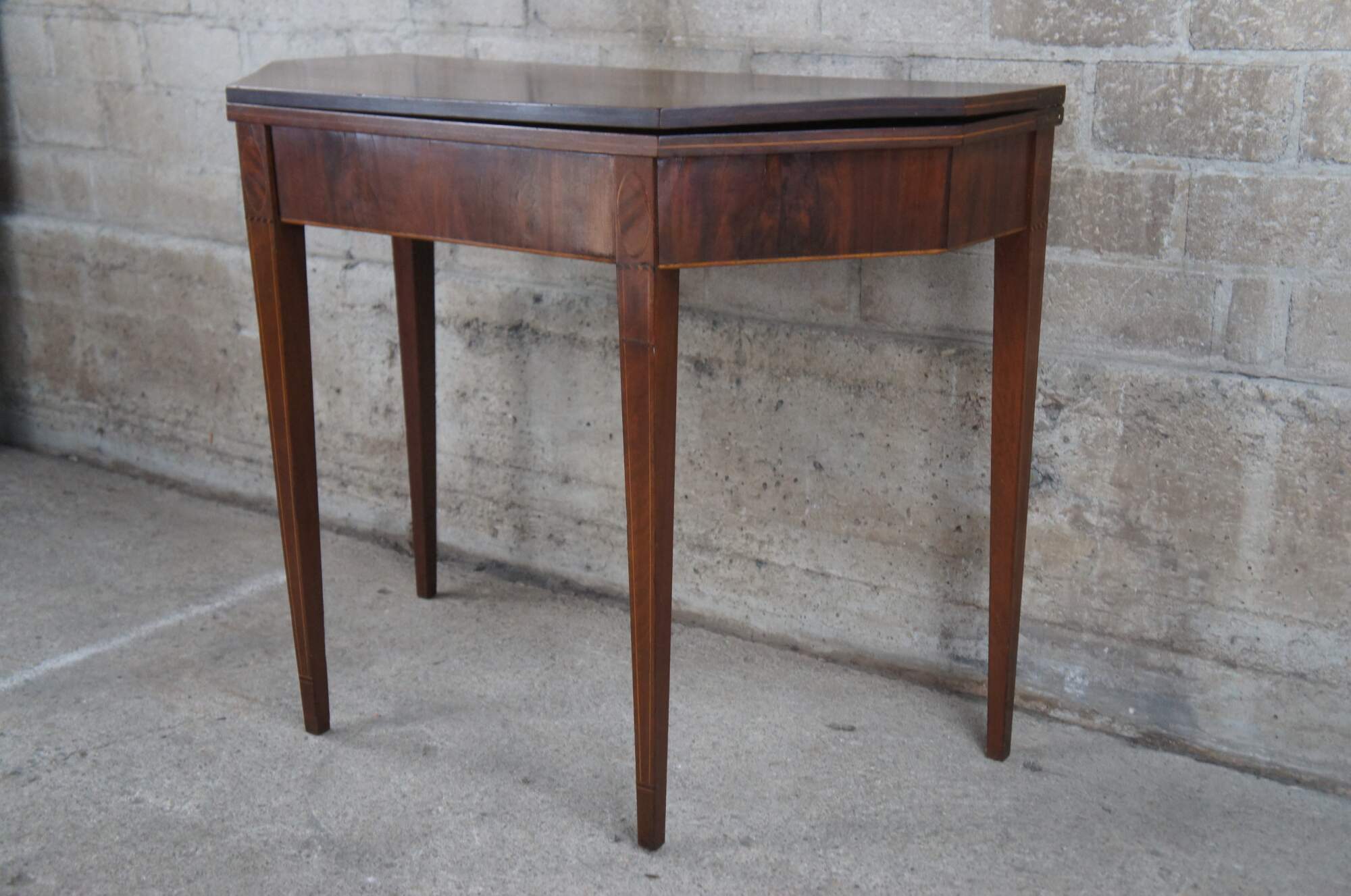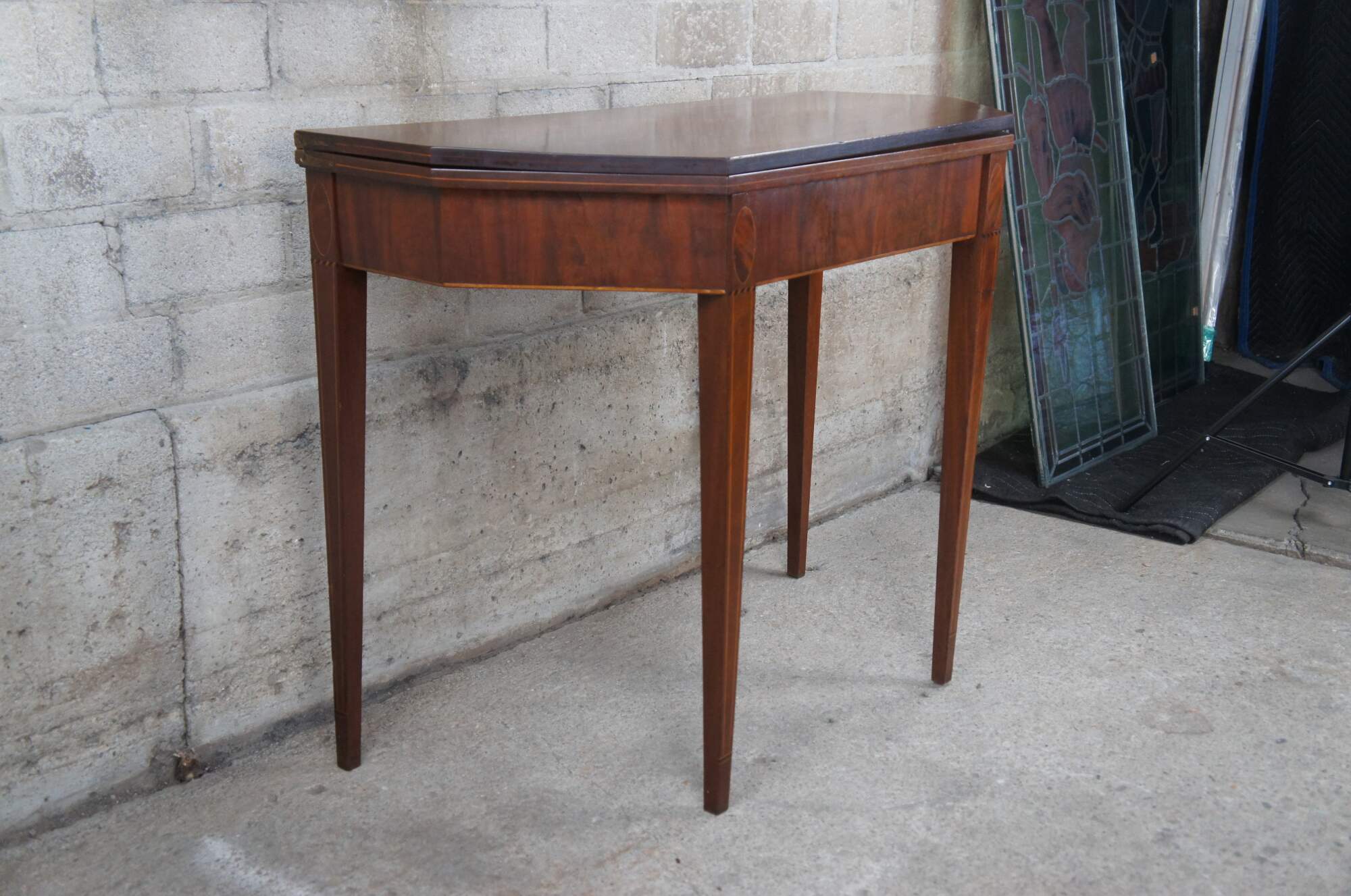 Antique Sheraton period card or game table, circa 1790-1820. Made from mahogany with crotch mahogany veneer, featuring an inlaid flip top octagonal demilune top supported by square tapered legs. Each leg showcases oval inlay over striping and stringing inlay. Once expanded the table is supported by the fourth leg which swings behind to hold the top.