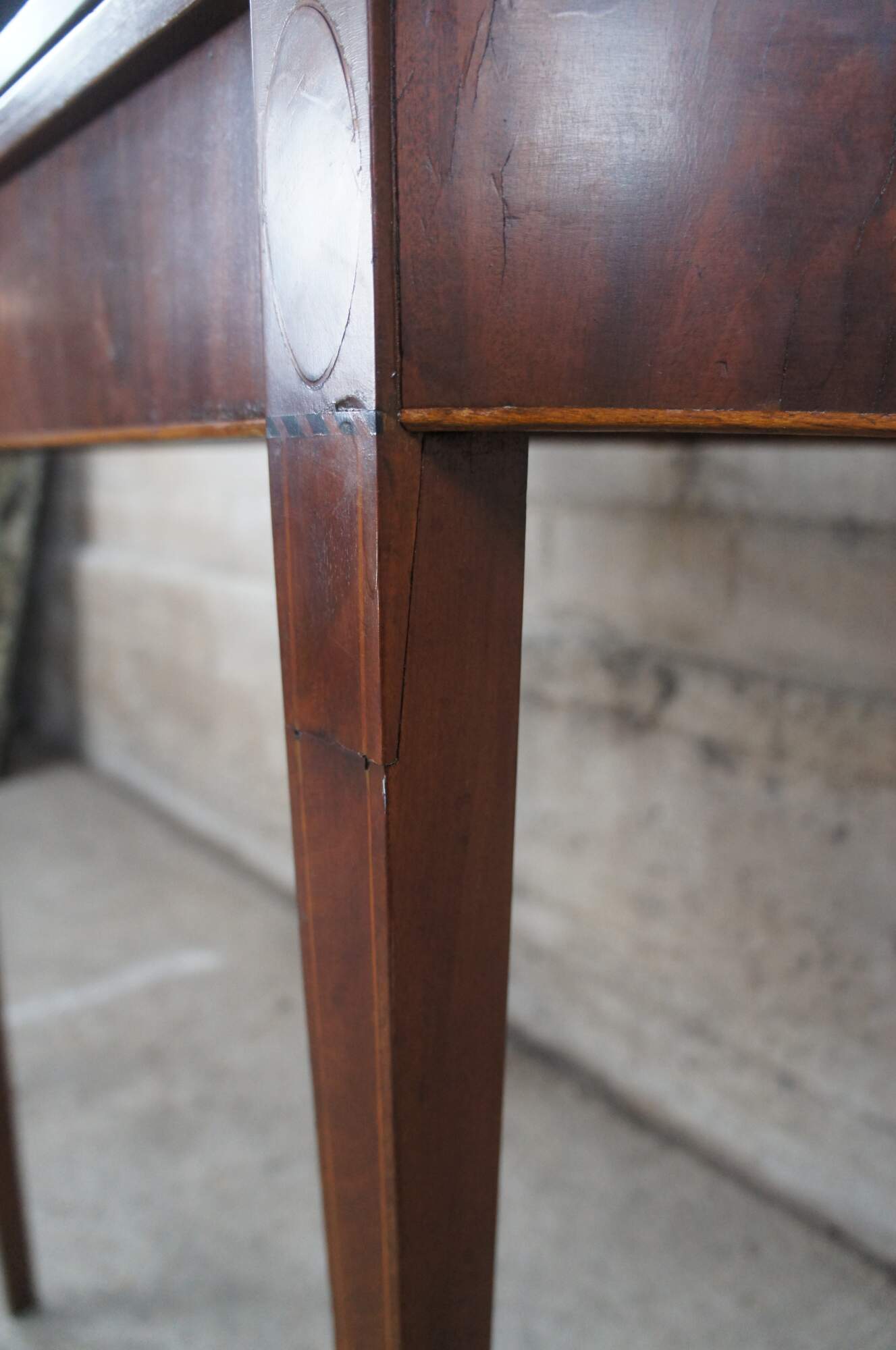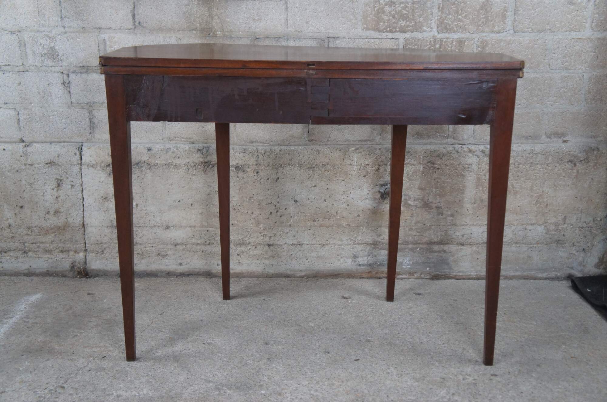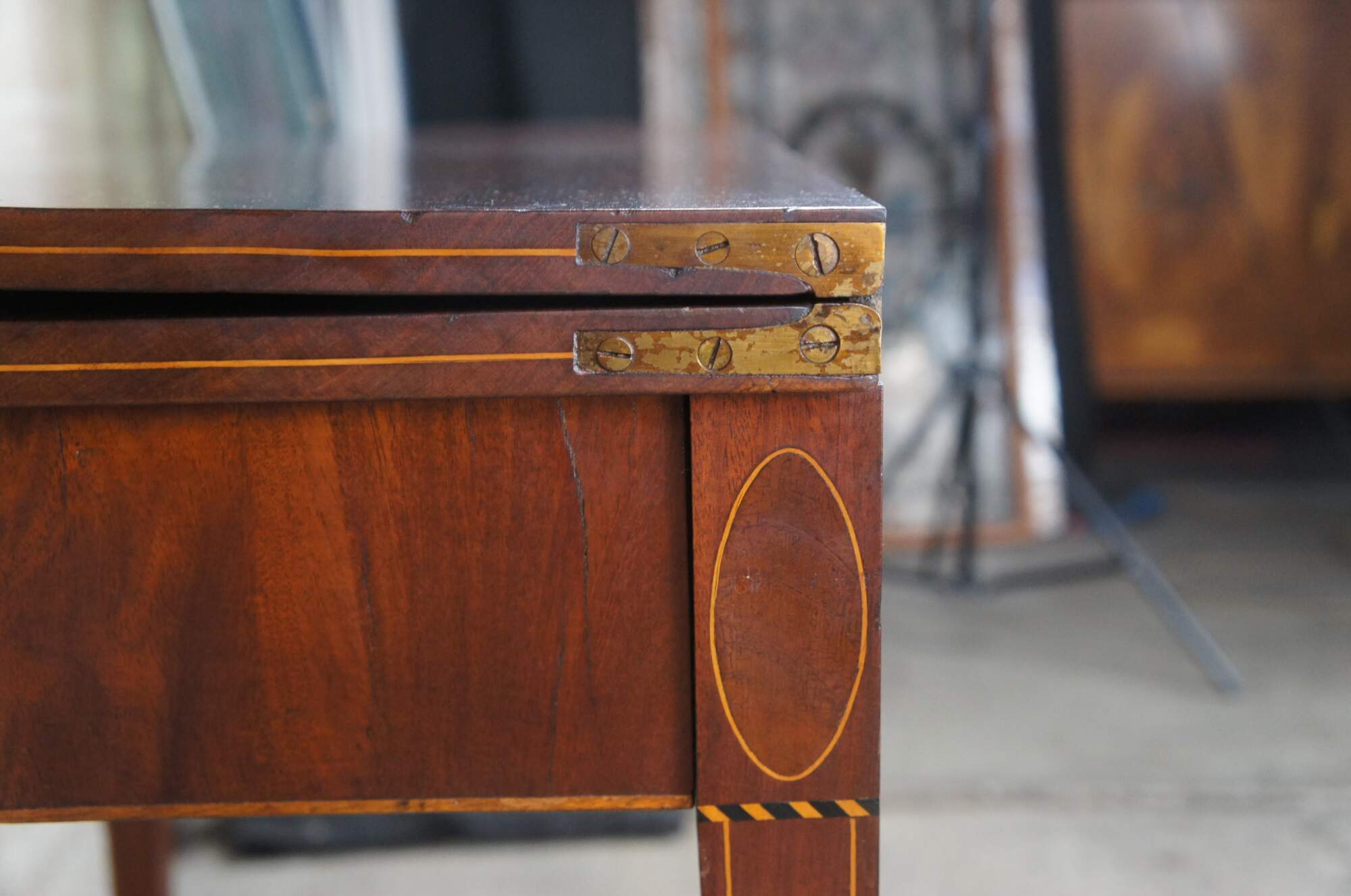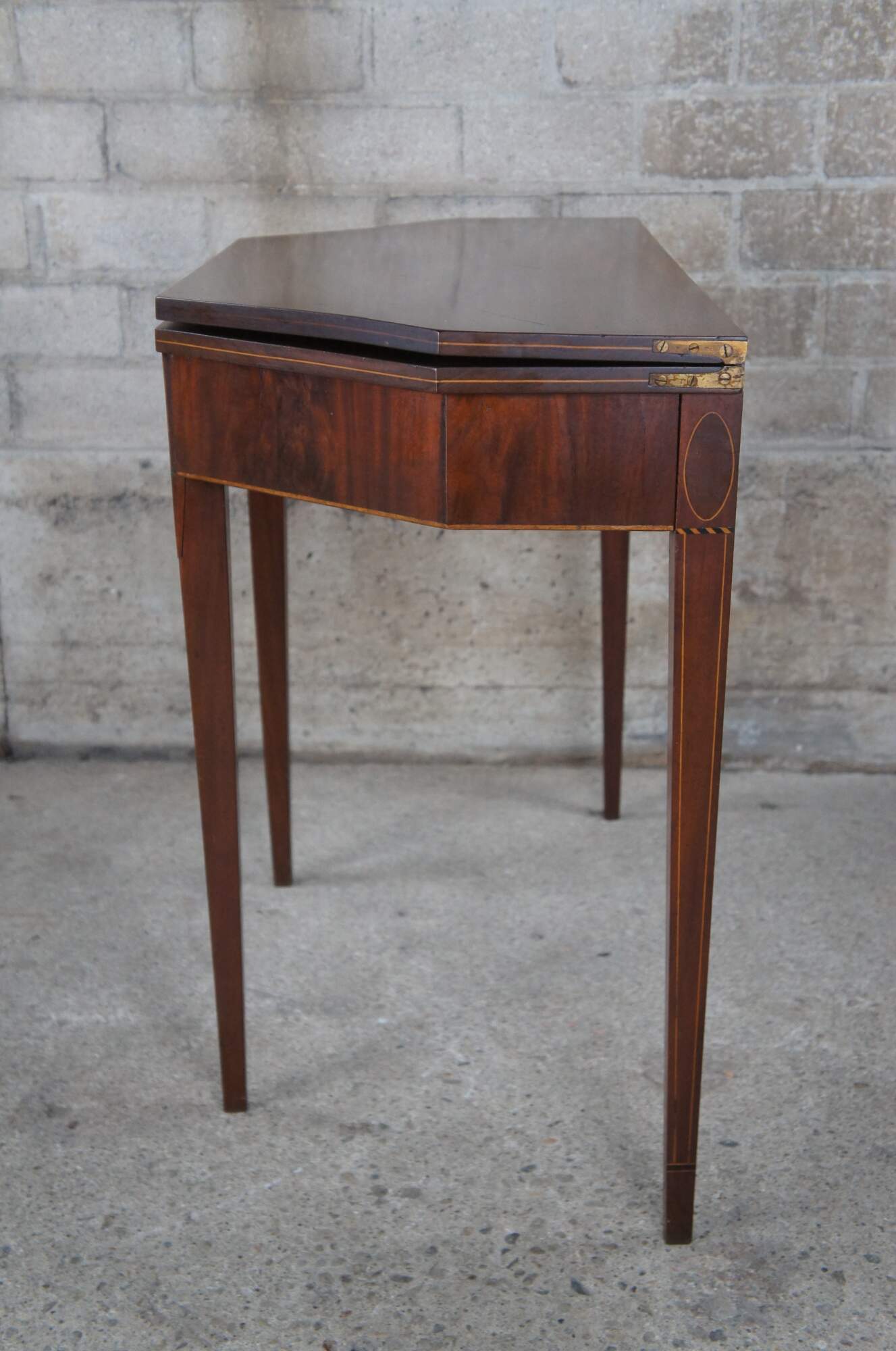 Antique Sheraton period card or game table, circa 1790-1820. Made from mahogany with crotch mahogany veneer, featuring an inlaid flip top octagonal demilune top supported by square tapered legs. Each leg showcases oval inlay over striping and stringing inlay. Once expanded the table is supported by the fourth leg which swings behind to hold the top.