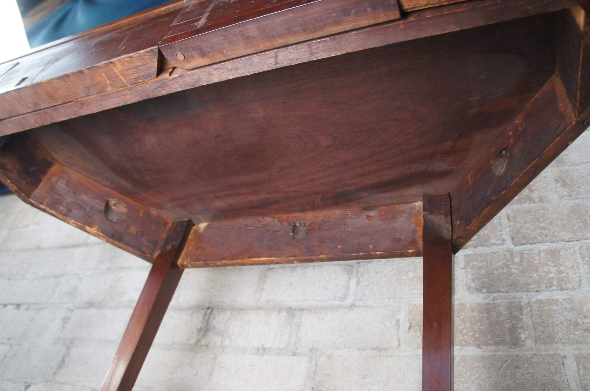 Fair condition, wear and distressing commensurate with age and use, warping to top, fading, splitting, past repairs, at some point hinges moved from mid point of table to outside edges, allowing for a smooth surface.