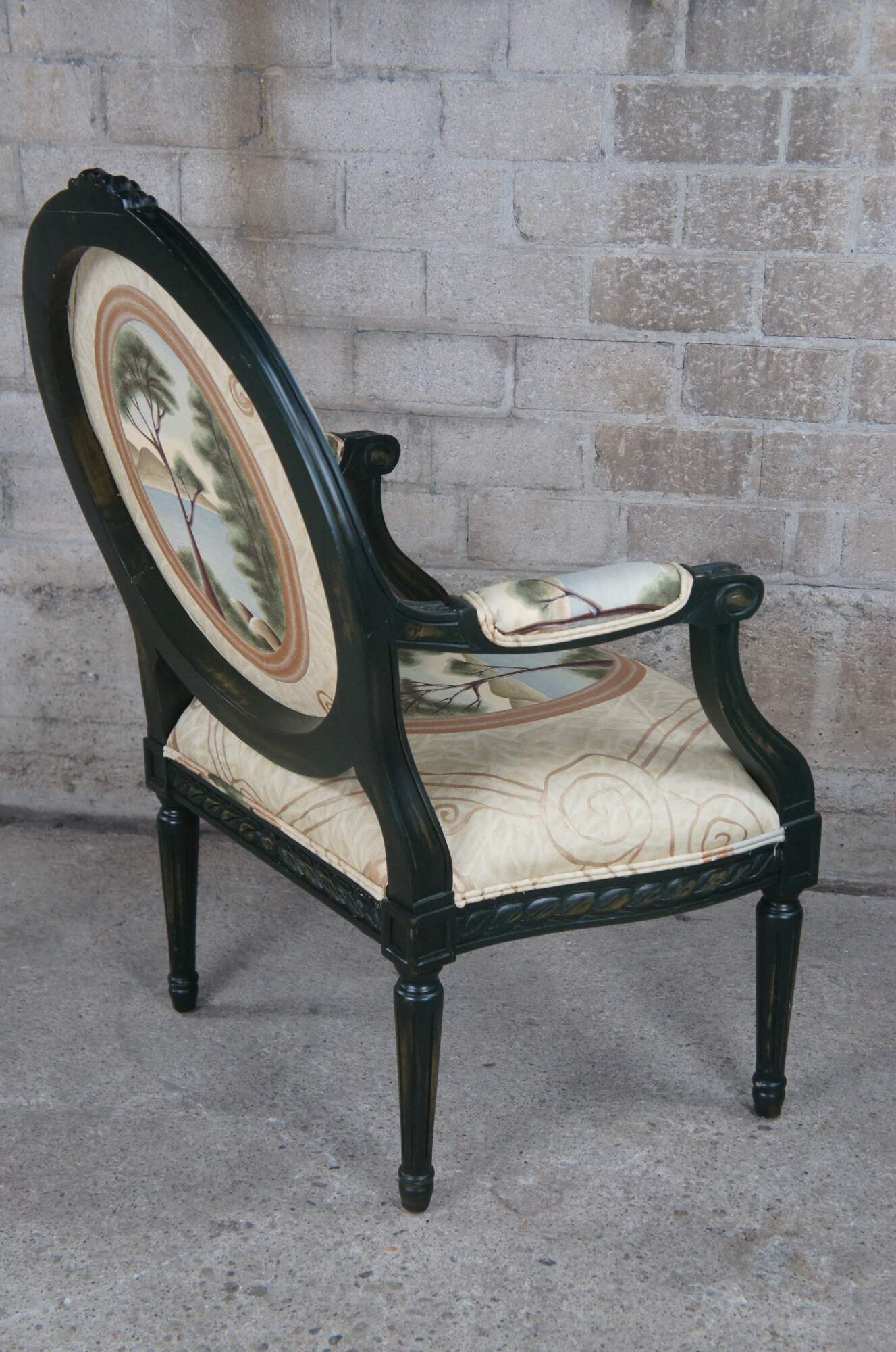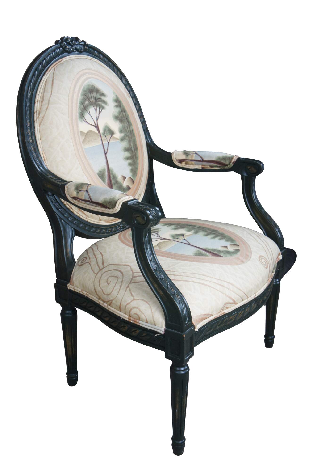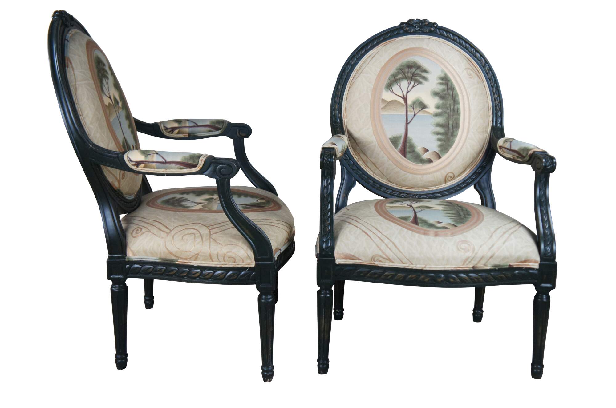 Two vintage Drexel Heritage fauteuil armchairs with French Louis XVI / Neoclassical styling that features an ebonized frame with balloon back ribbon accent, scenic cameo ocean landscape / seascape upholstery and fluted tapered legs. H1350, 8257.