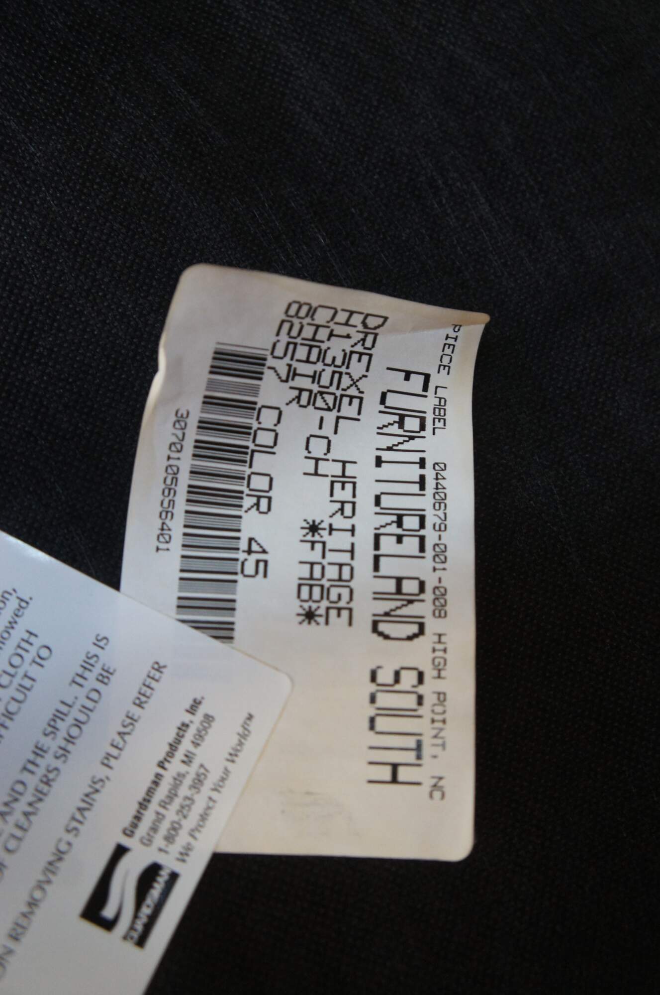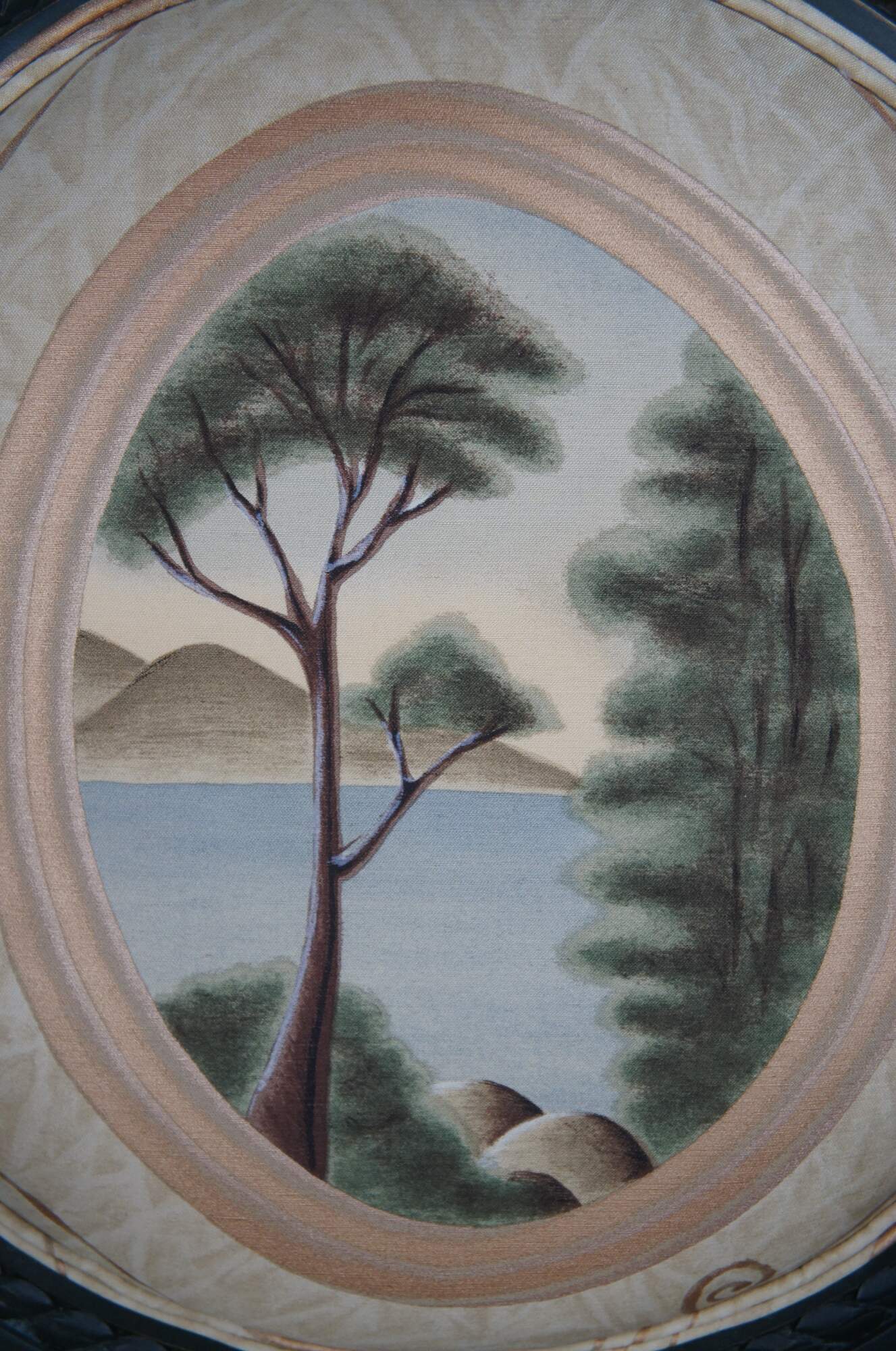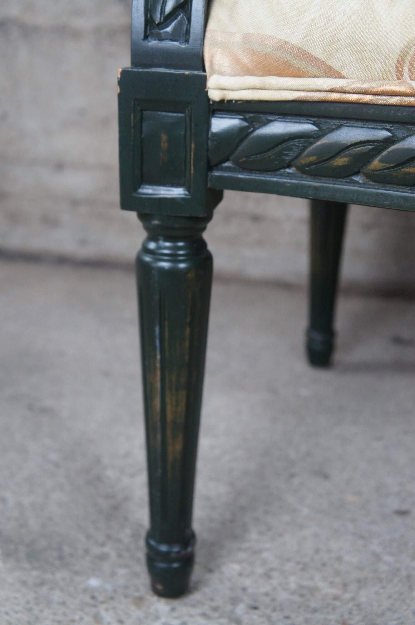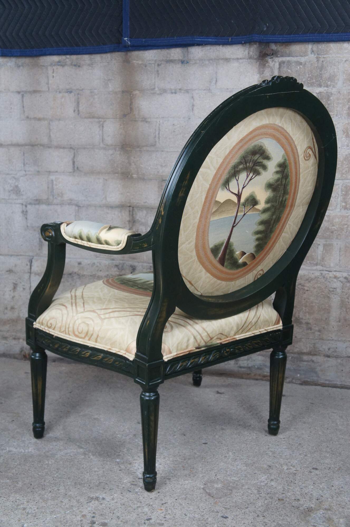 Two vintage Drexel Heritage fauteuil armchairs with French Louis XVI / Neoclassical styling that features an ebonized frame with balloon back ribbon accent, scenic cameo ocean landscape / seascape upholstery and fluted tapered legs. H1350, 8257.