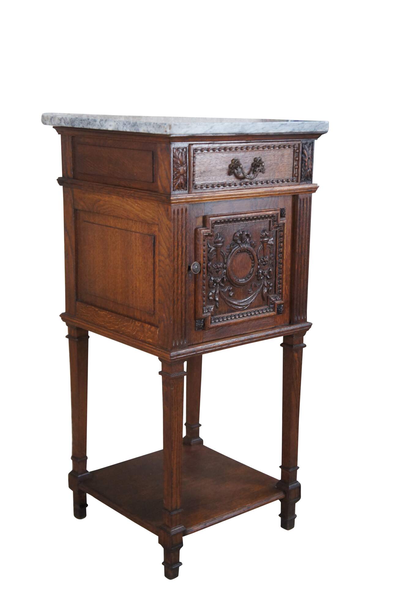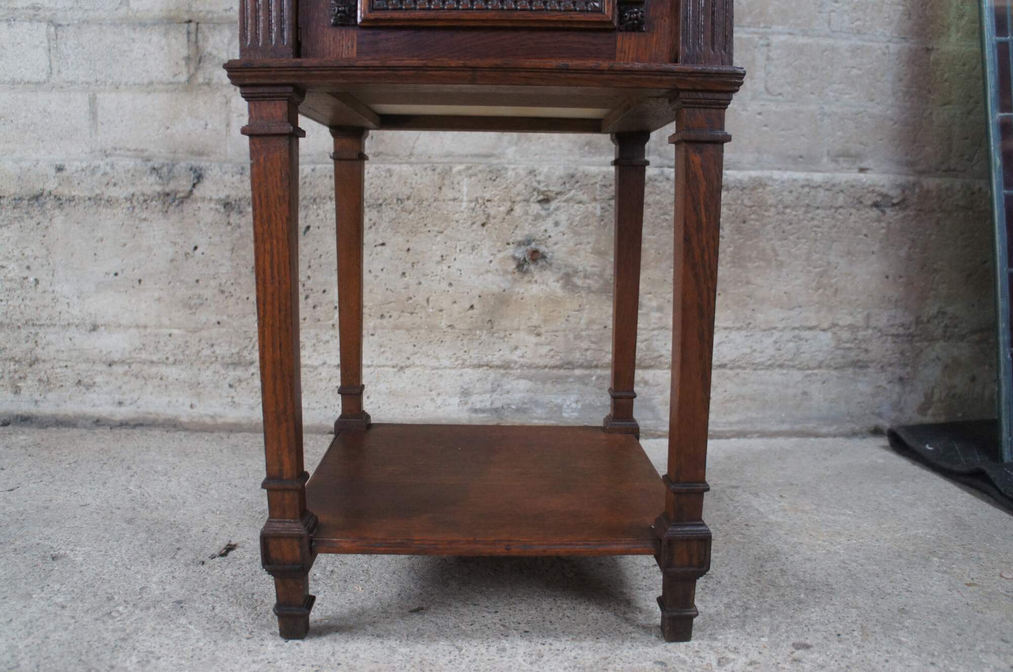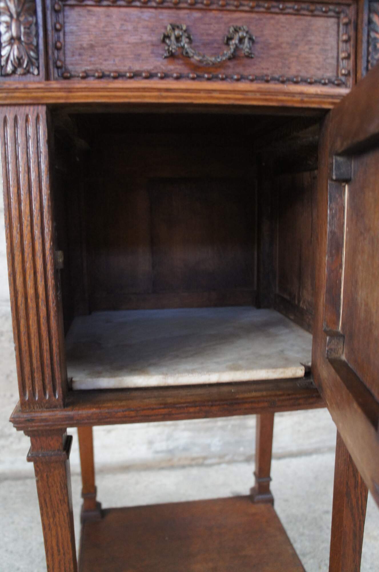 Two antique French tobacco humidor / smoke stands. Made of quartersawn oak featuring a two tiered design with marble top and paneled Neoclassical torchiere / ribbon theme door.